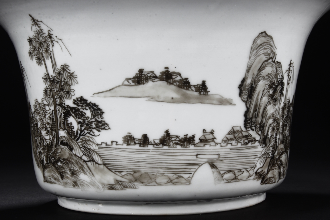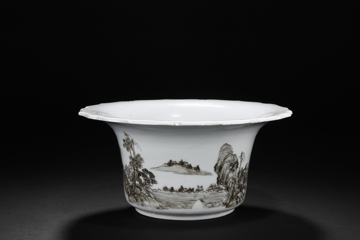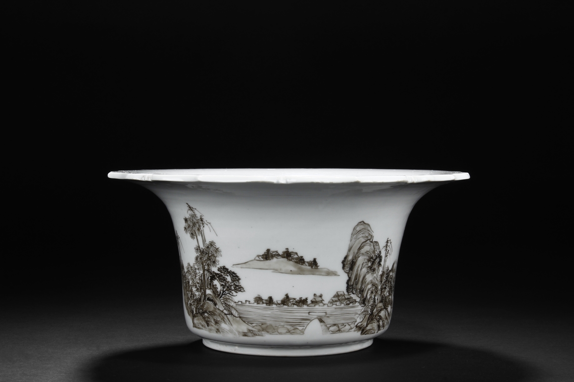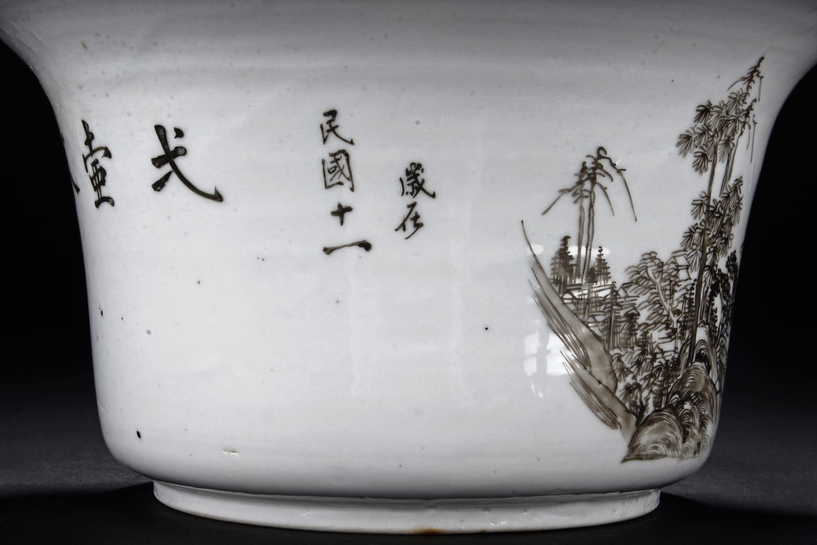 The planter has a large everted and flaring floriform rim, tapers sharply to a cylindrical body, painted with grisaille landscape scenery with colophon on the back. Early Republic period.