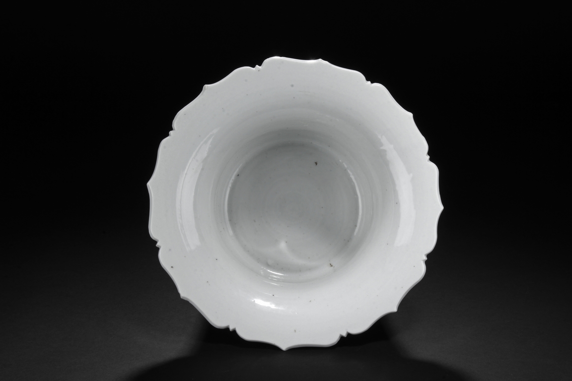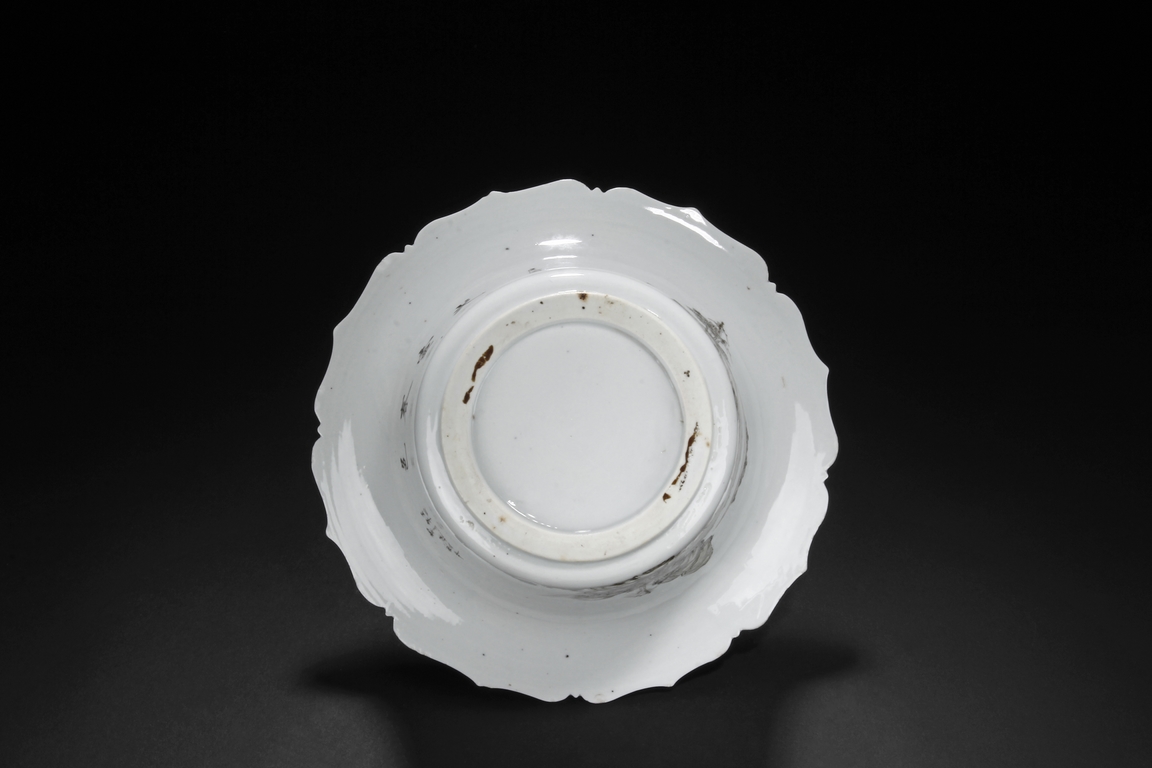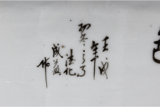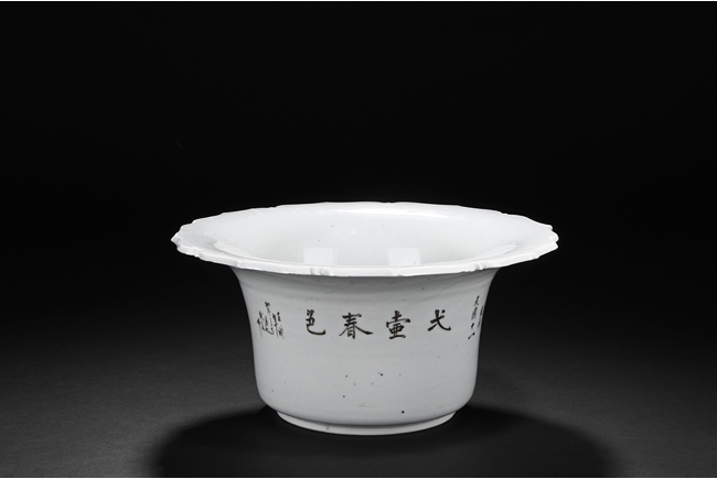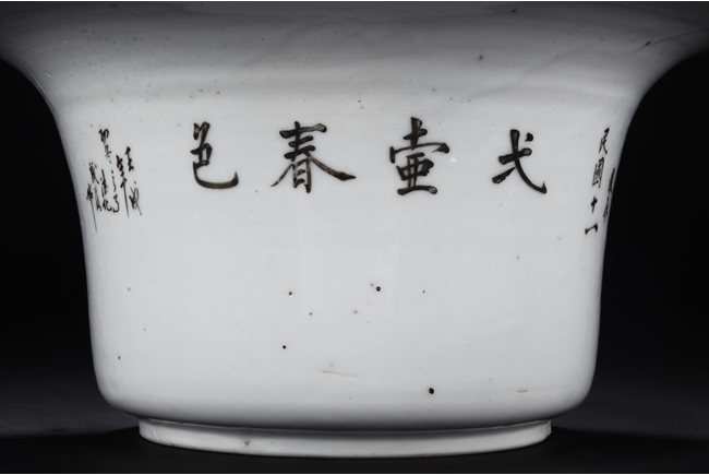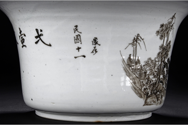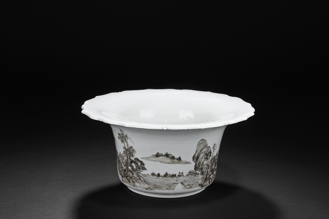 The planter has a large everted and flaring floriform rim, tapers sharply to a cylindrical body, painted with grisaille landscape scenery with colophon on the back. Early Republic period.
