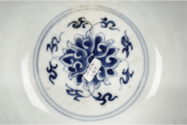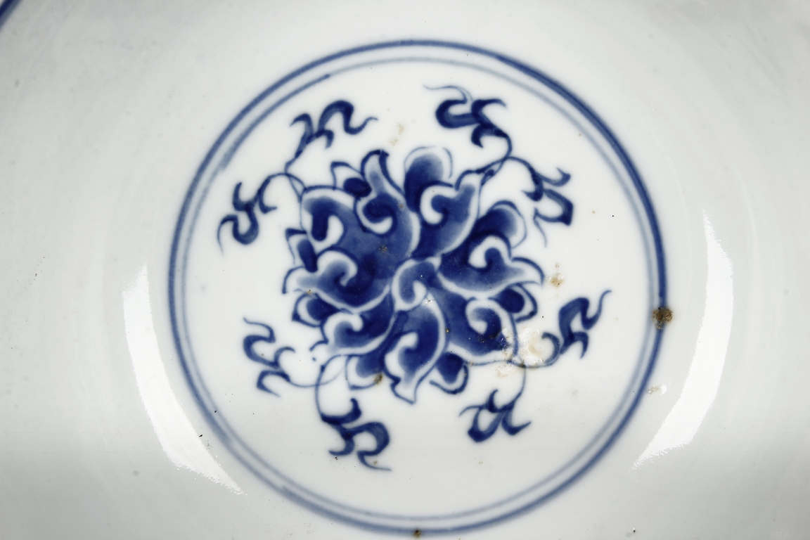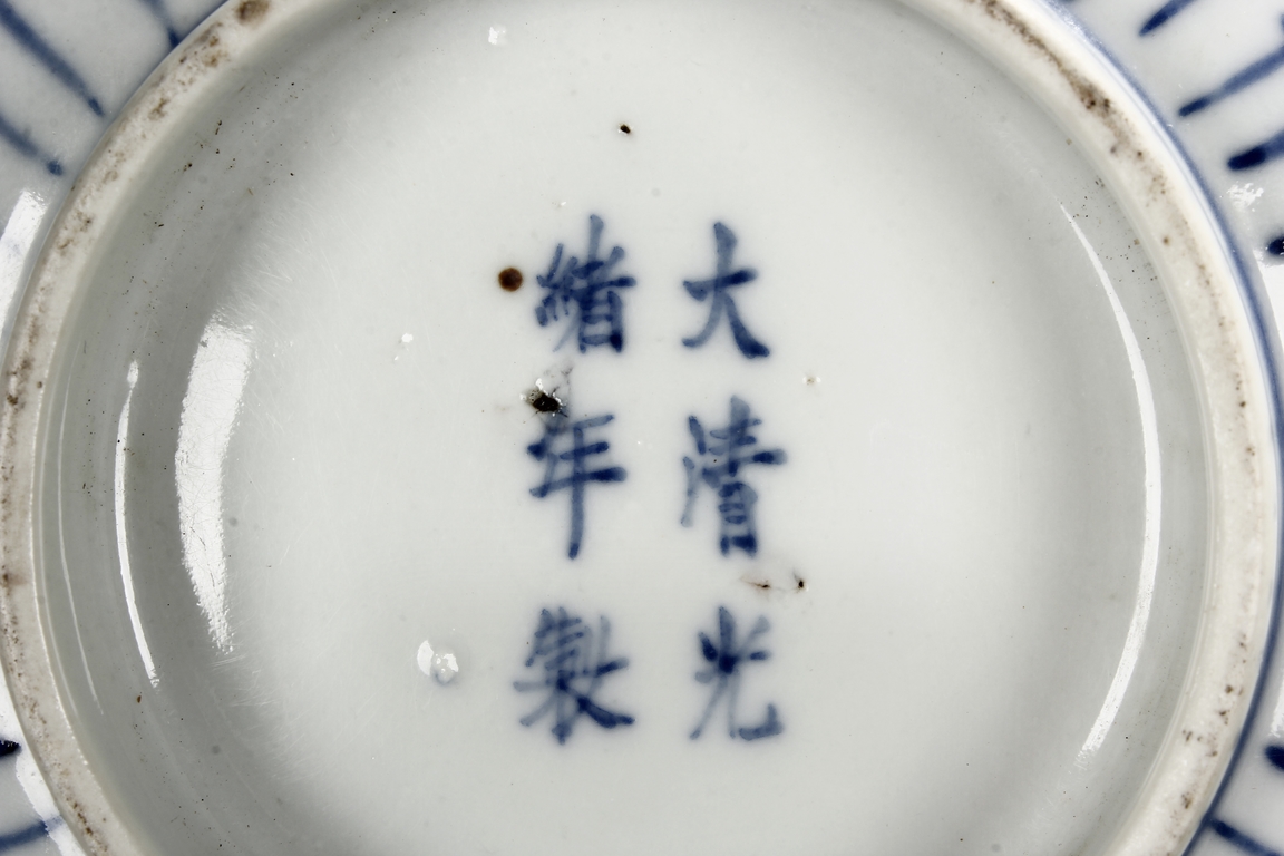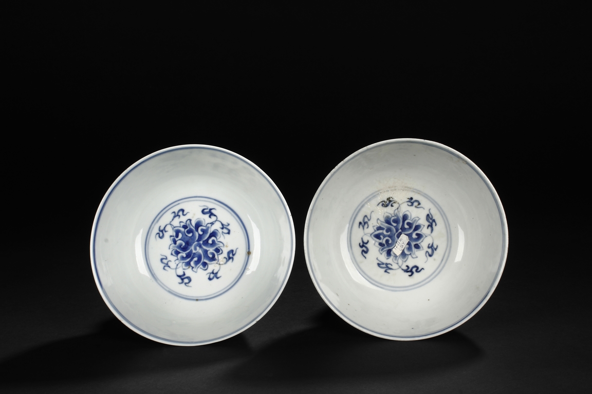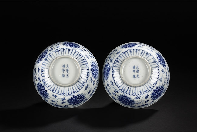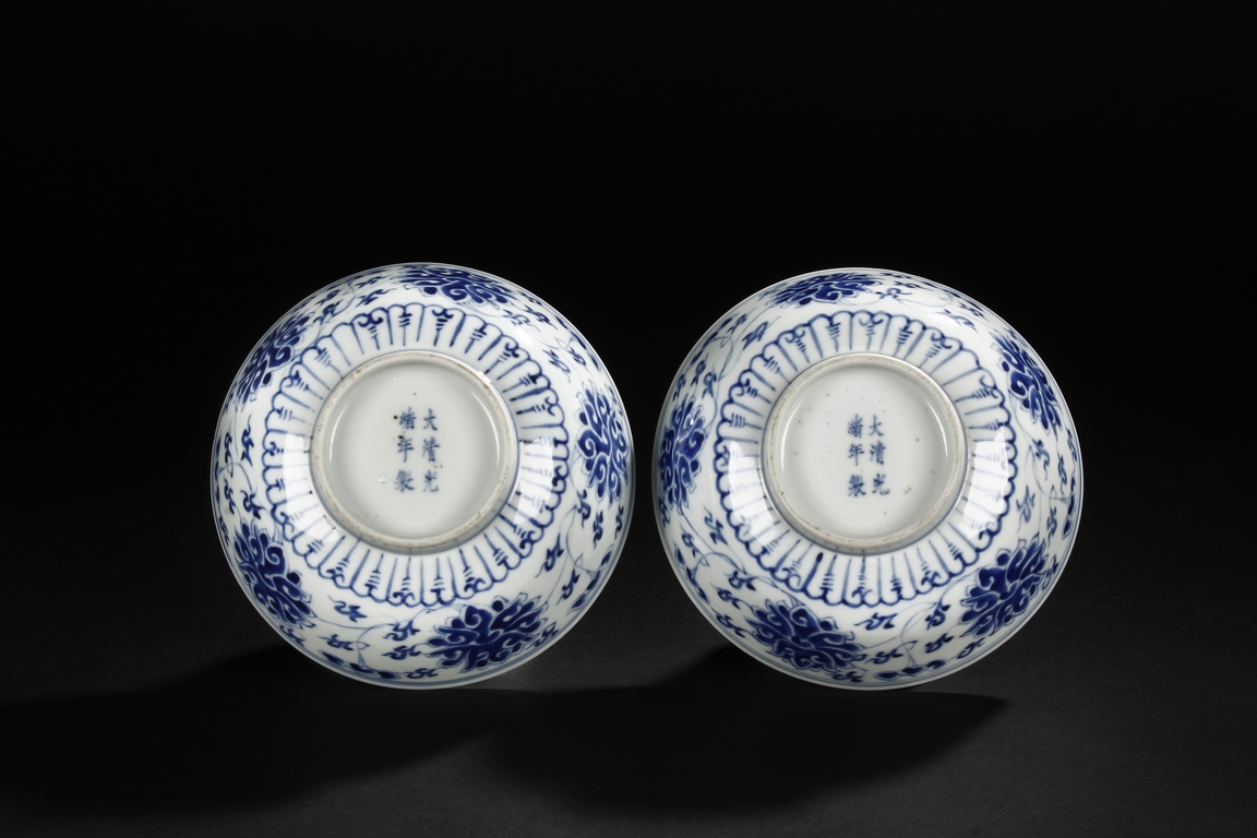 Each bowl is finely decorated on the exterior with a continuous design of foliage scroll, all between a double-lined rim border and lotus petals. The center of interior is decorated with a medallion enclosing a foliage motif. The bottom bears six character 'GUANGXU' mark. Late Qing Dynasty period.