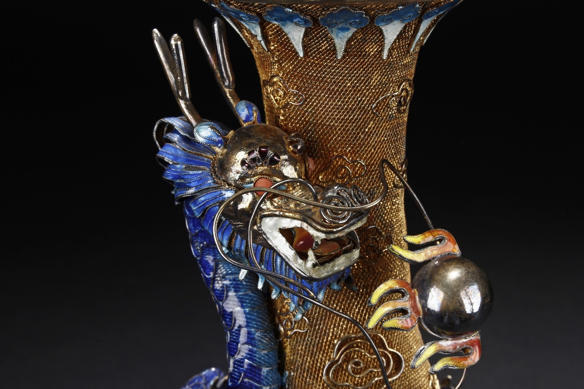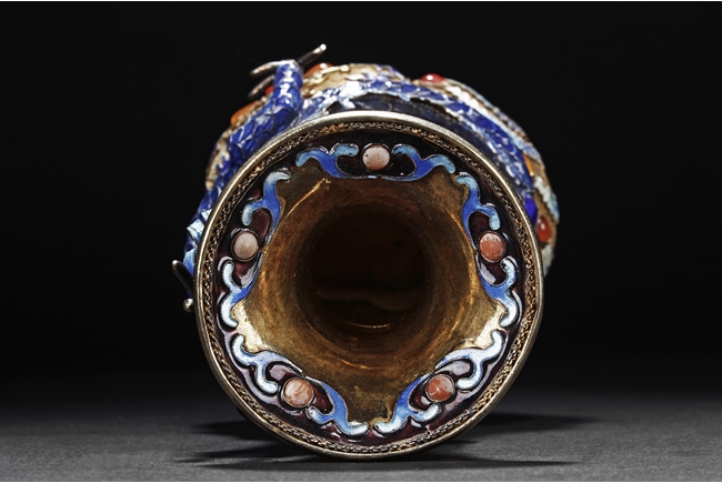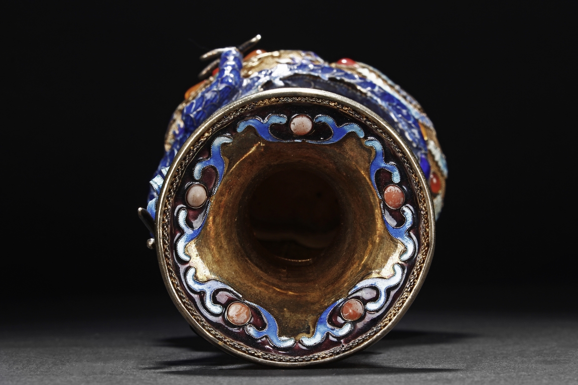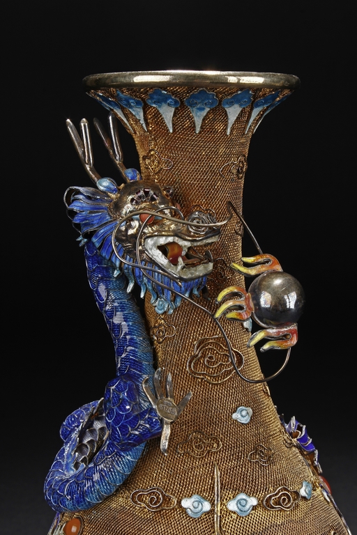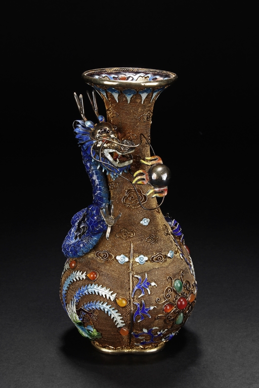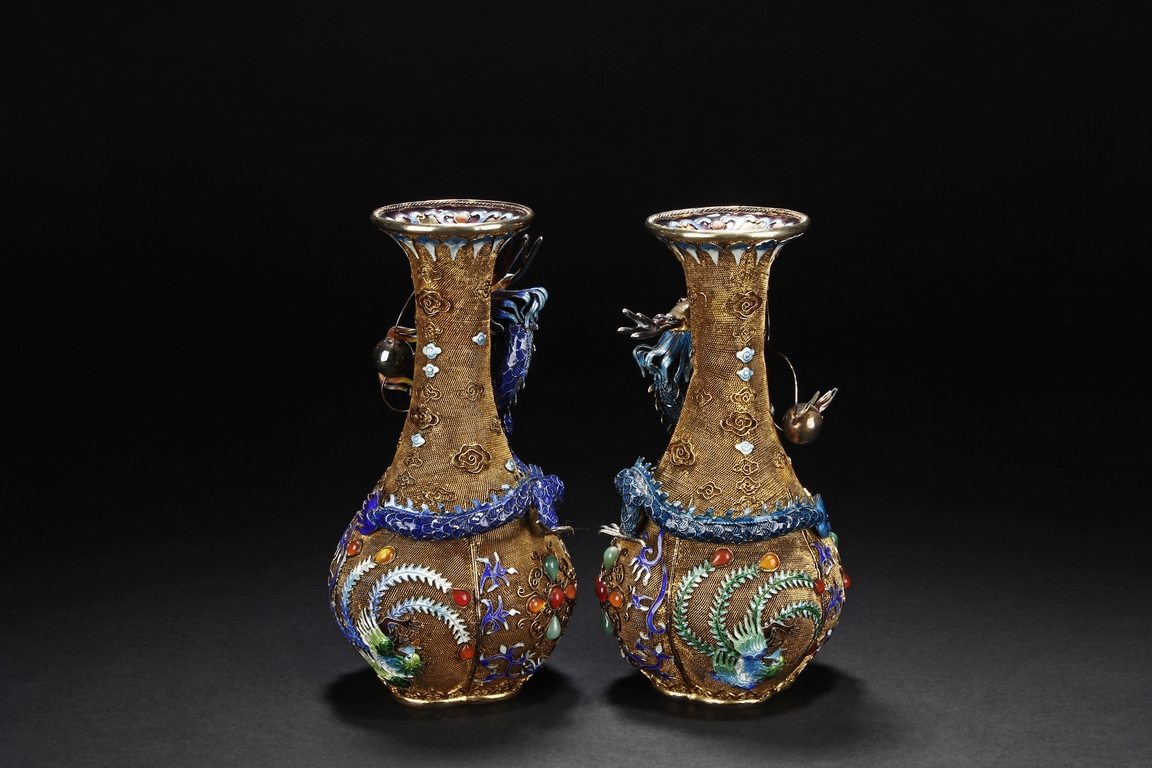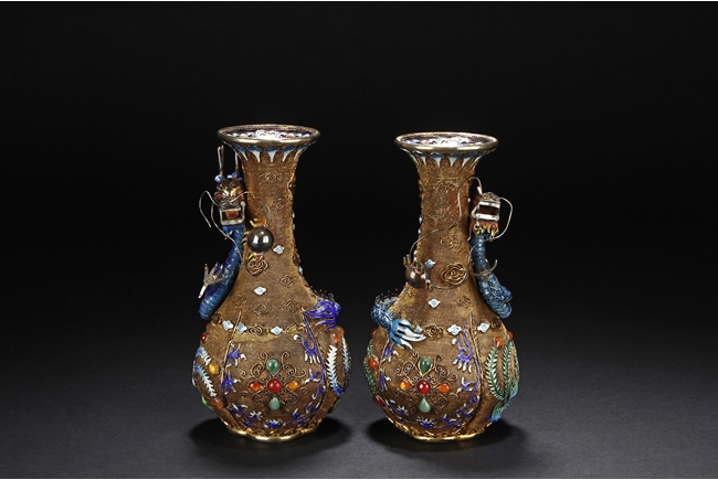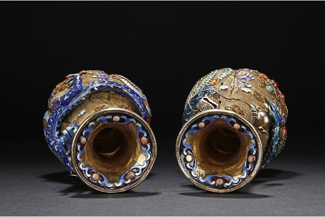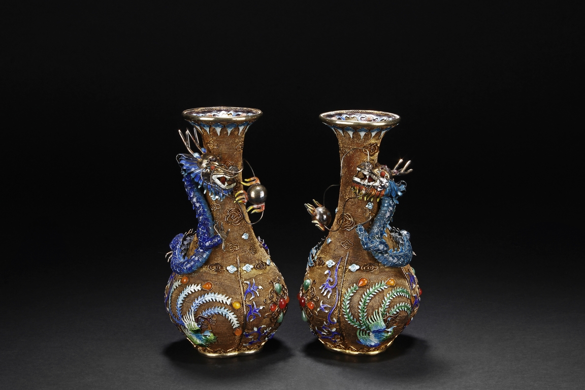 The vases are of pear form, each with a dragon swirling around the vase, clinging to the neck and body, decorated with semi-precious gems, the claw marked "SILVER".