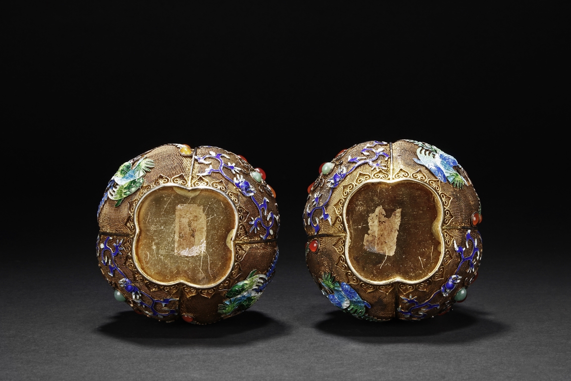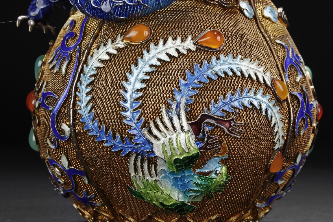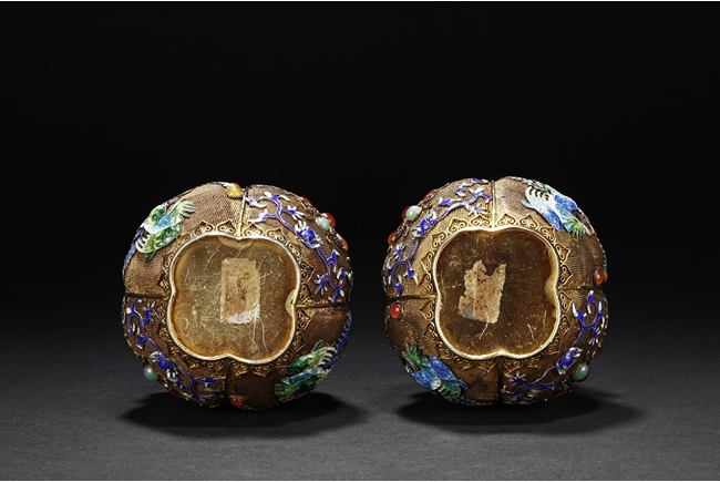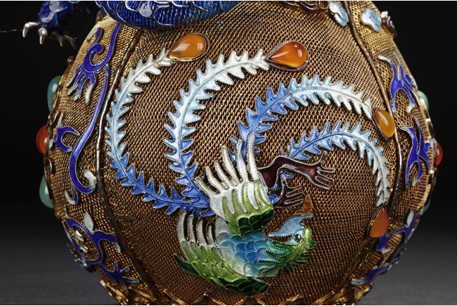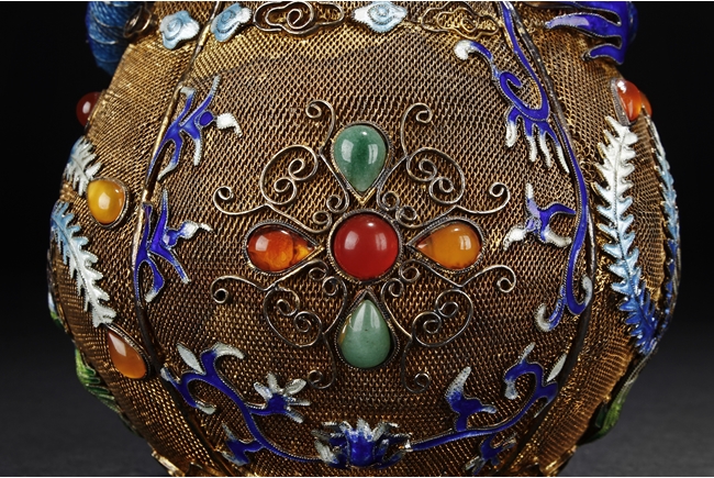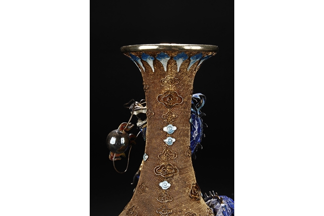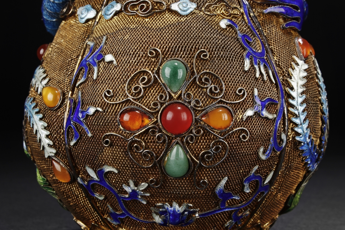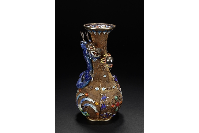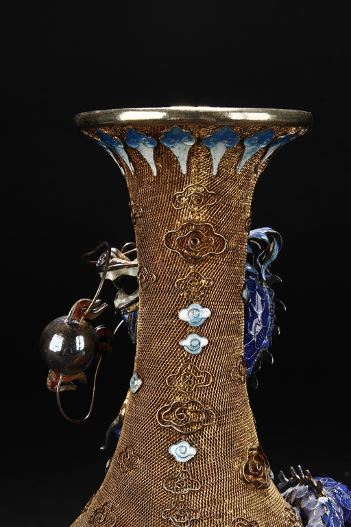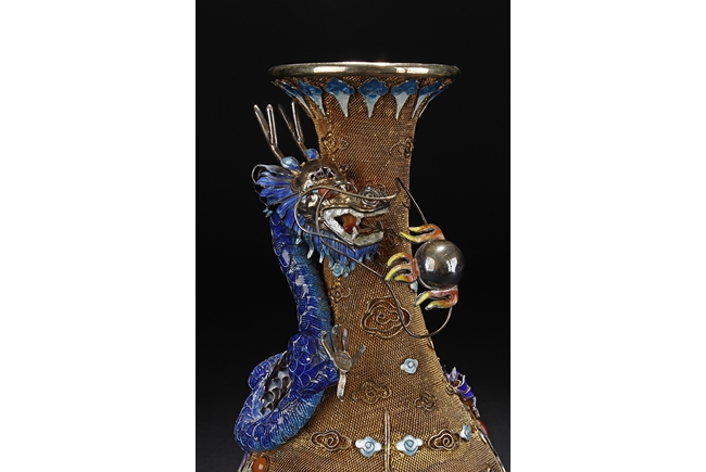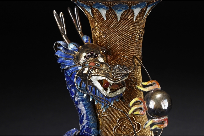The vases are of pear form, each with a dragon swirling around the vase, clinging to the neck and body, decorated with semi-precious gems, the claw marked "SILVER".