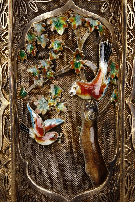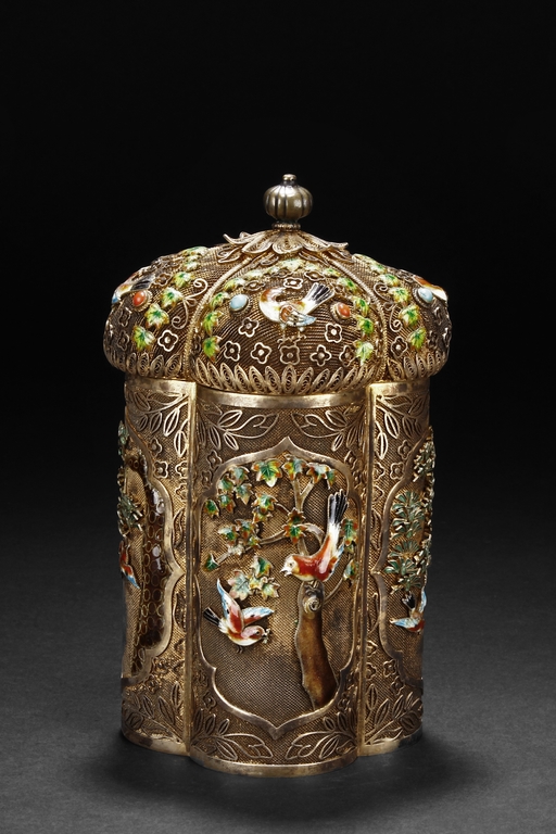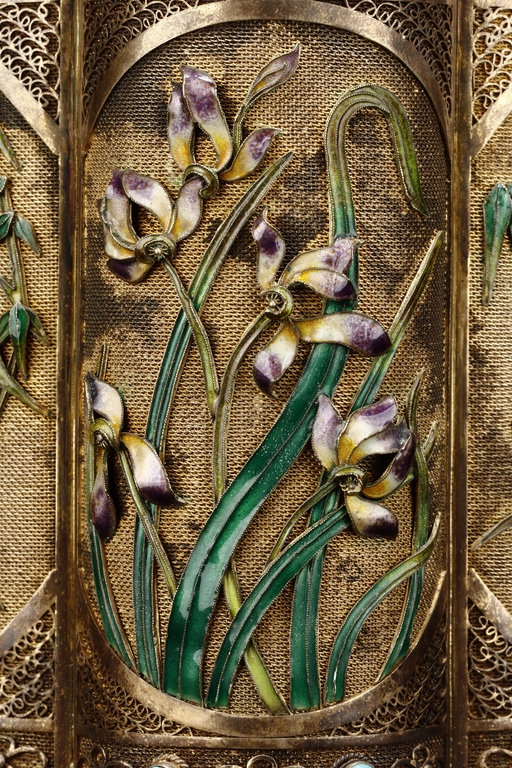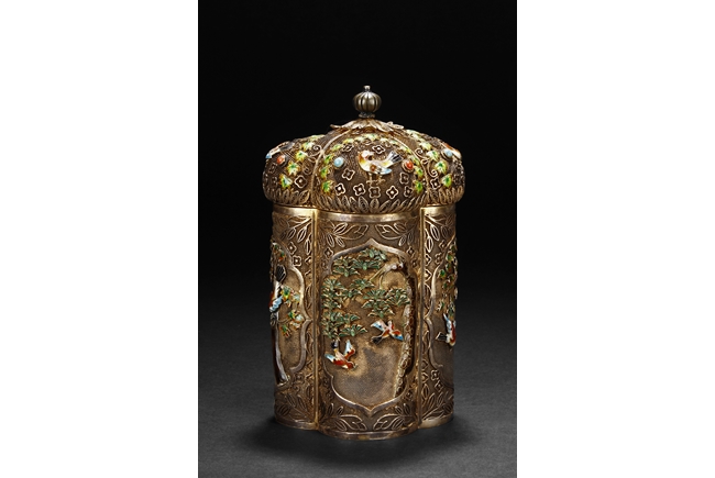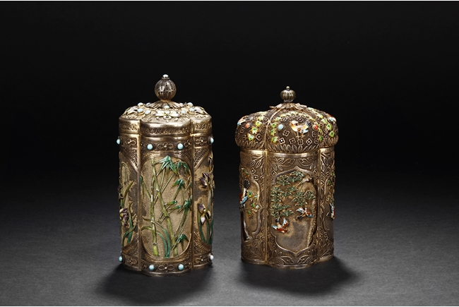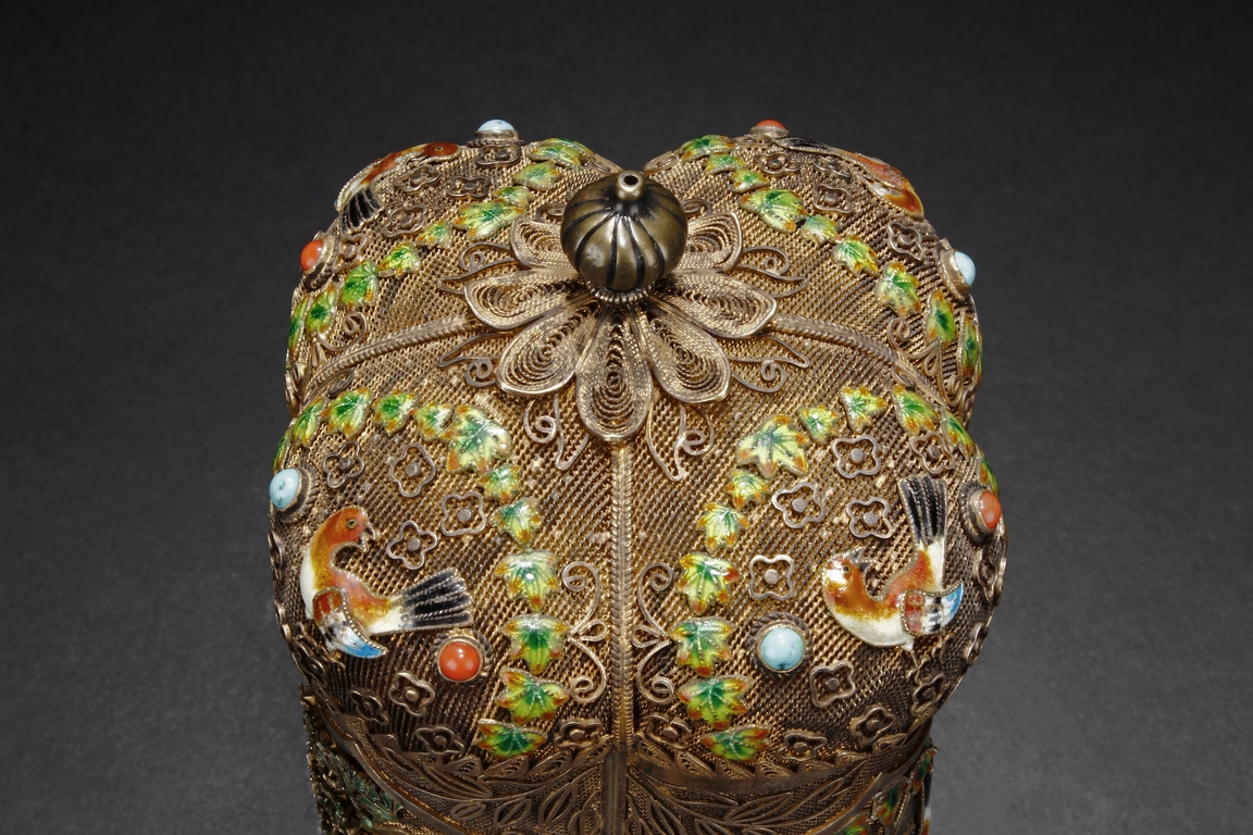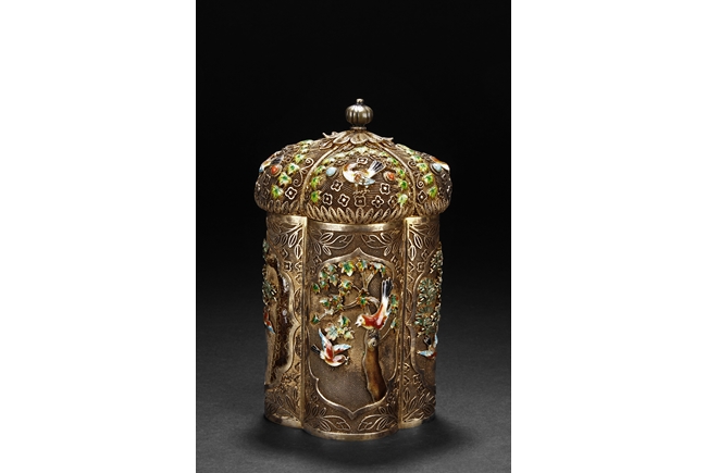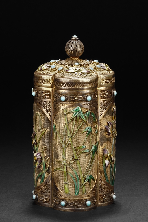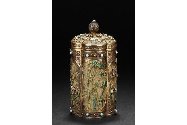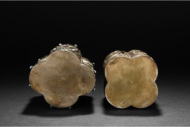 The body divided into four lobed shapes, while the interior retains oval shape, each exterior panel decorated and painted with bamboo trees or flowers, with bead turquoise and coral decorated all around the jar, bottom with mark "SILVER".
