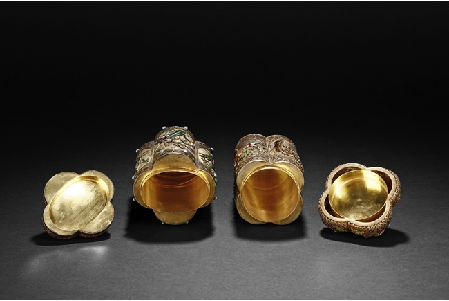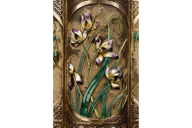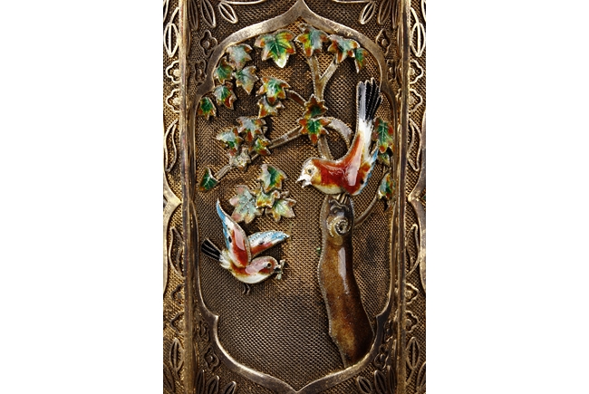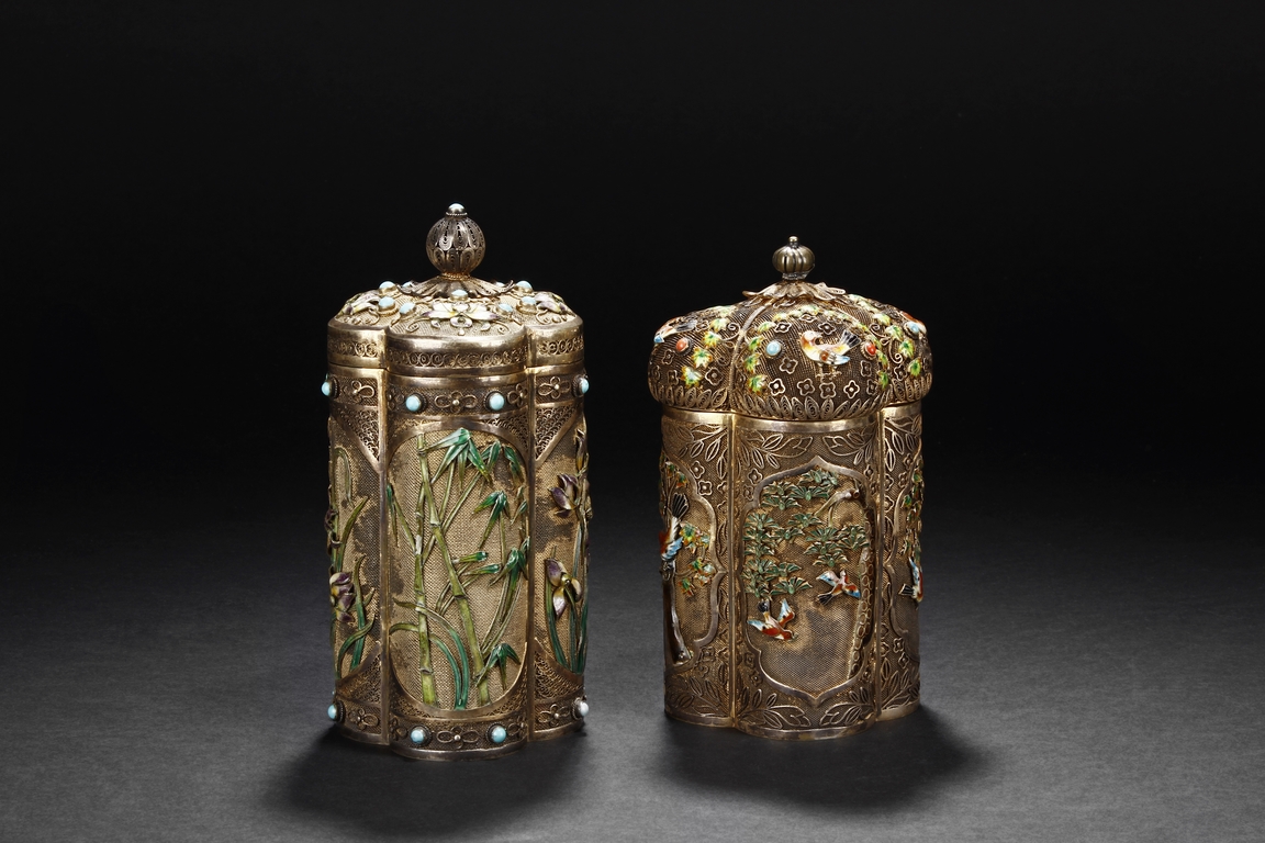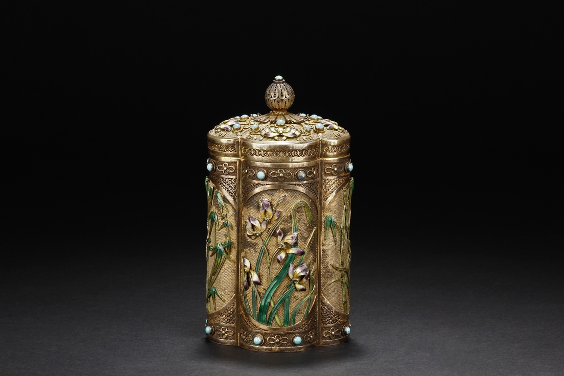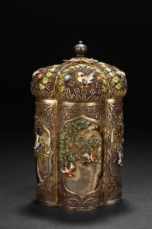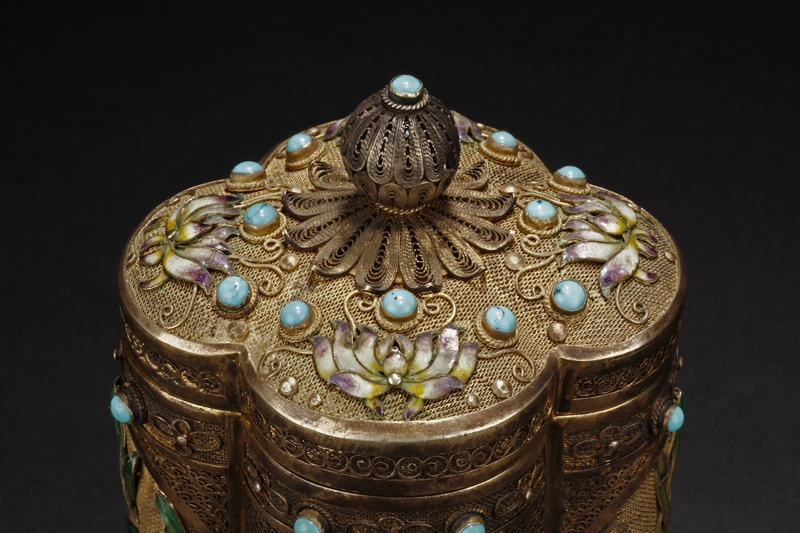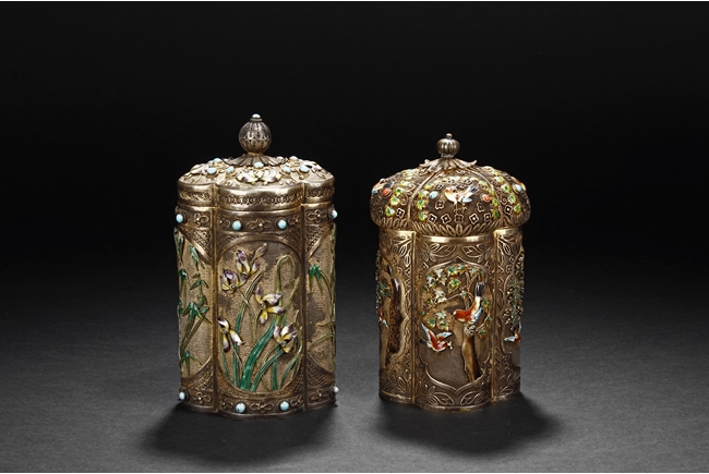 The body divided into four lobed shapes, while the interior retains oval shape, each exterior panel decorated and painted with bamboo trees or flowers, with bead turquoise and coral decorated all around the jar, bottom with mark "SILVER".