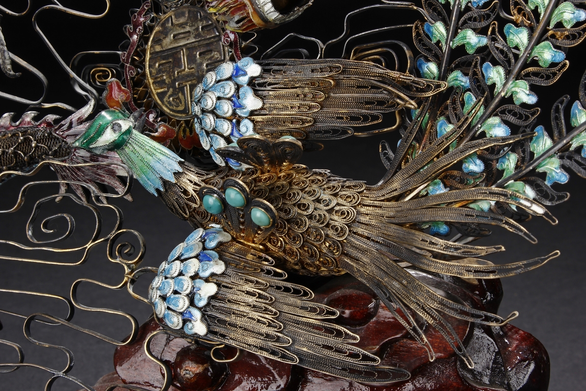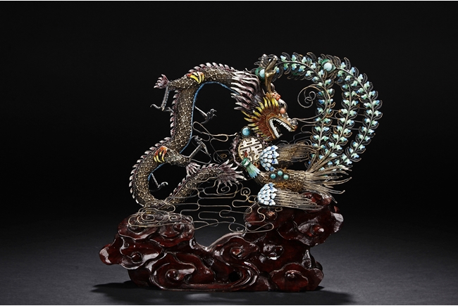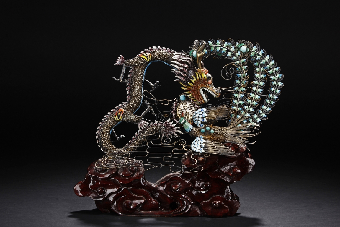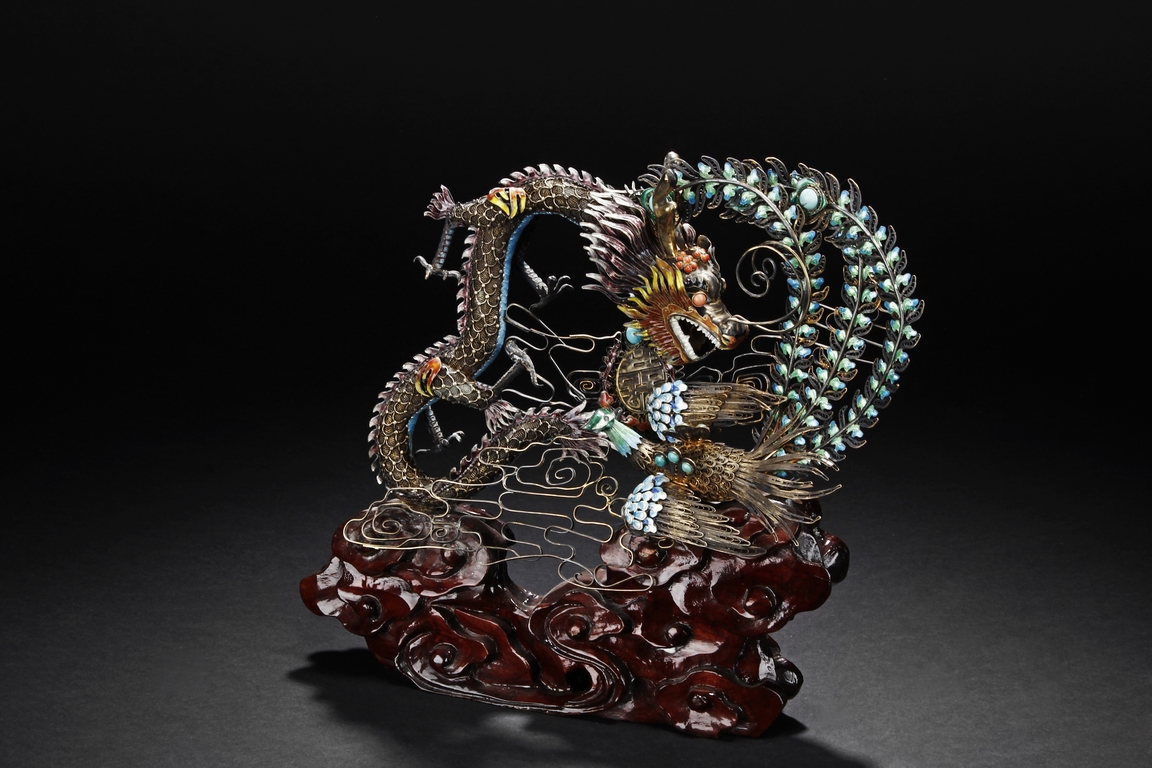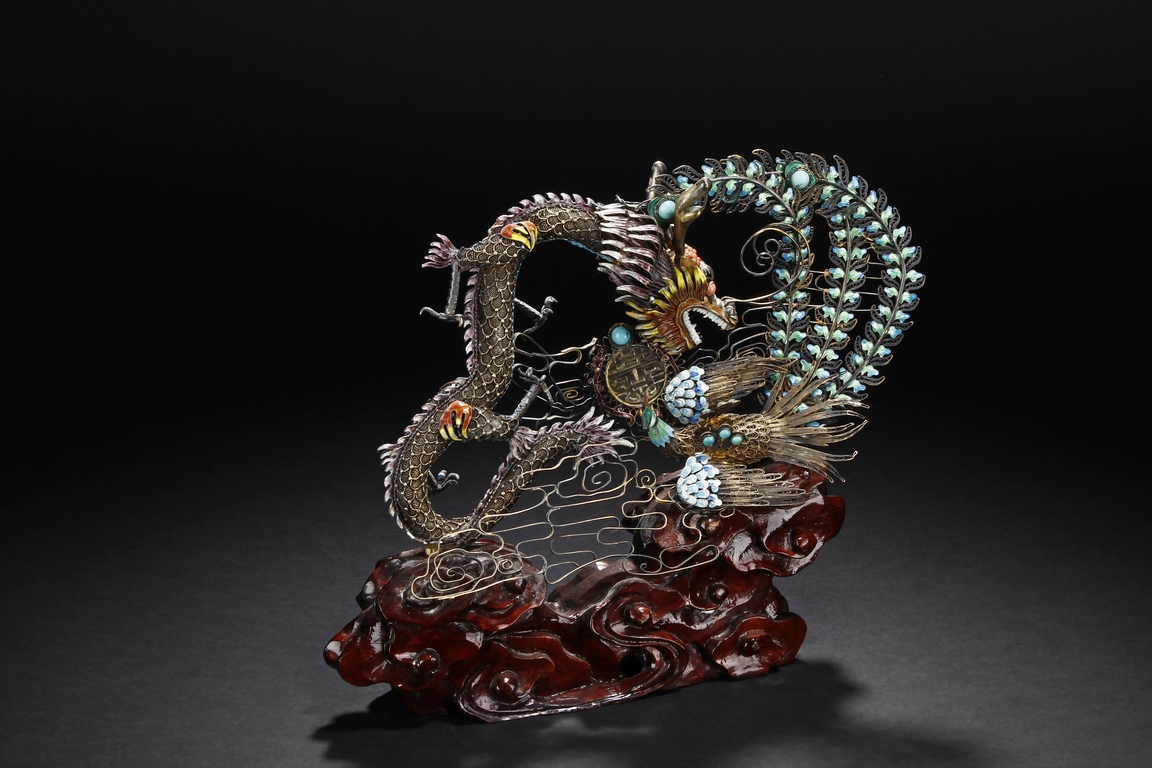 Mounted on a wood stand, the figural group is shown with a dragon and a phoenix flanking an stylized 'Xi' character, the dragon detailed with finely enamelled head, scales, and manes with various tones, eyes inset with coral beads, and the phoenix with elaborately enamelled tails bended towards dragon, the body inset with turquoise beads.