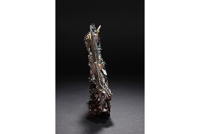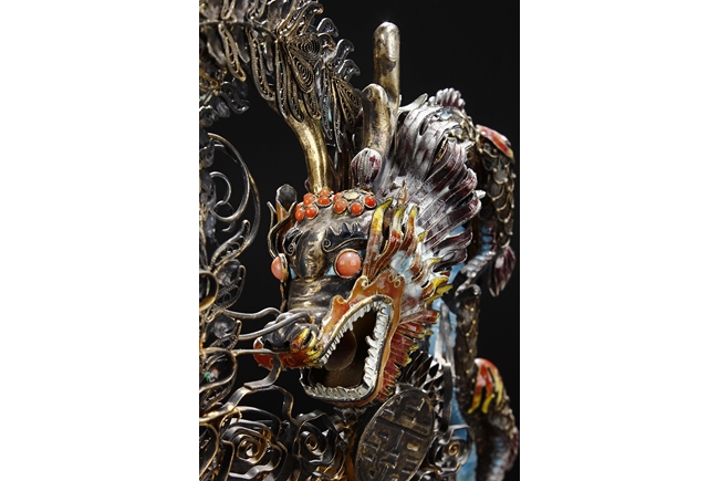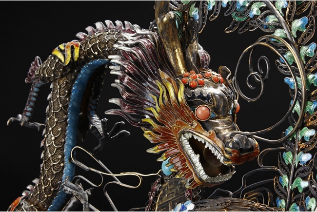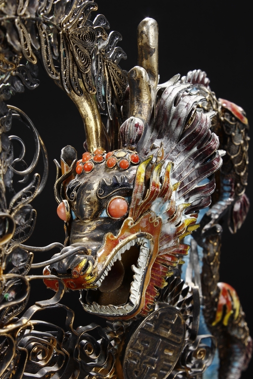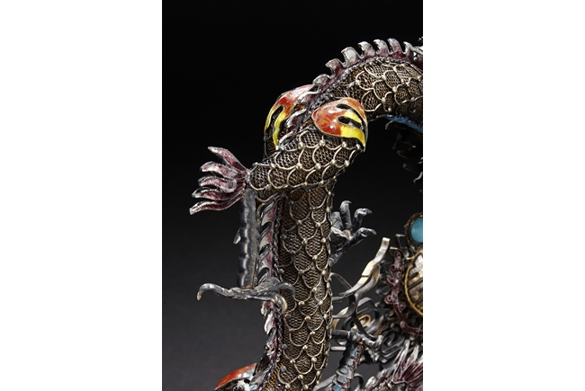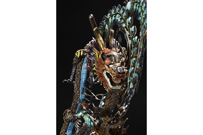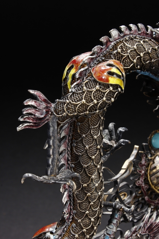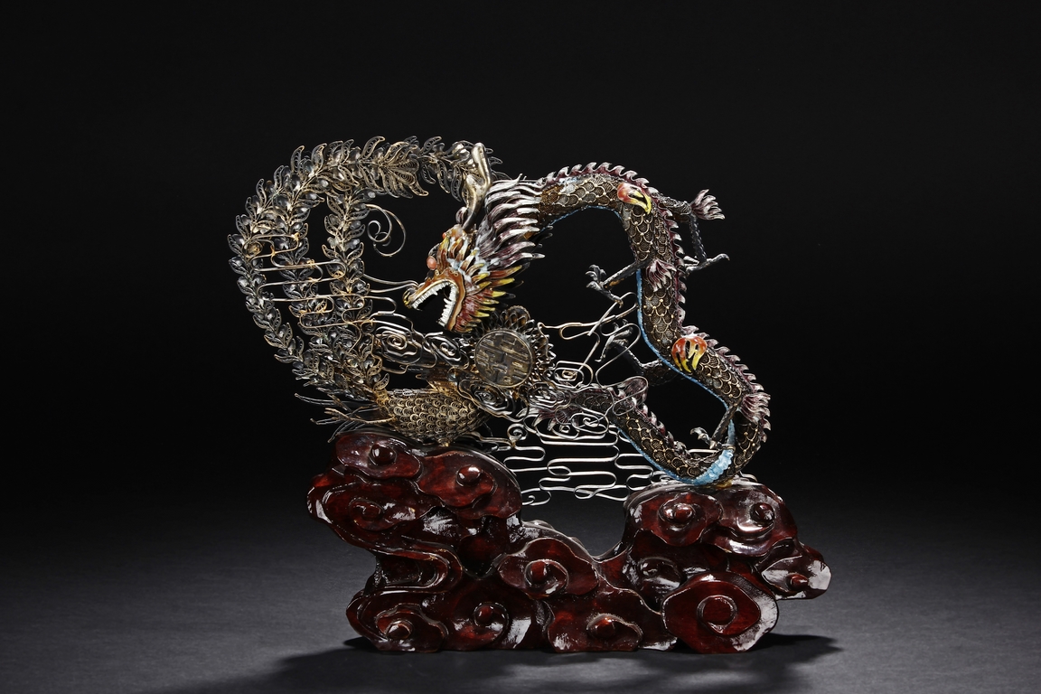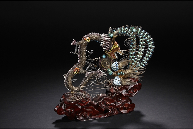 Mounted on a wood stand, the figural group is shown with a dragon and a phoenix flanking an stylized 'Xi' character, the dragon detailed with finely enamelled head, scales, and manes with various tones, eyes inset with coral beads, and the phoenix with elaborately enamelled tails bended towards dragon, the body inset with turquoise beads.