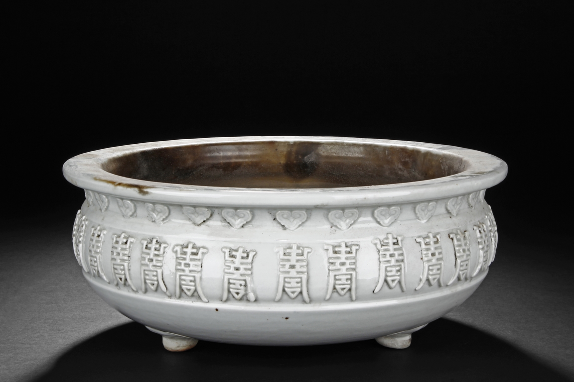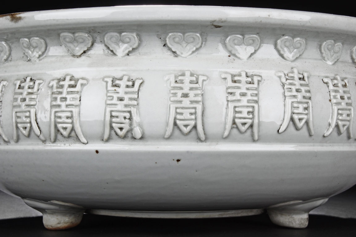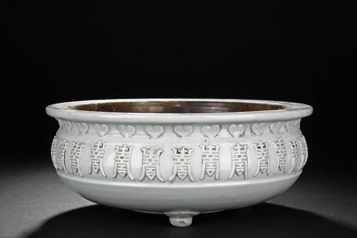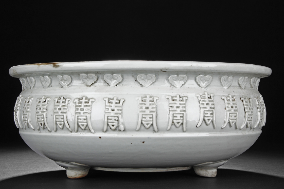 Of flattened ovoid form, the Blanc de chine white-glazed censer supported by three small feet, the body covered with scrolling stylized "Shou" characters and ruyi cloud patterns. Qing Dynasty period.