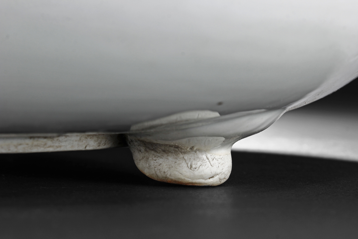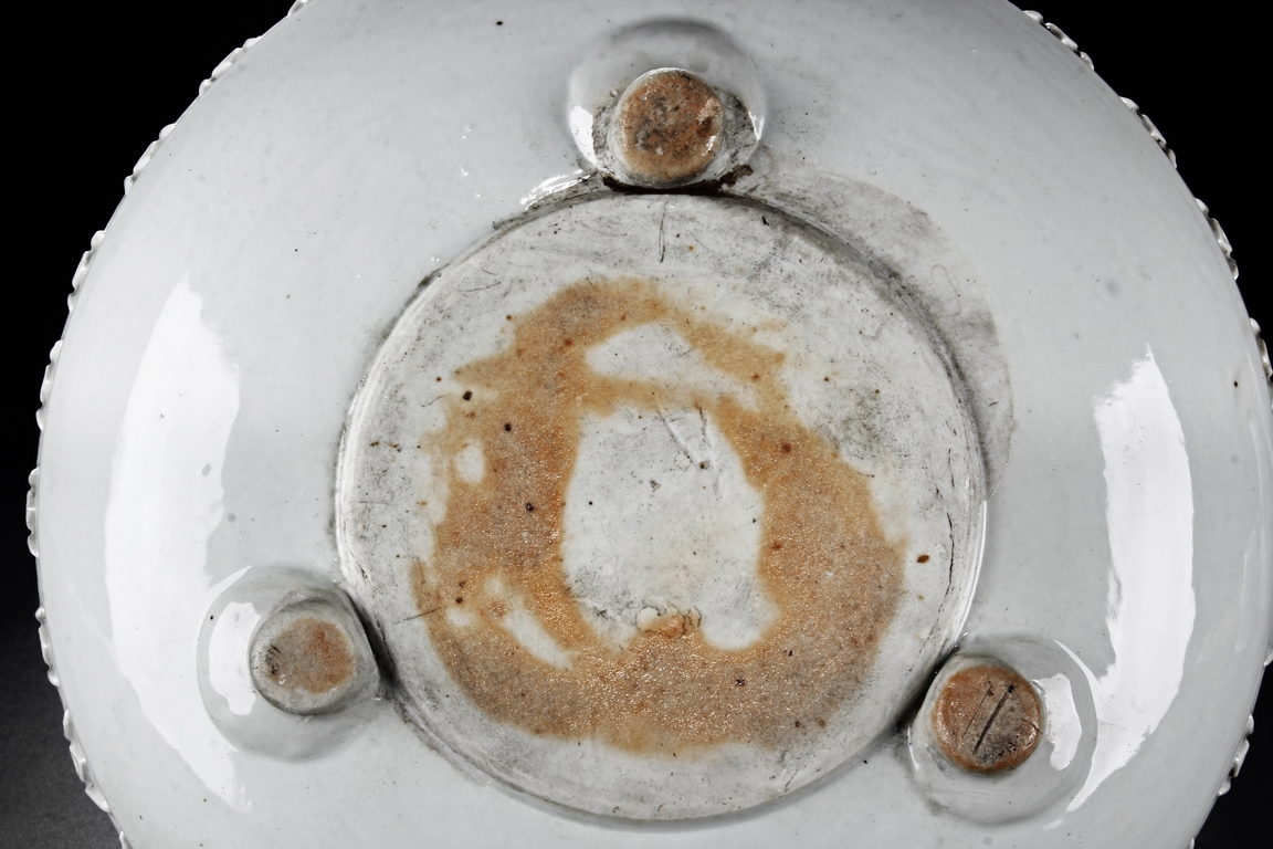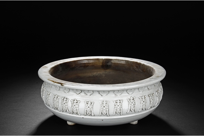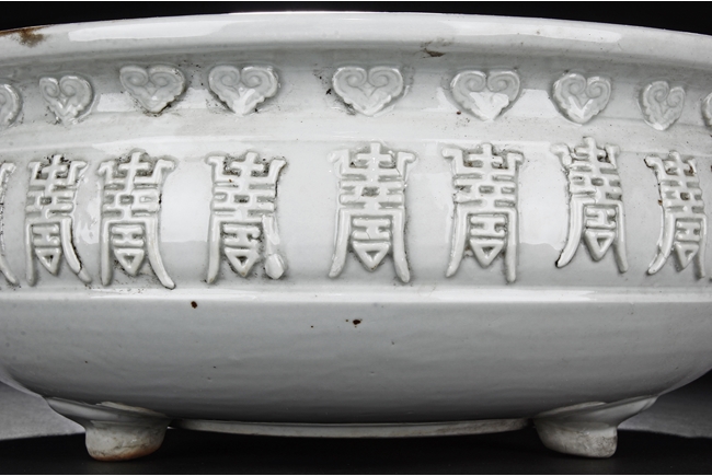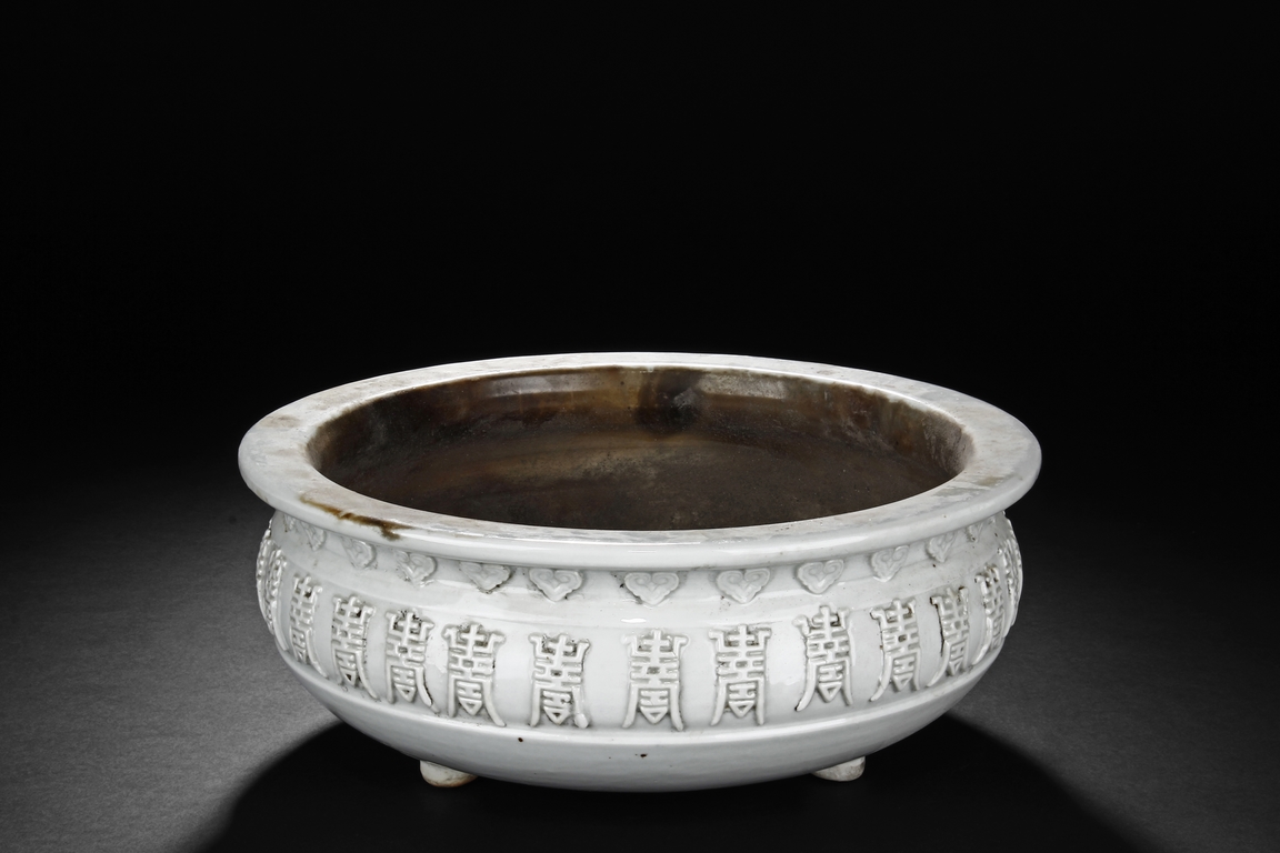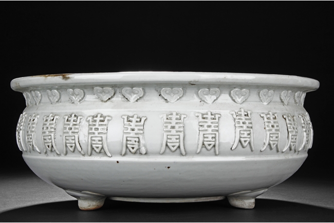 Of flattened ovoid form, the Blanc de chine white-glazed censer supported by three small feet, the body covered with scrolling stylized "Shou" characters and ruyi cloud patterns. Qing Dynasty period.