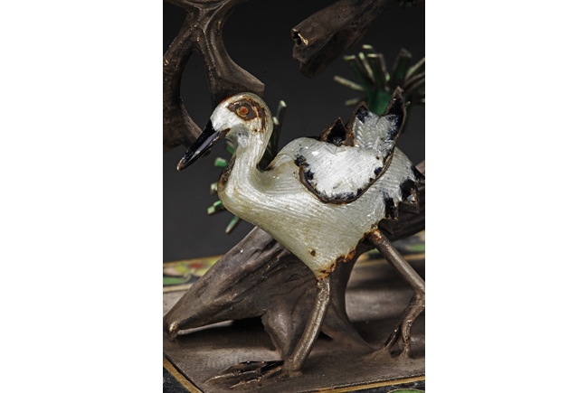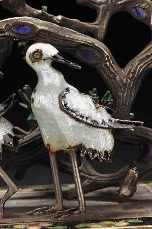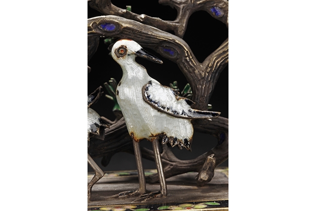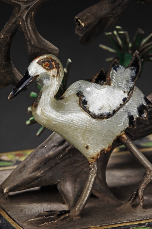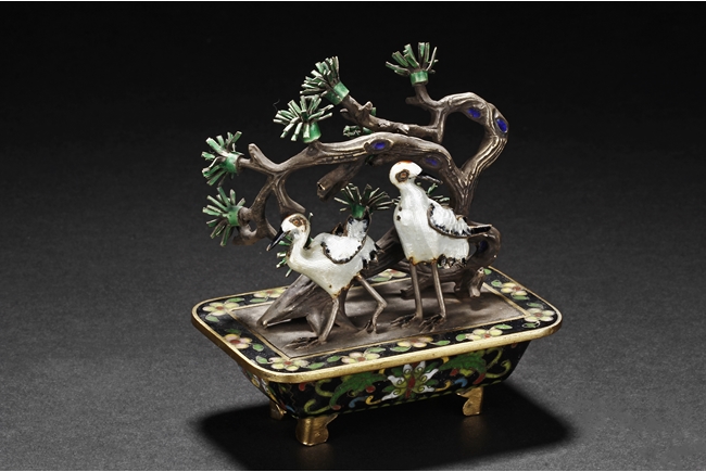 One pair of planters depict cranes walking alongside of pine trees, planted into shallow black planters decorated with flower patterns and supported by four L shaped feet, symbolizing longevity. The other pair of planters depict magpie birds perched on plum flower trees. Republic period. 來源:泰國藏家提供