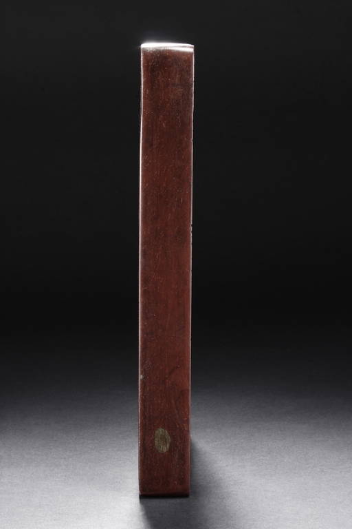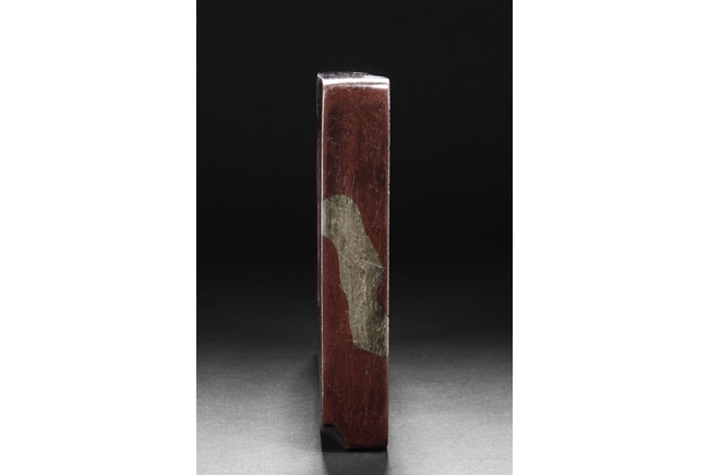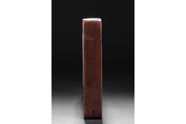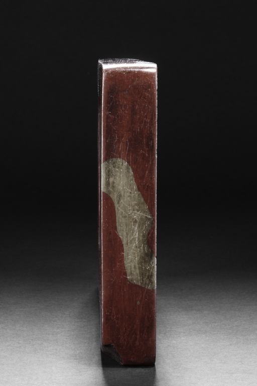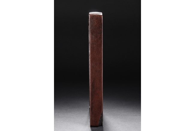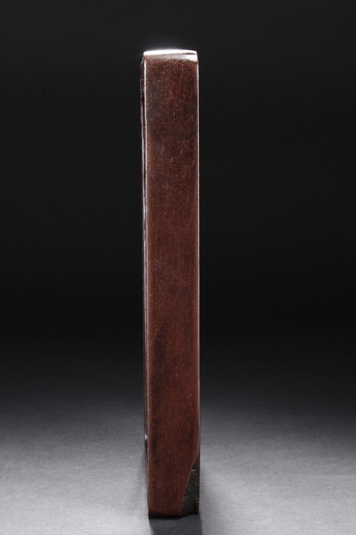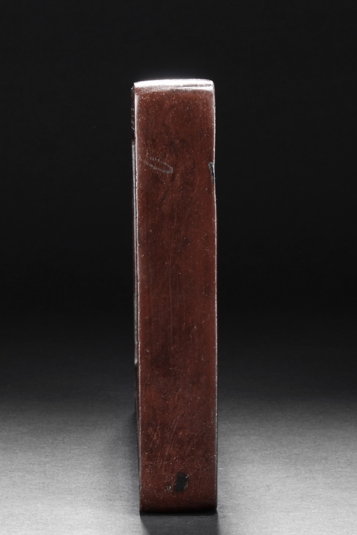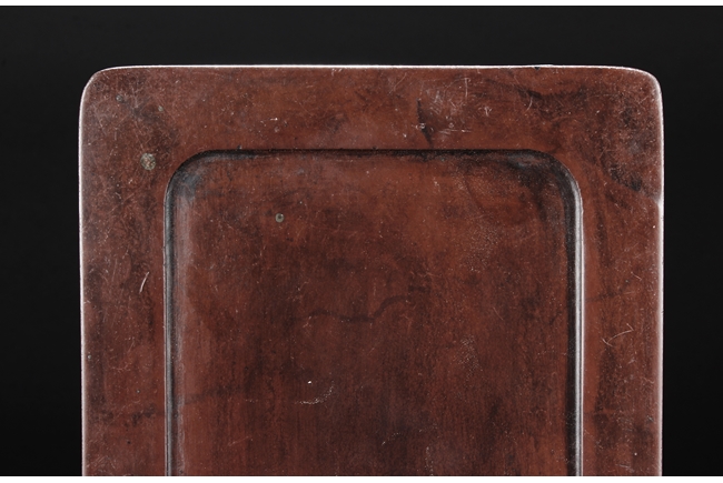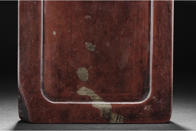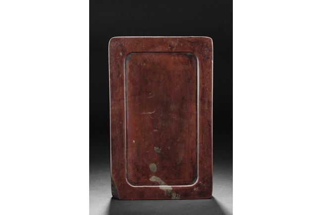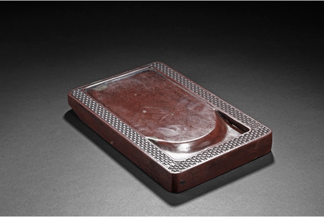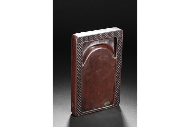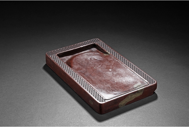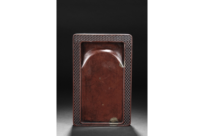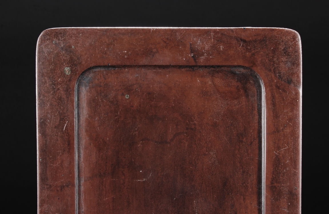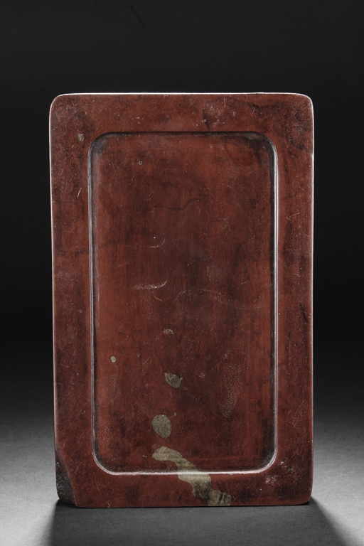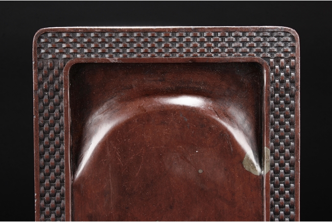 The ink stone is of deep red-orange color, the edges in chain link pattern, with inkwell on the one side, carved deeply with a curved pattern. Republic period.