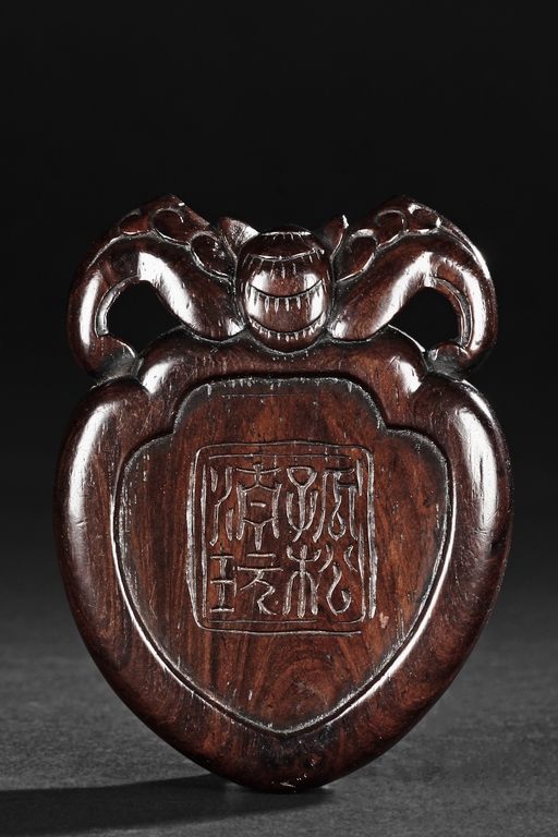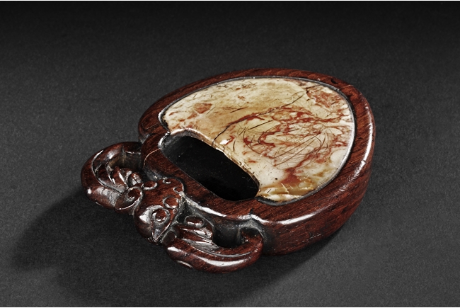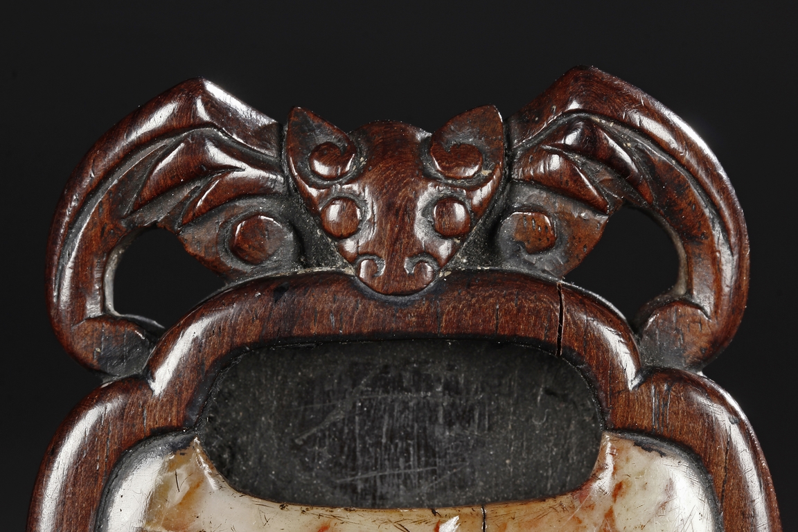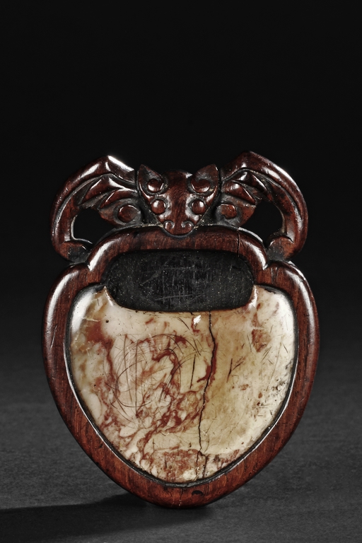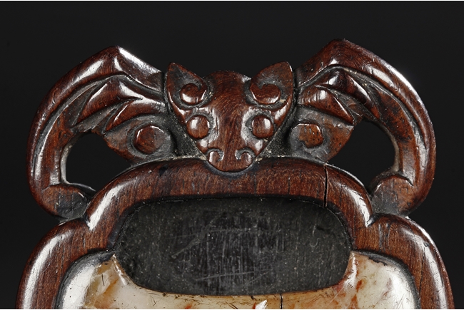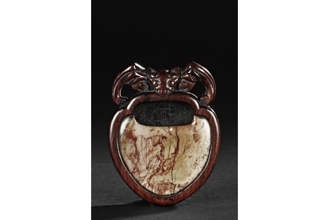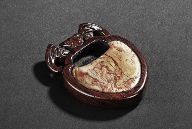 Of peach shape, the miniature ink stone framed in a wooden exterior, the top carved with a flying bat, the stone is of white and red color, the back with four character mark.