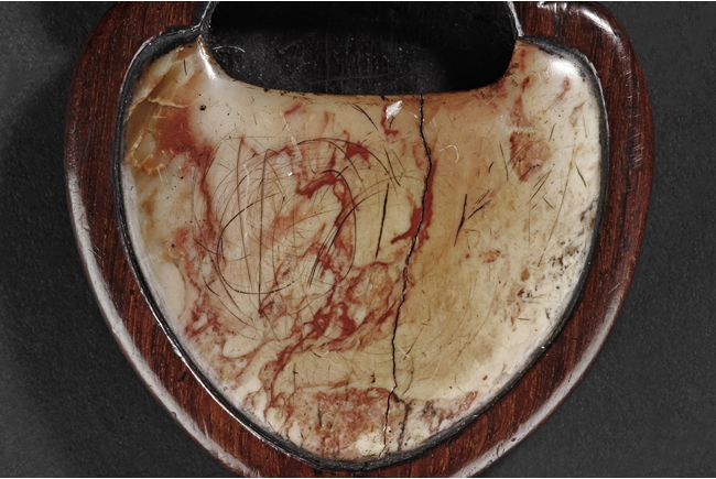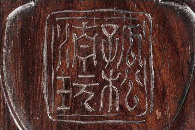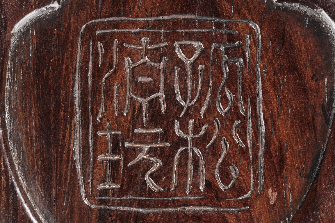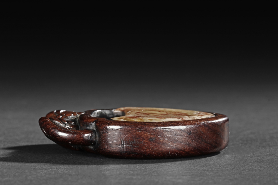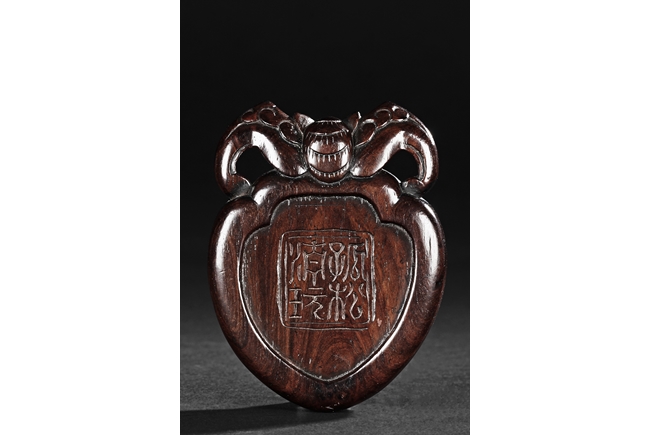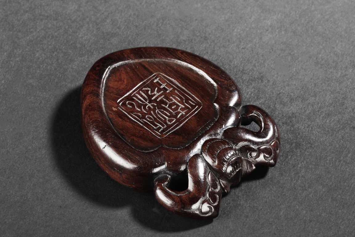 Of peach shape, the miniature ink stone framed in a wooden exterior, the top carved with a flying bat, the stone is of white and red color, the back with four character mark.