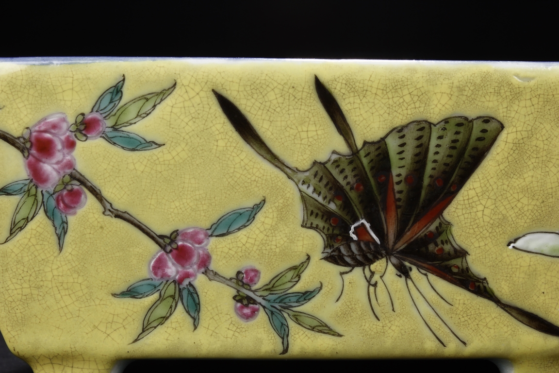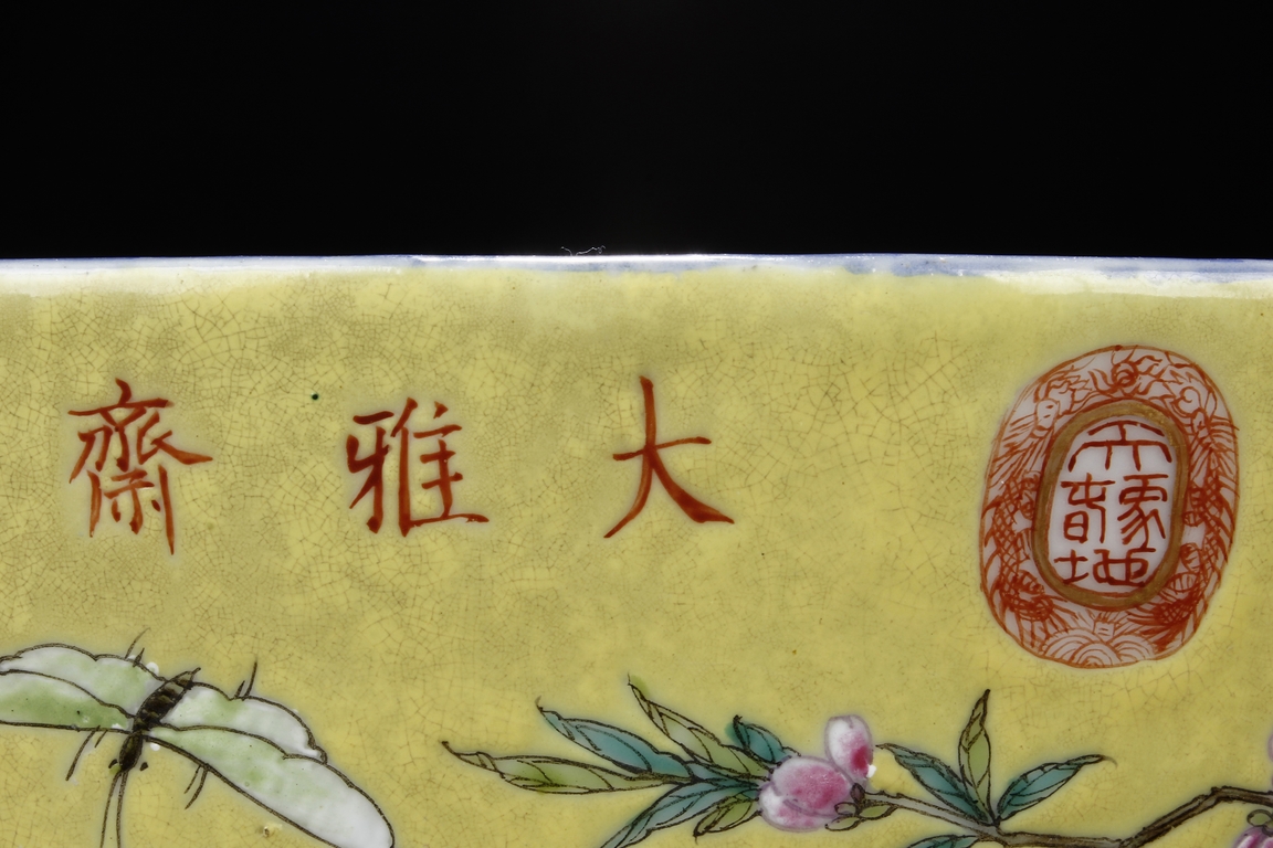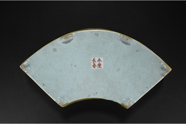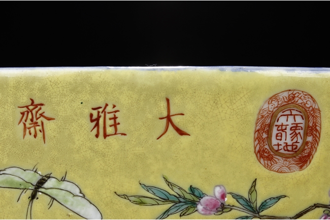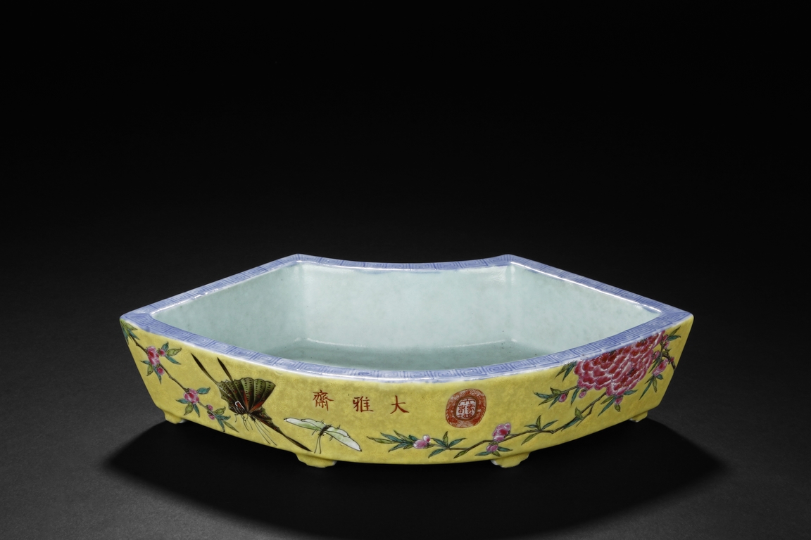 Of curved fan shape, the plate's interior glazed in teal, the sides depict butterflies amidst peony flowers against yellow glaze and crackle patterns, with artist mark "DA YA ZHAI" at center, the bottom with four character mark.
