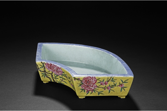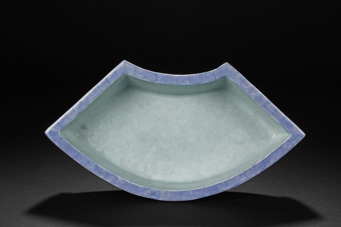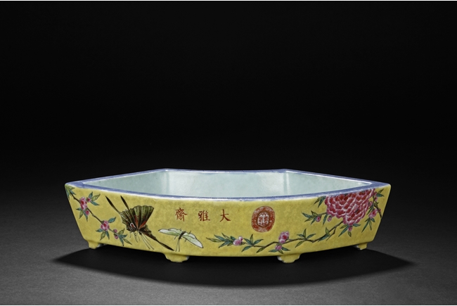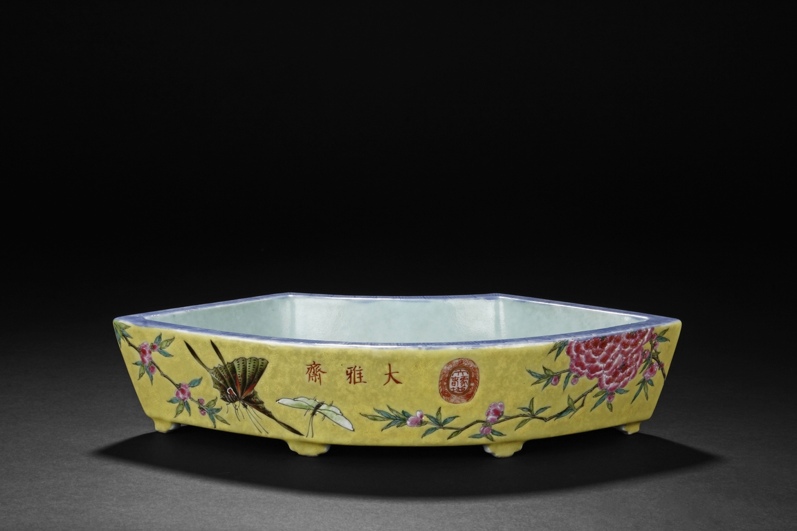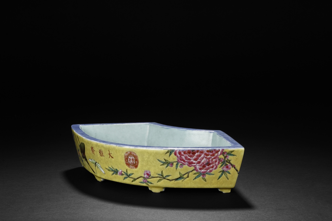 Of curved fan shape, the plate's interior glazed in teal, the sides depict butterflies amidst peony flowers against yellow glaze and crackle patterns, with artist mark "DA YA ZHAI" at center, the bottom with four character mark.