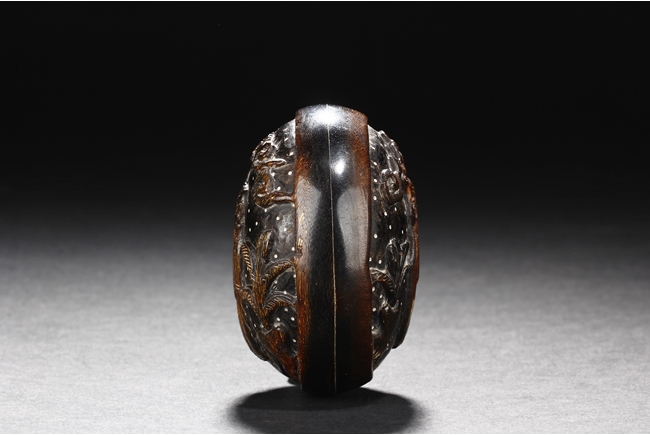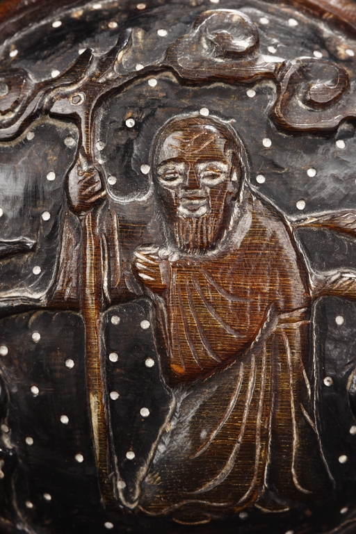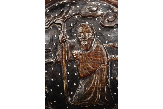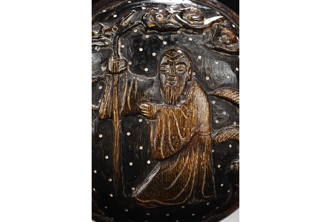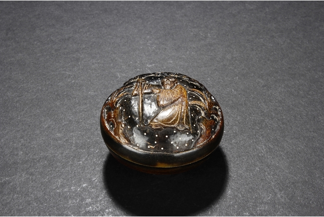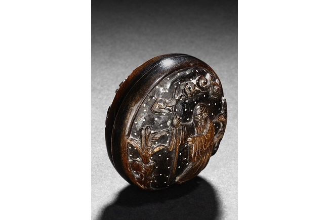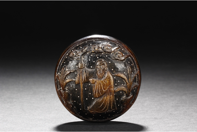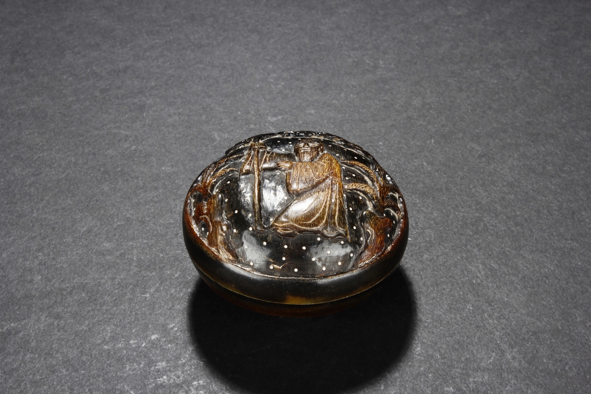 The small and round ink box carved from buffalo horn, the top carved with an elder in an outdoor setting, retaining original colors and texture. Qing Dynasty period.