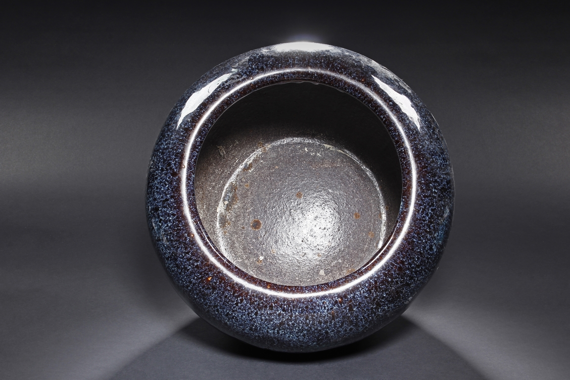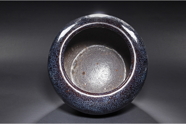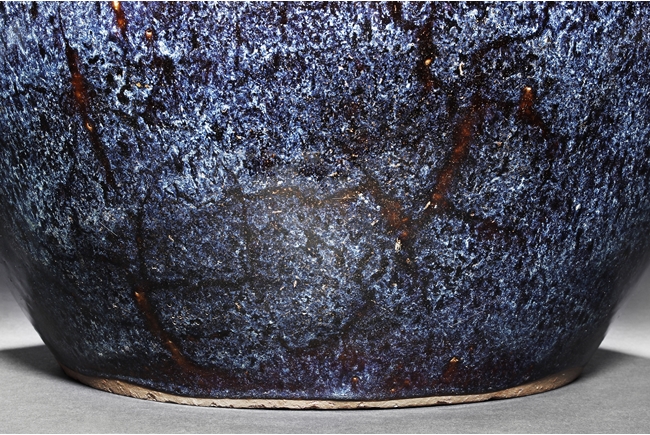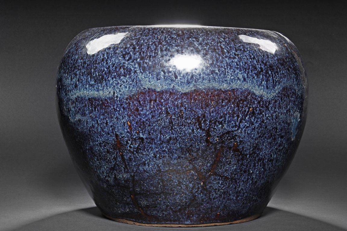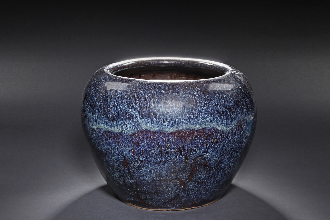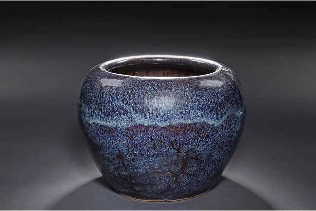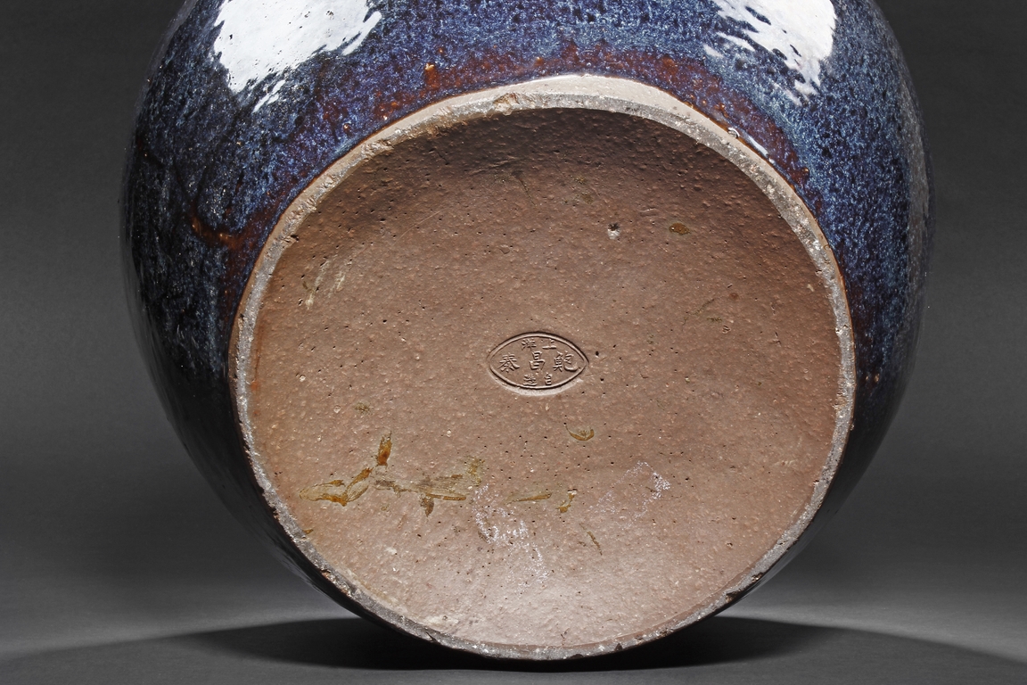 Of globular body, the jar glazed overall in flambe red, blue, and white color, the bottom with artist mark "Bao Changtai".