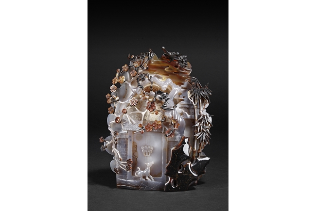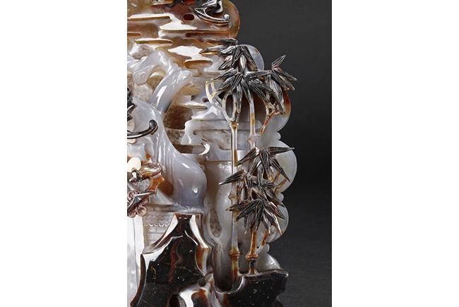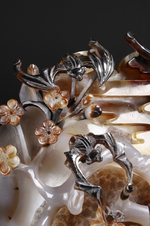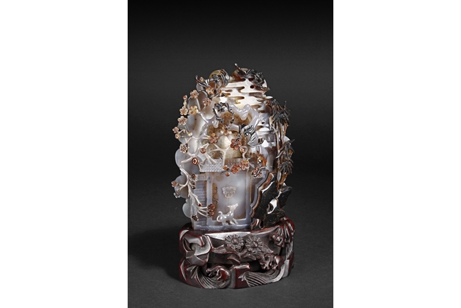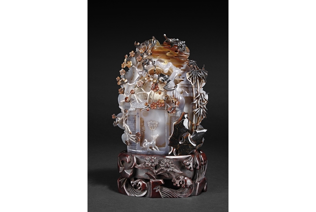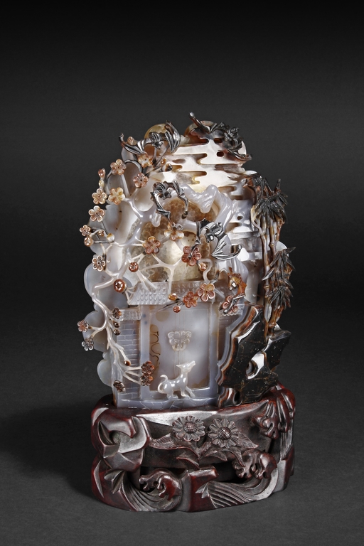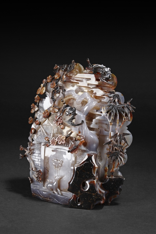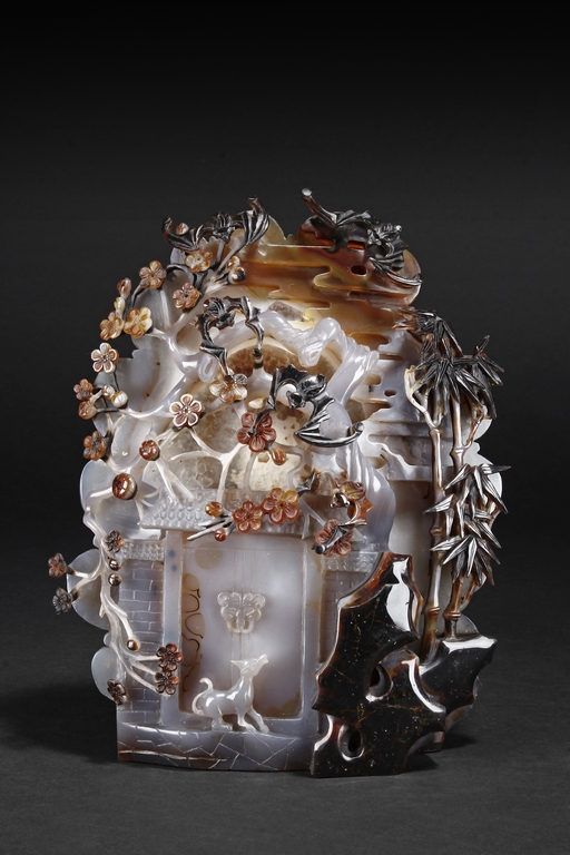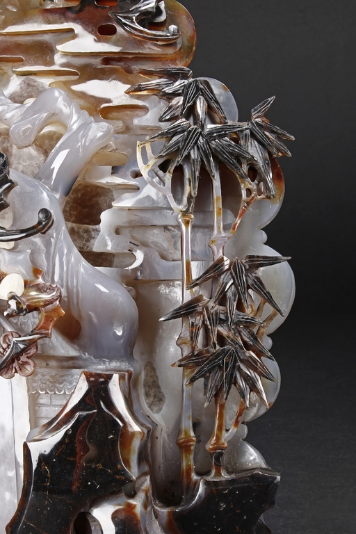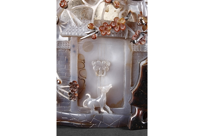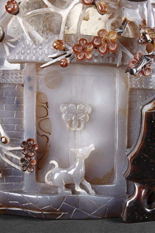 Raised on a carved wood stand, the agate is carved on one side with a door to a garden, a dog, bamboo trees issuing from rock-work, plum,and five auspicious bats in flight above the door with auspicious clouds rising on the background. The stone is of varying tone of translucent white, brown, and brownish black tone. Includes wooden stand.