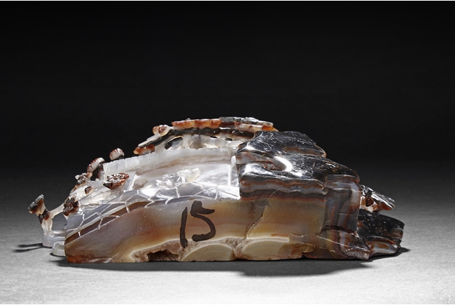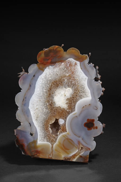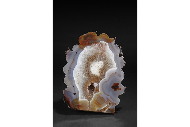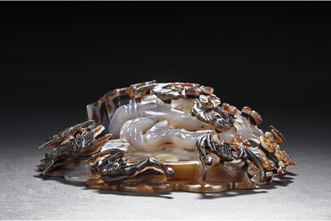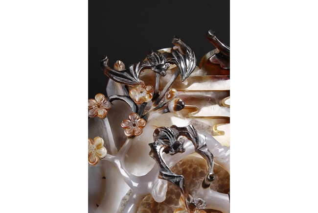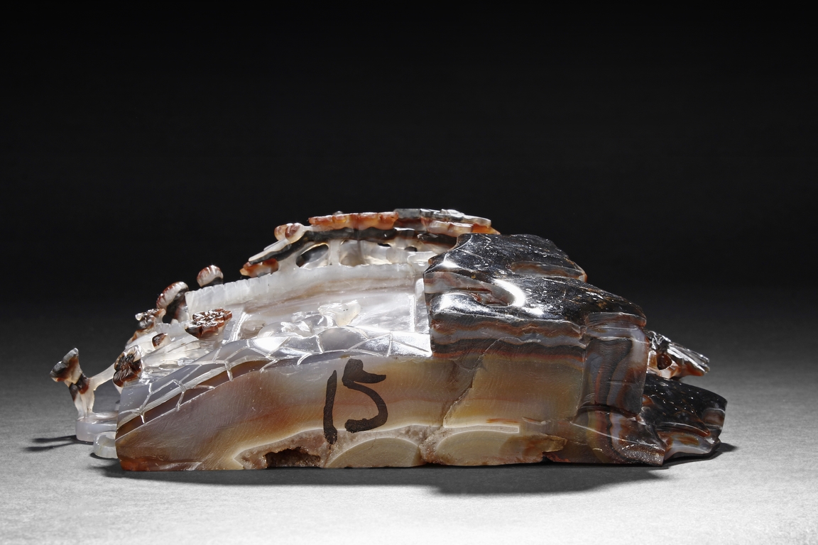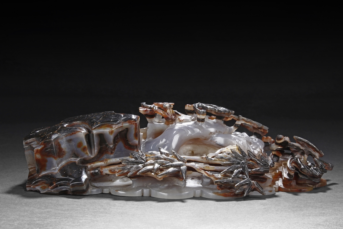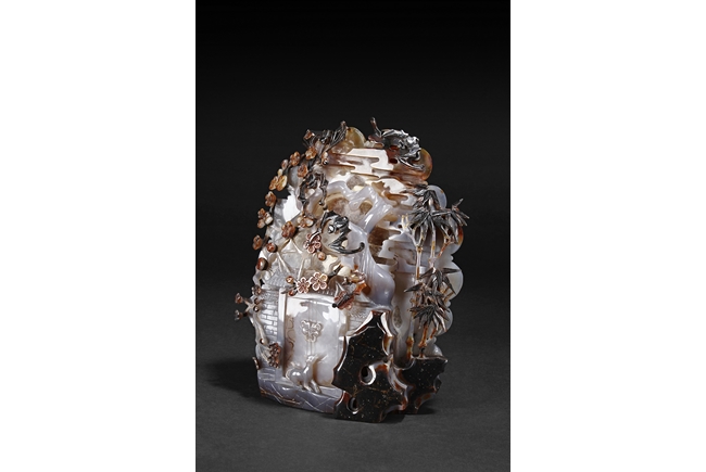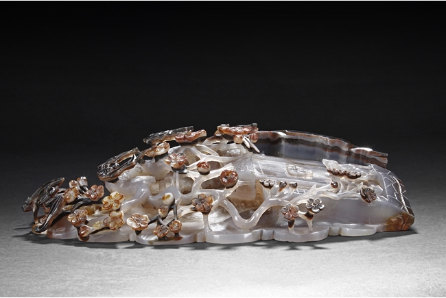 Raised on a carved wood stand, the agate is carved on one side with a door to a garden, a dog, bamboo trees issuing from rock-work, plum,and five auspicious bats in flight above the door with auspicious clouds rising on the background. The stone is of varying tone of translucent white, brown, and brownish black tone. Includes wooden stand.