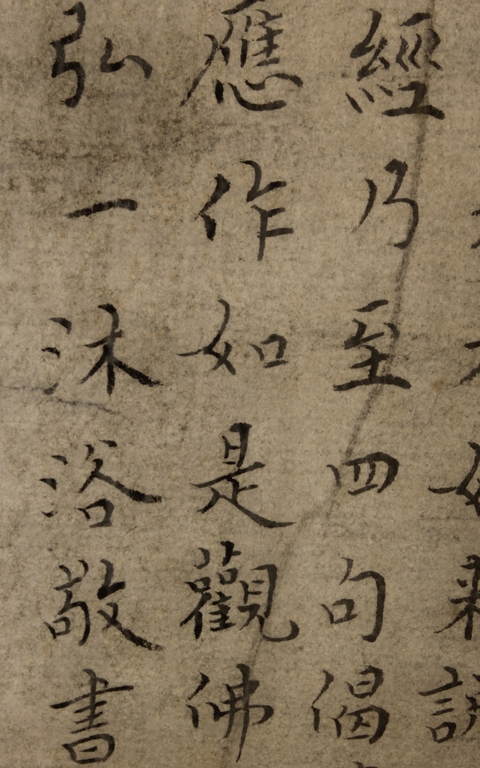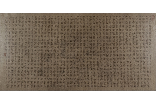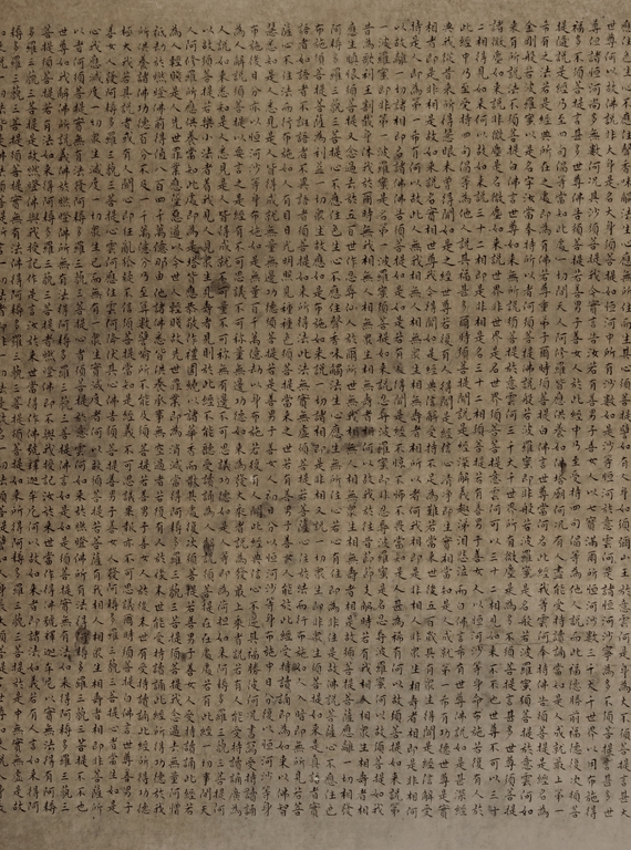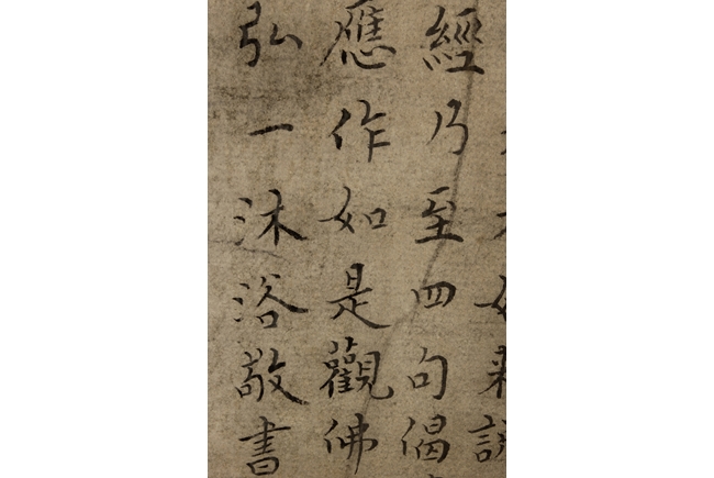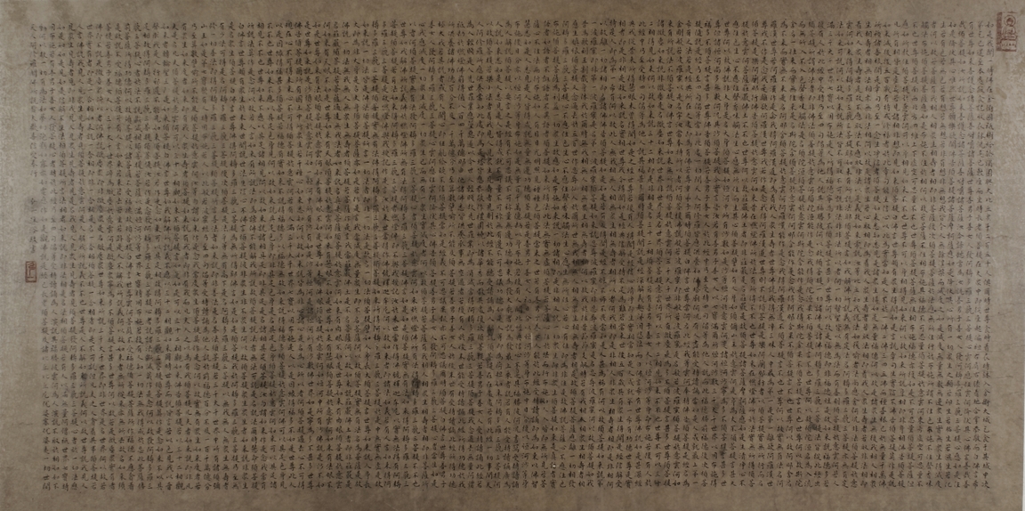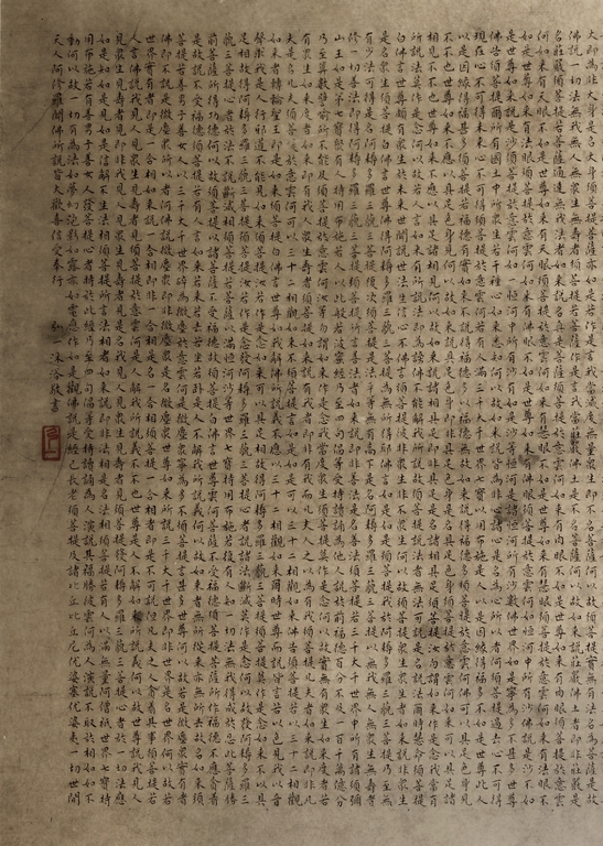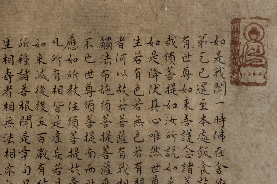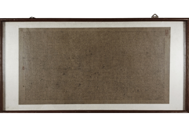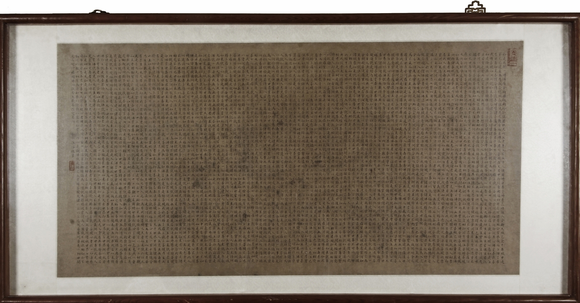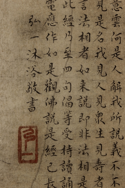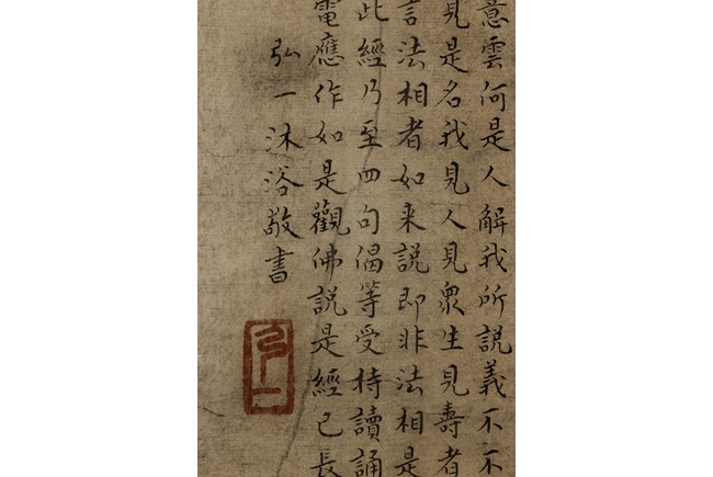 The large framed manuscript consists of the Diamond Sutra in its entirety in Chinese, with artist signature and mark "Hong Yi" on the left side. Early Republic period.