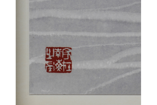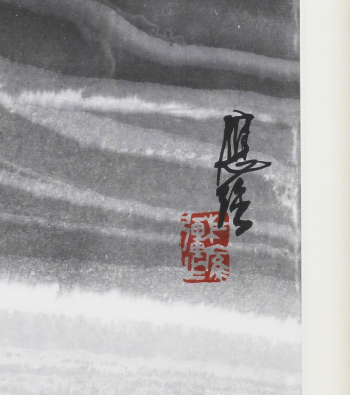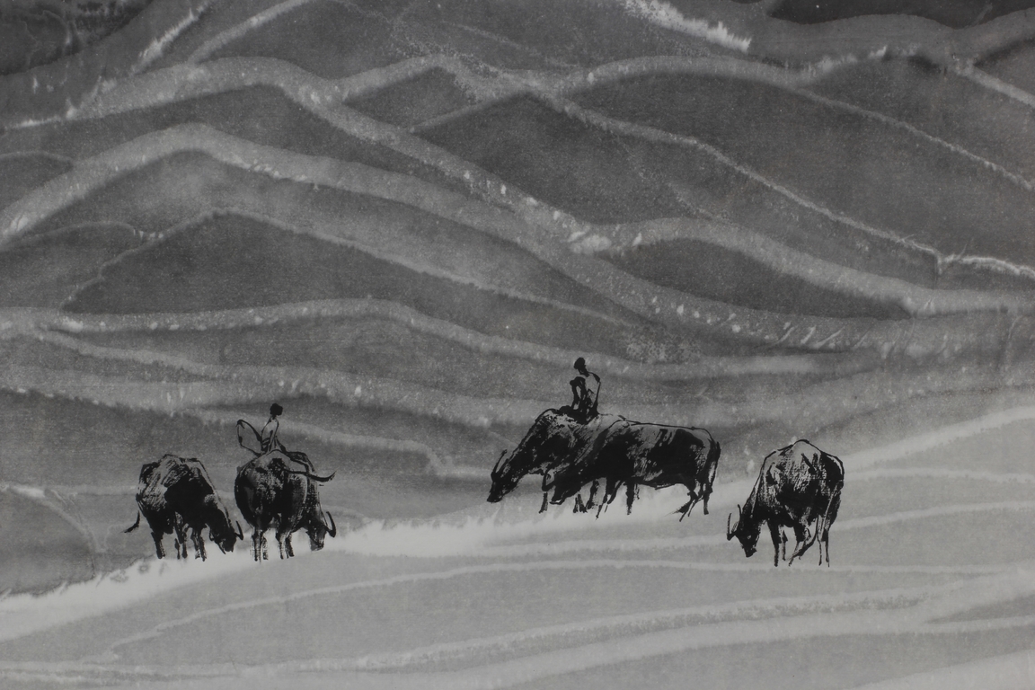 Color and ink on paper painting. Mounted and framed. The framed painting depicts a scene of two shepherds pasturing eight cattles in the wild, with open range and mountains. Artist signature and mark on right side, additional mark on bottom left.