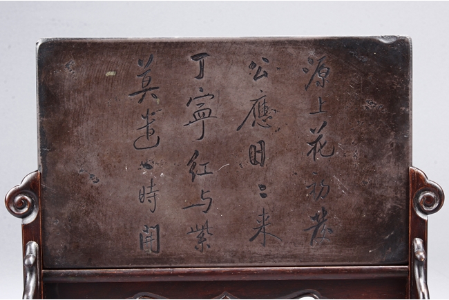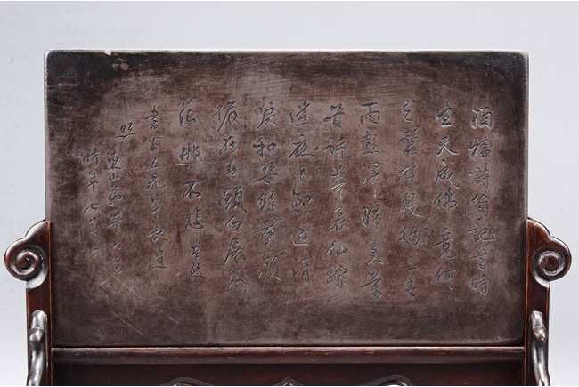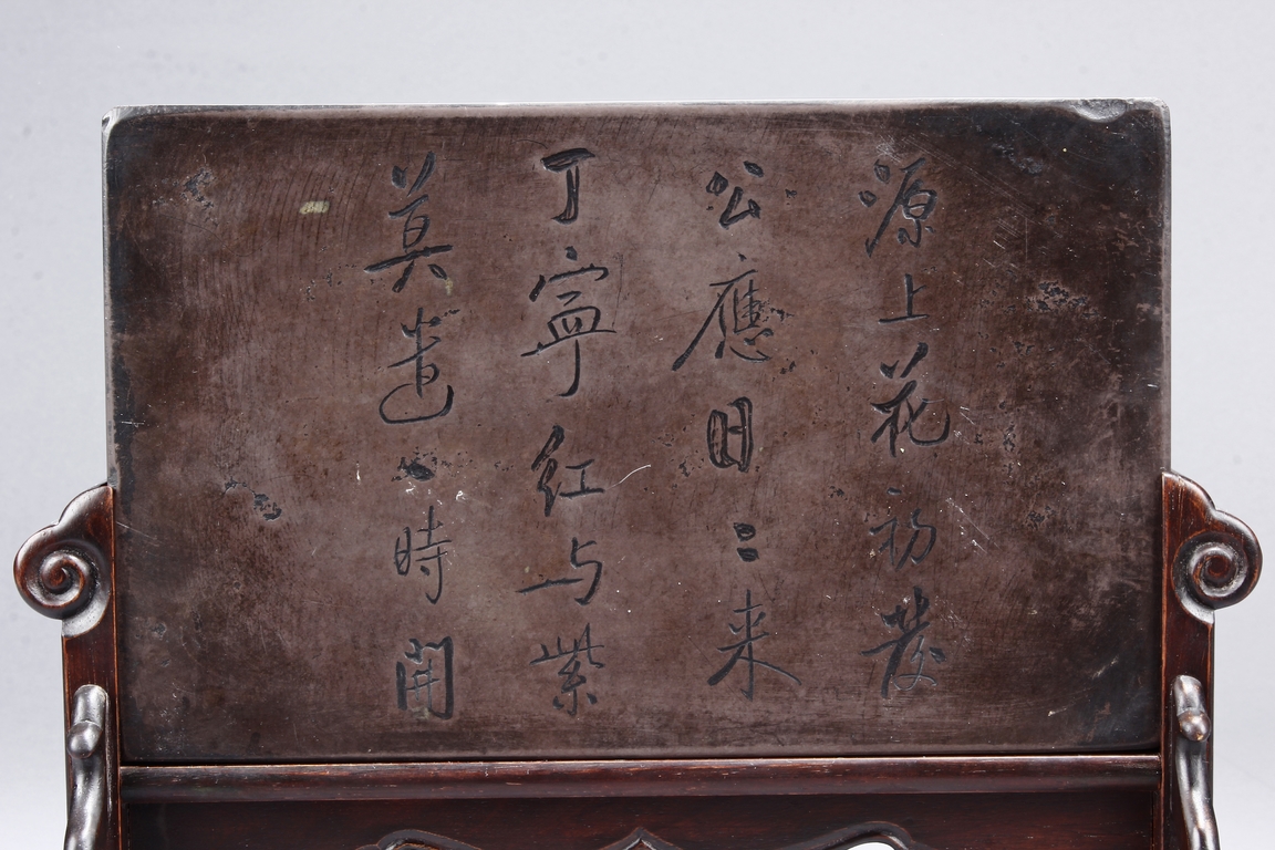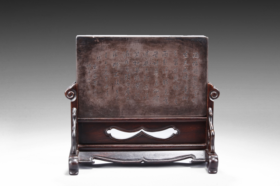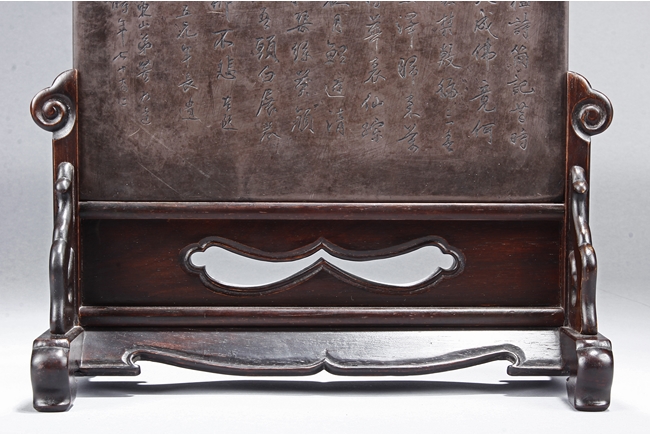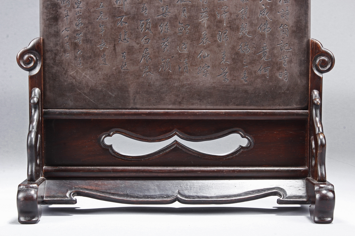 Of horizontally rectangular form, the table screen is incised in semi-cursive form with poems on both sides, the wood stand is modelled in scrolling legs and openwork frame. Qing Dynasty period.