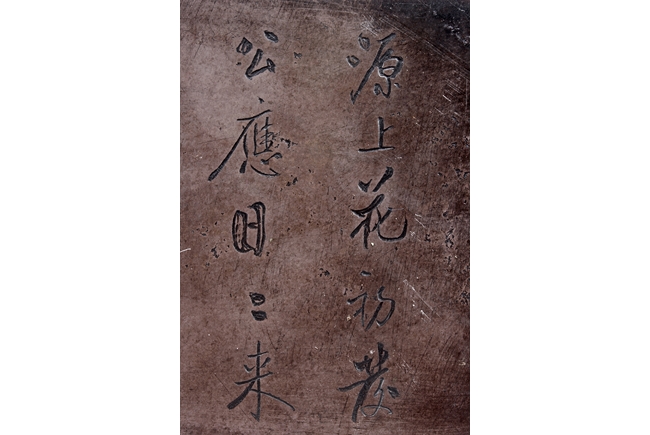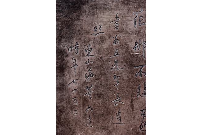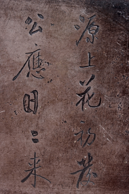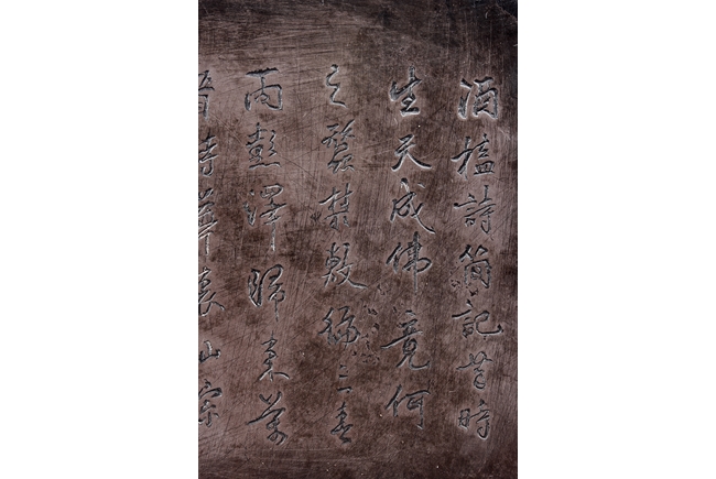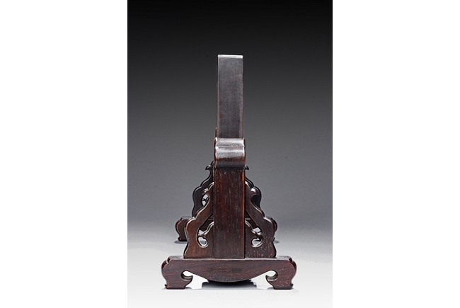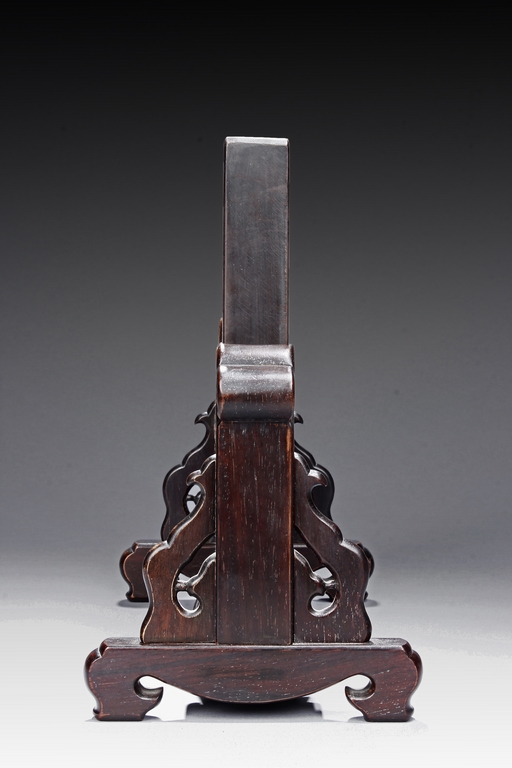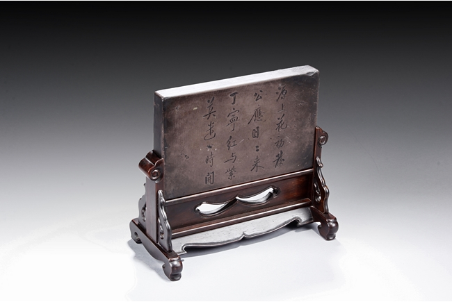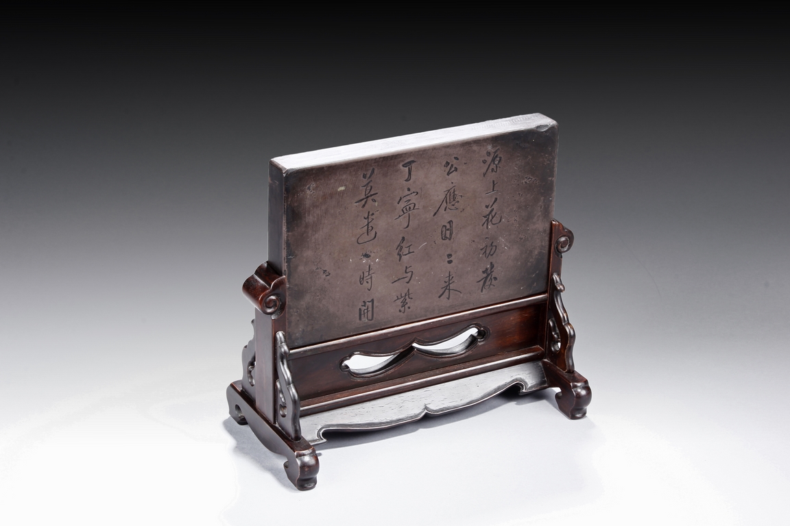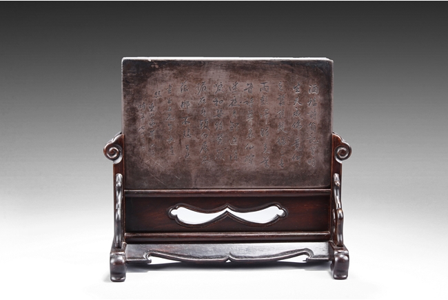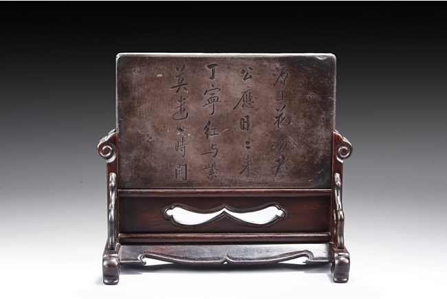 Of horizontally rectangular form, the table screen is incised in semi-cursive form with poems on both sides, the wood stand is modelled in scrolling legs and openwork frame. Qing Dynasty period.