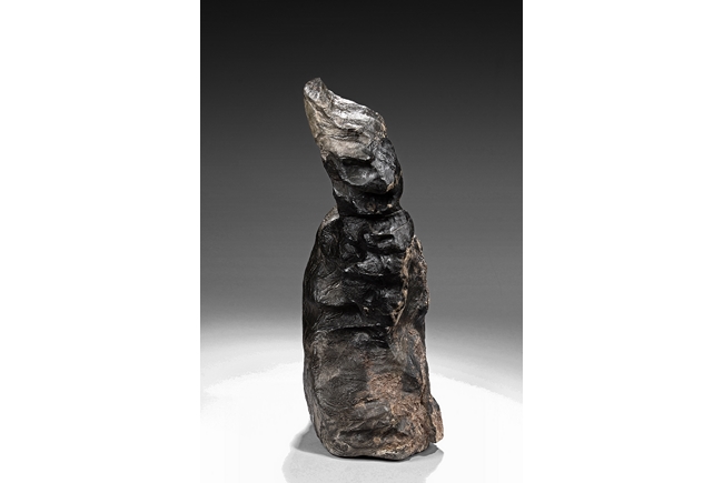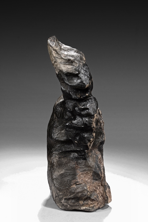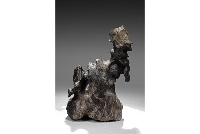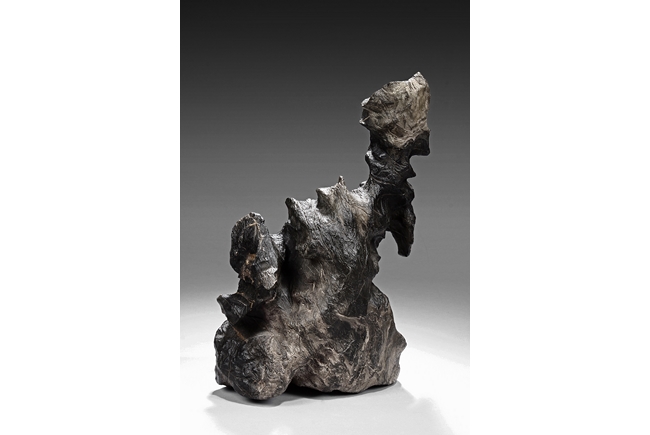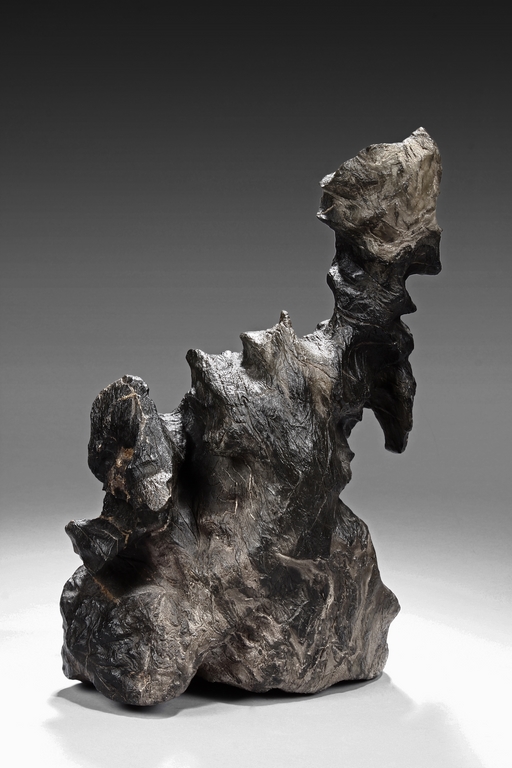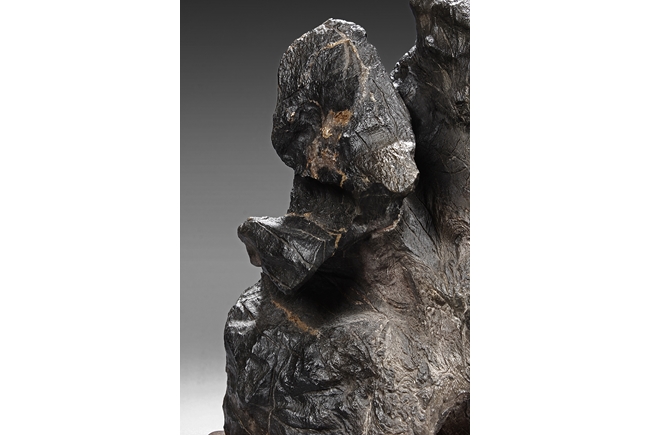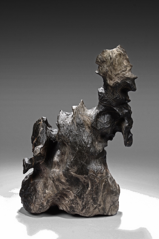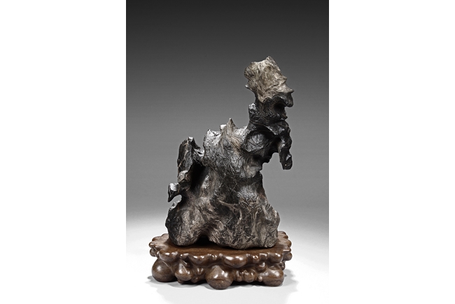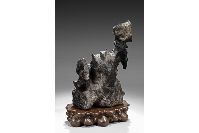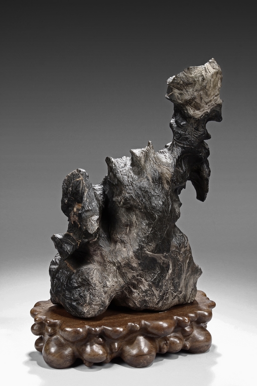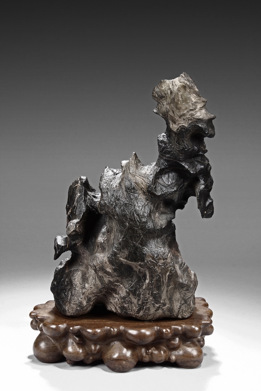 The Lingbi rock has a naturally irregular outline, rising from a broad horizontal base to form a head, the stone is of richly wrinkled black texture and luster.