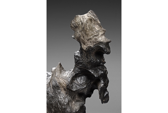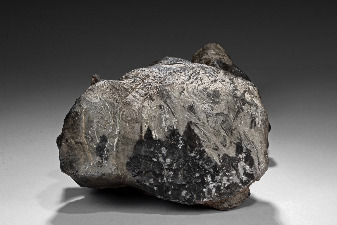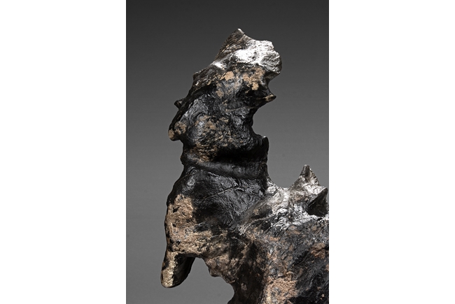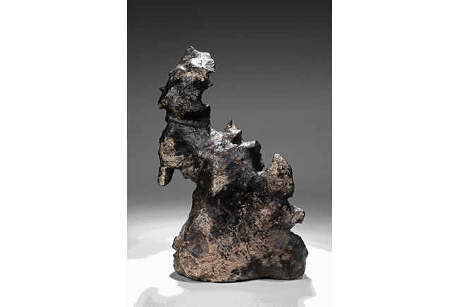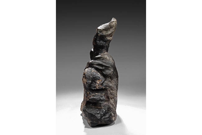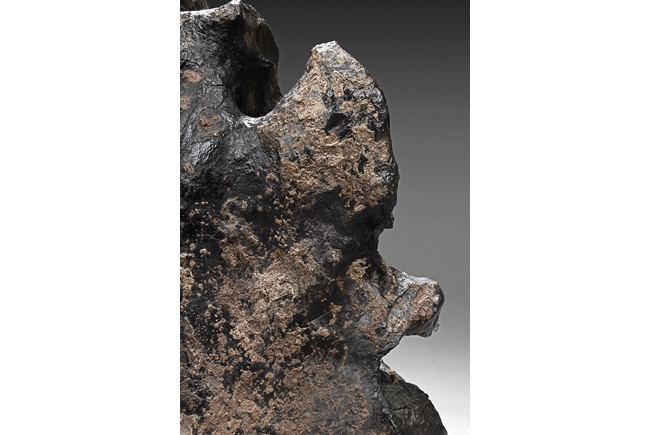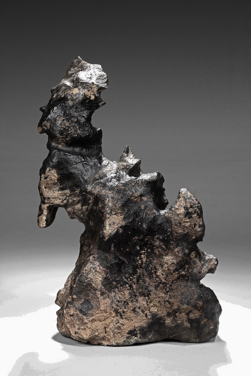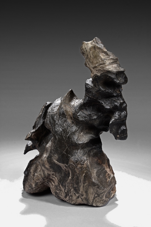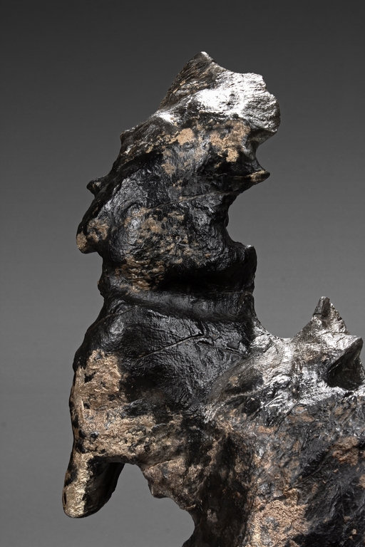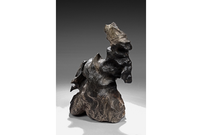 The Lingbi rock has a naturally irregular outline, rising from a broad horizontal base to form a head, the stone is of richly wrinkled black texture and luster.