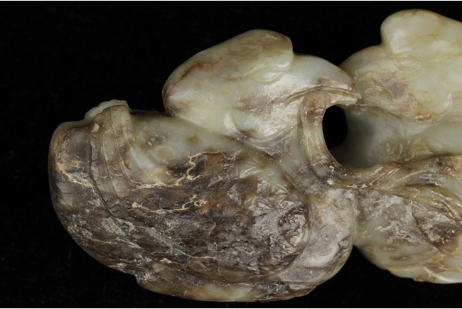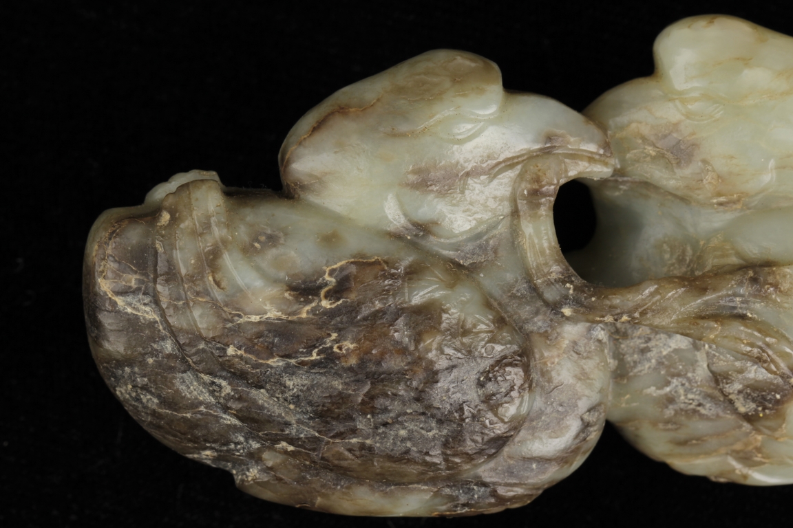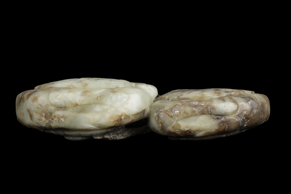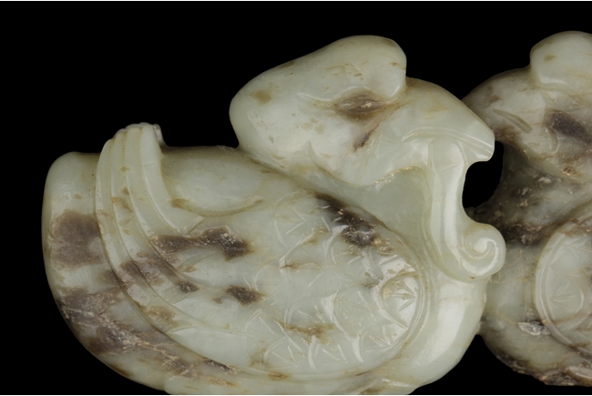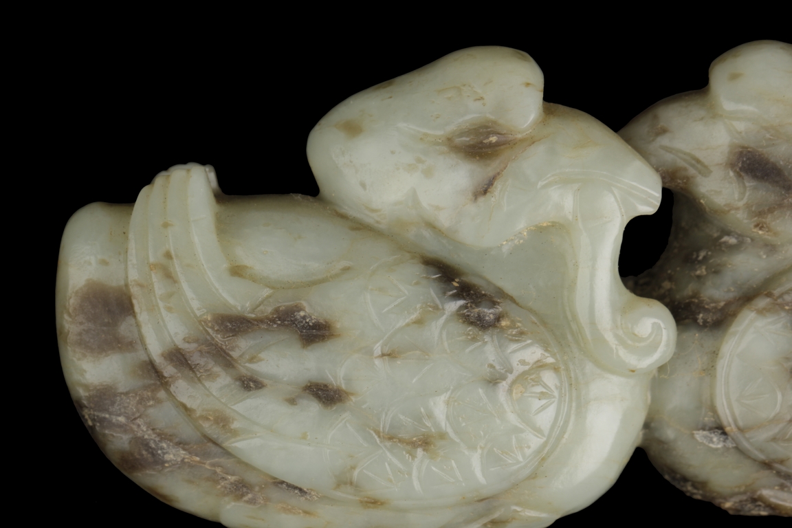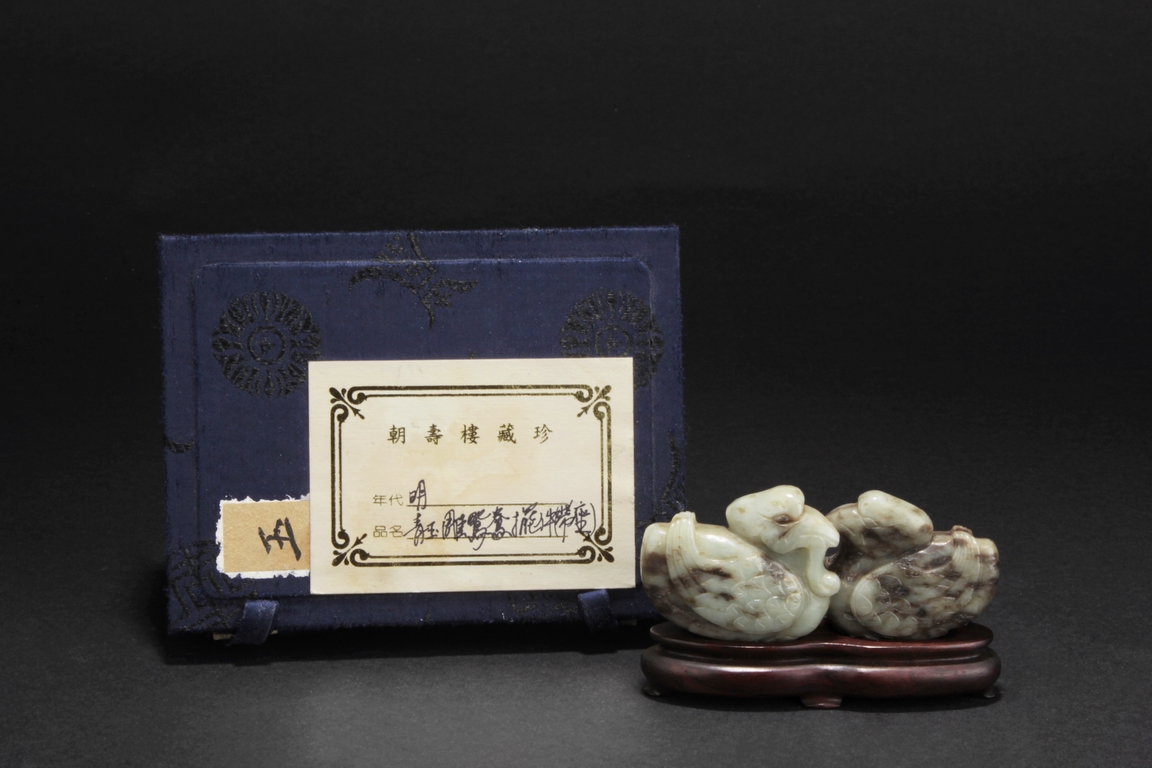 The figure depicts two mandarin ducks, wings on the side, swimming facing each other in close proximity. The stone of pale celadon color, with dark and brown markings. Includes stand. Ming Dynasty period.