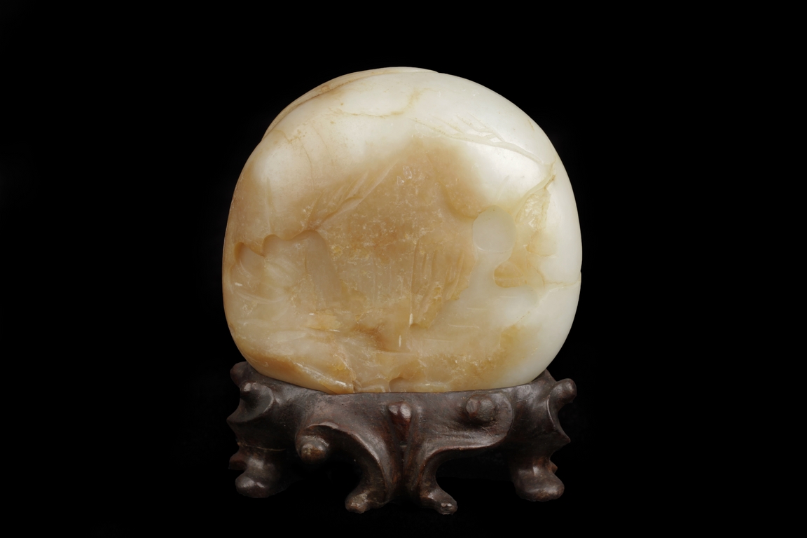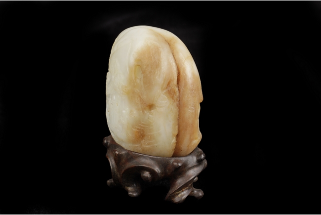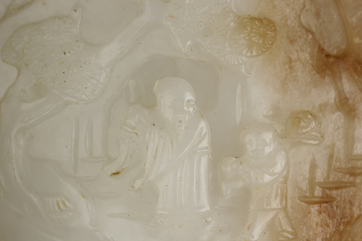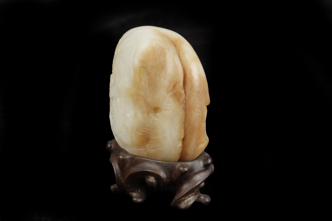 The carving depicts an elder and a child walking in a pine tree path beneath a mountain, the reverse carved with bamboo forest and stones. The stone of white color with russet patches, the side-center with natural line. Includes wooden stand. Ming Dynasty period.