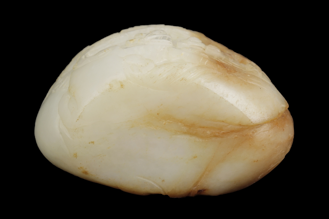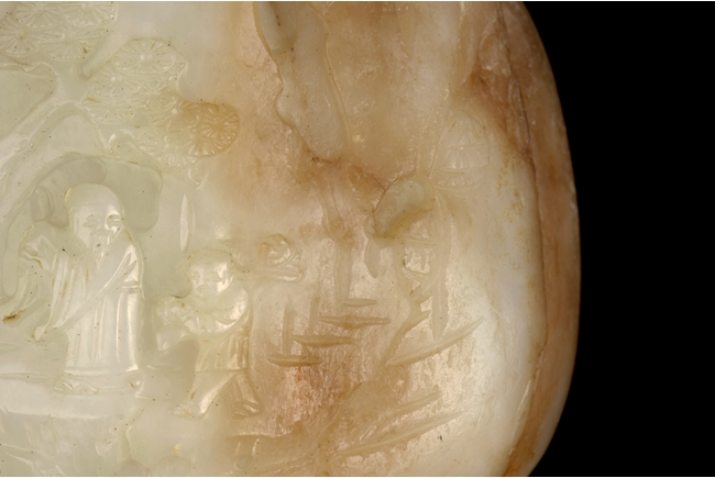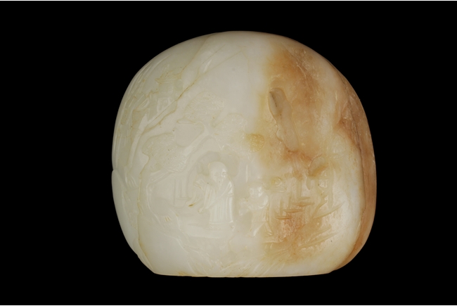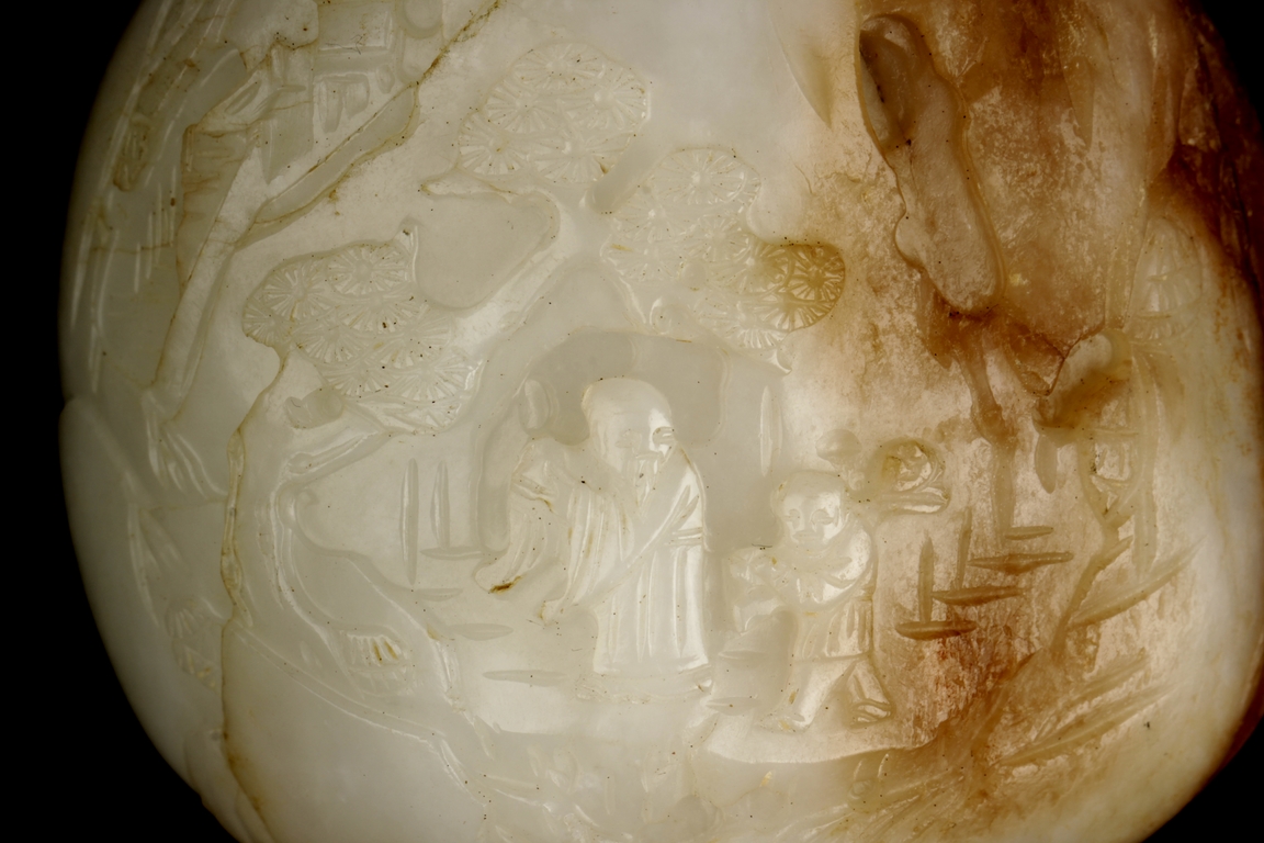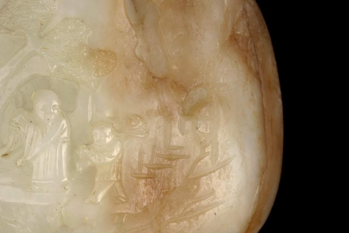 The carving depicts an elder and a child walking in a pine tree path beneath a mountain, the reverse carved with bamboo forest and stones. The stone of white color with russet patches, the side-center with natural line. Includes wooden stand. Ming Dynasty period.