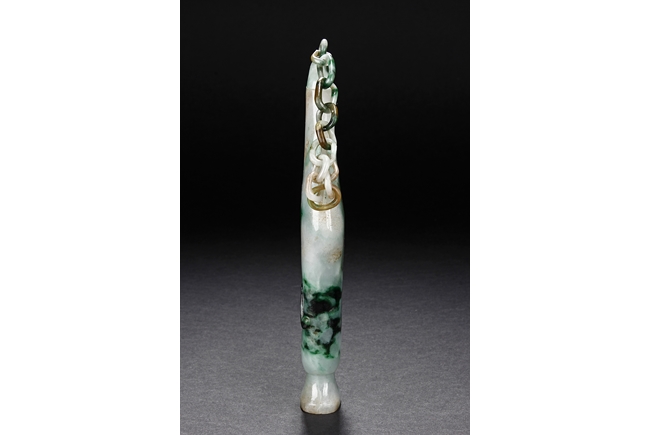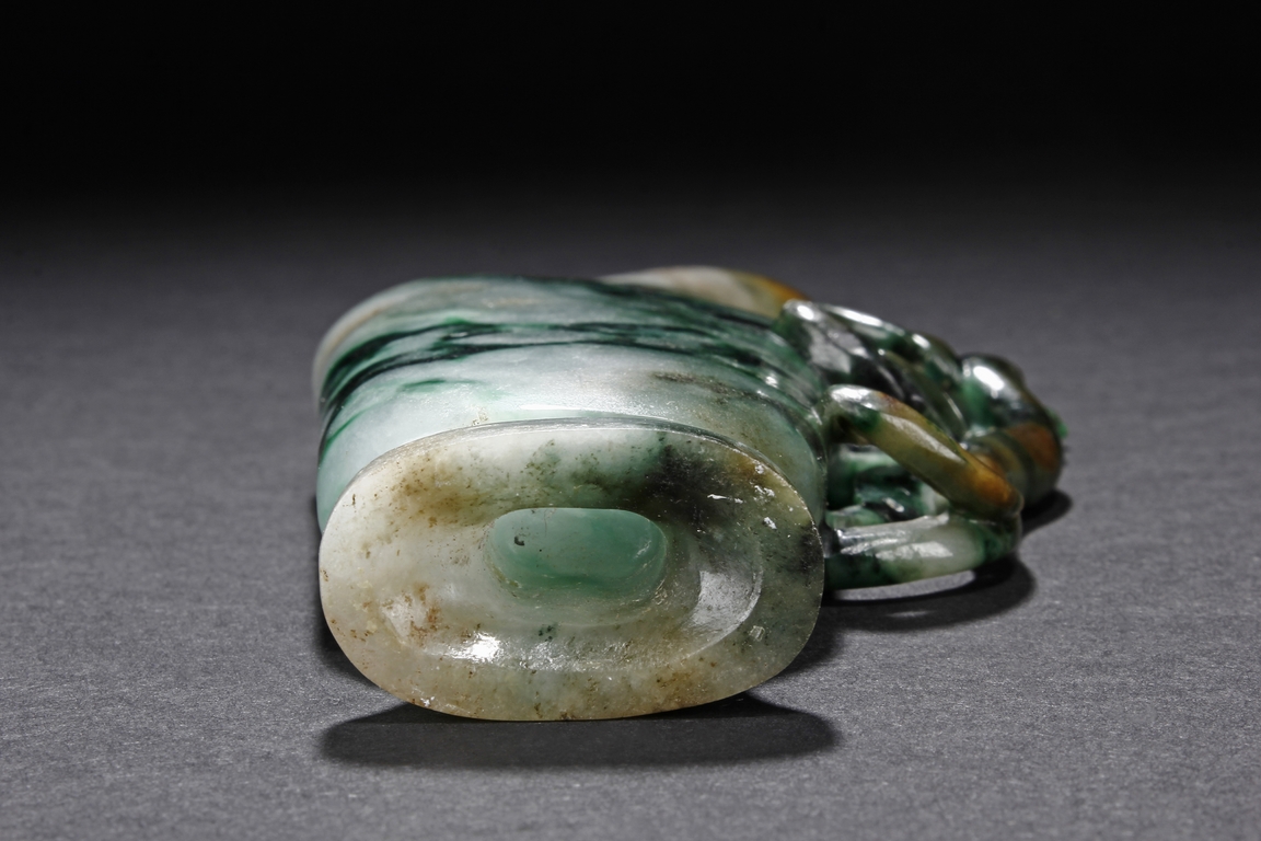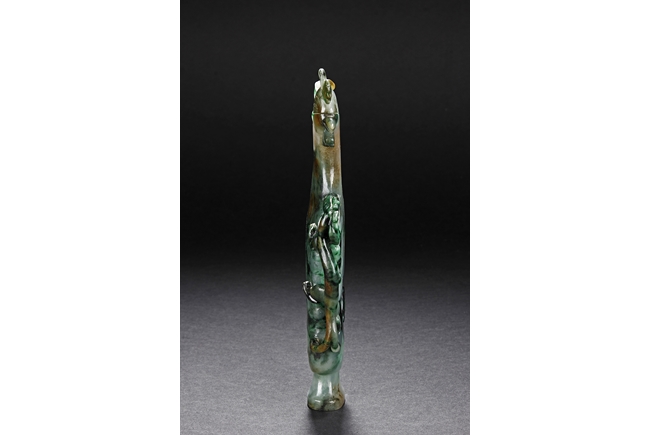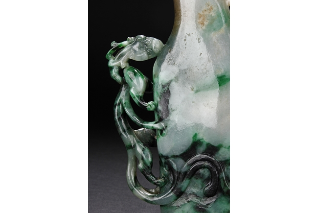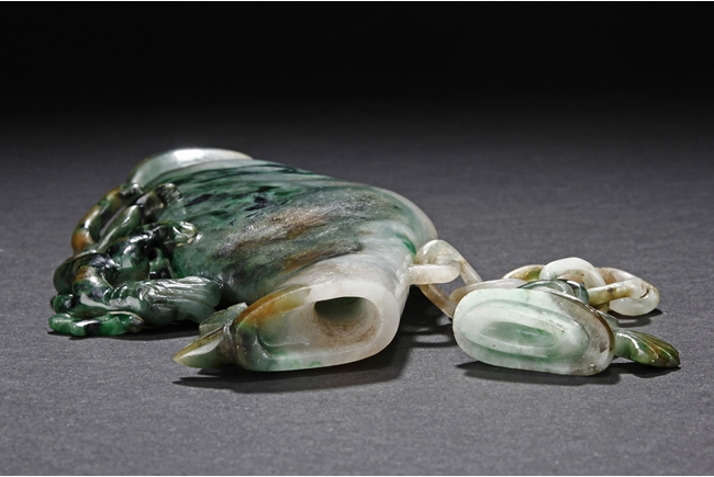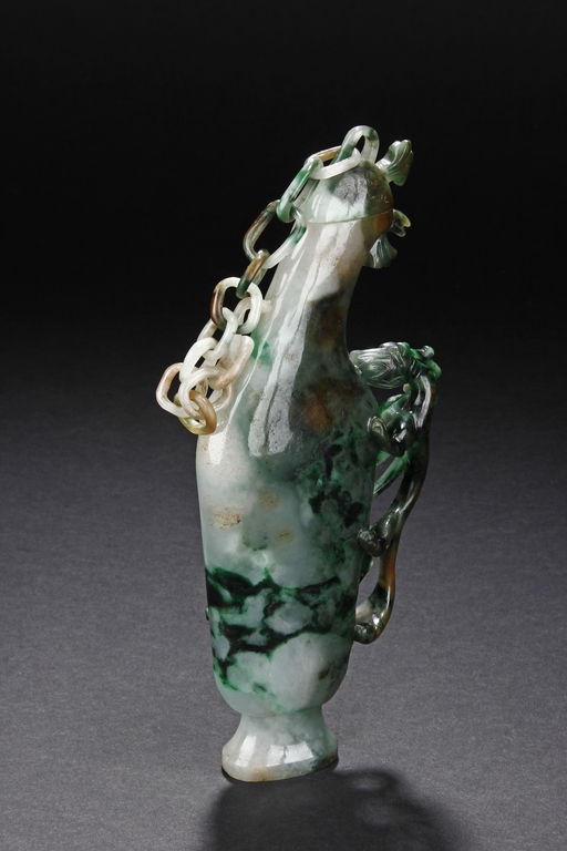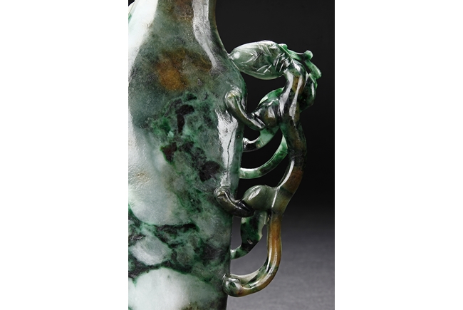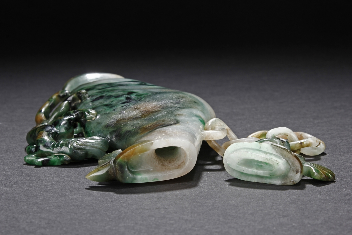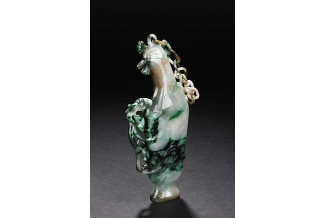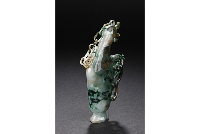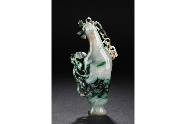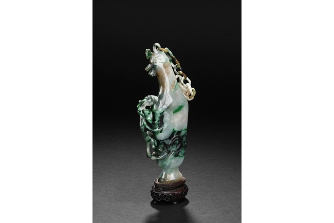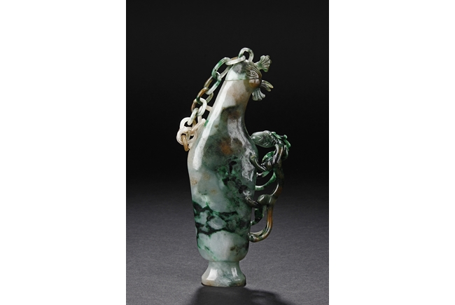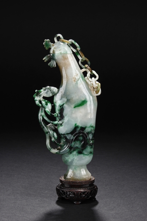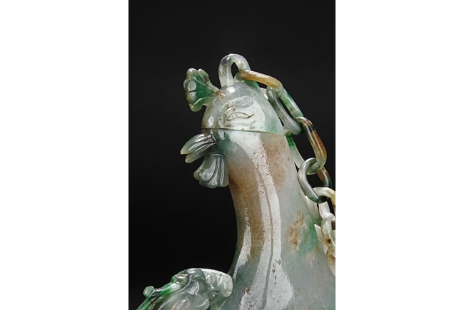 The flattened vase in the form of a phoenix, the neck slanted sideways slightly, looking over a chi-long mounted on the side, the lid attached to the body via delicately carved jadeite chain, the stone is of dark green and white, with occasional russet and translucency.