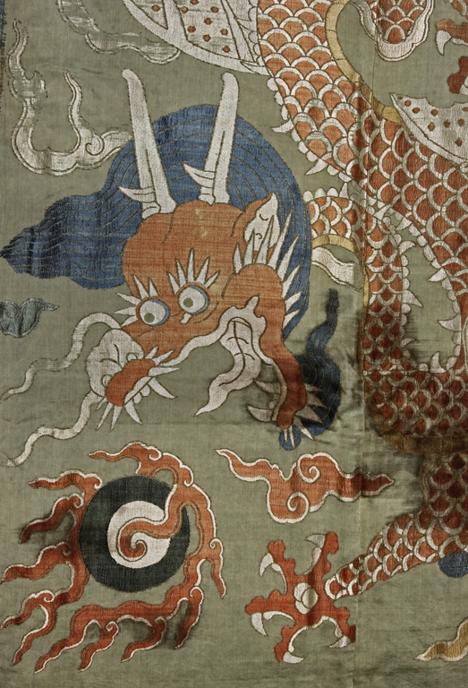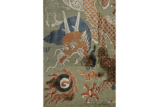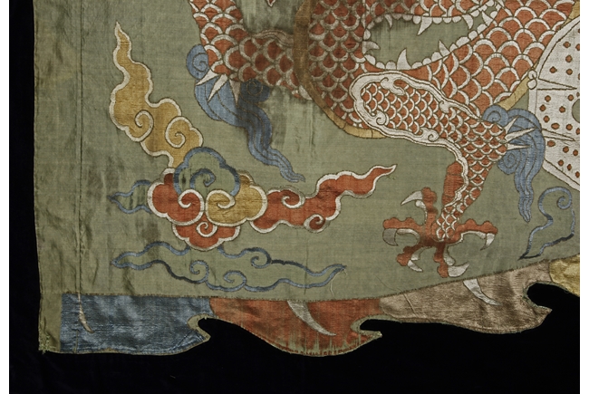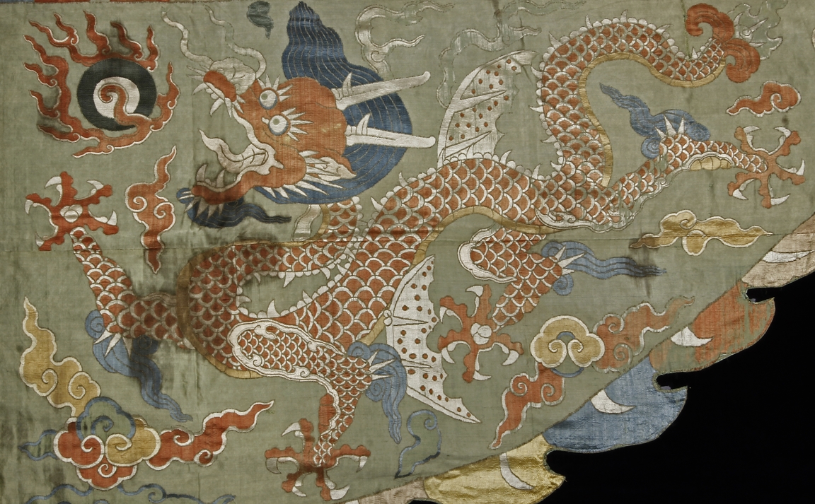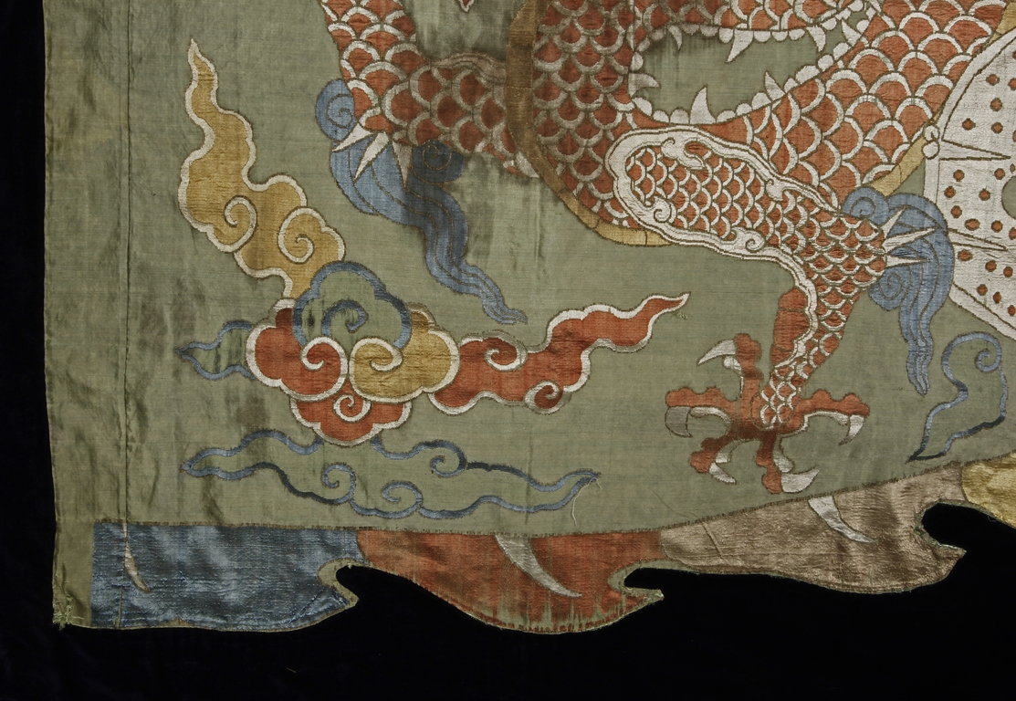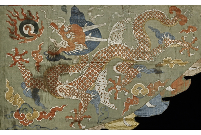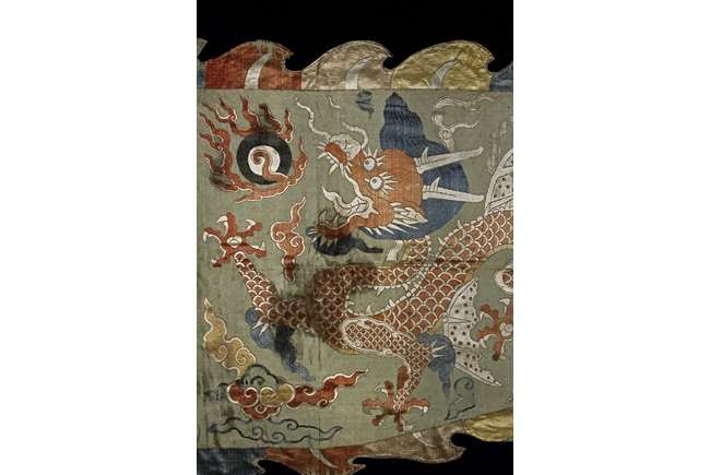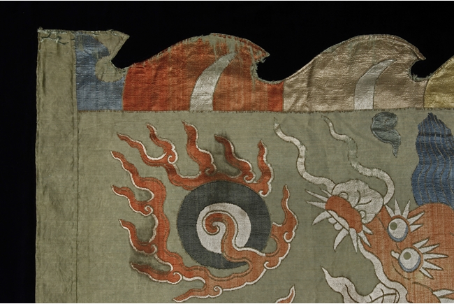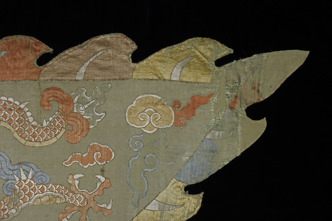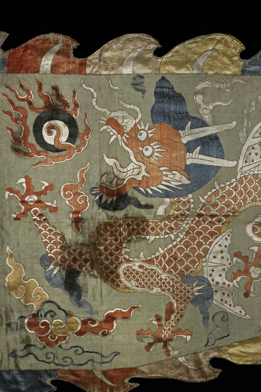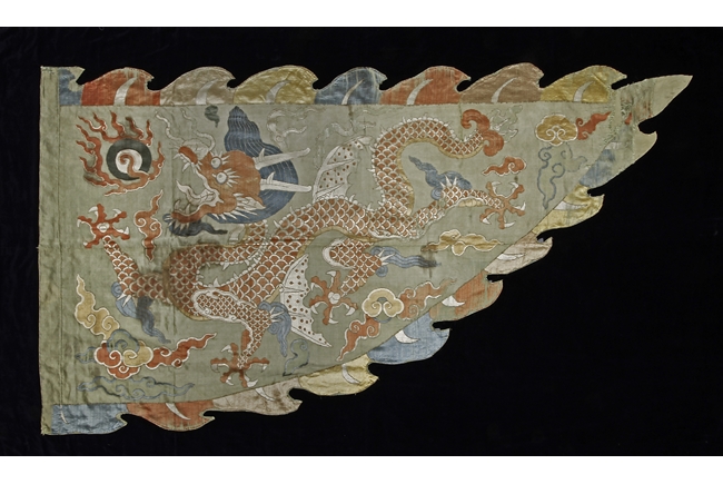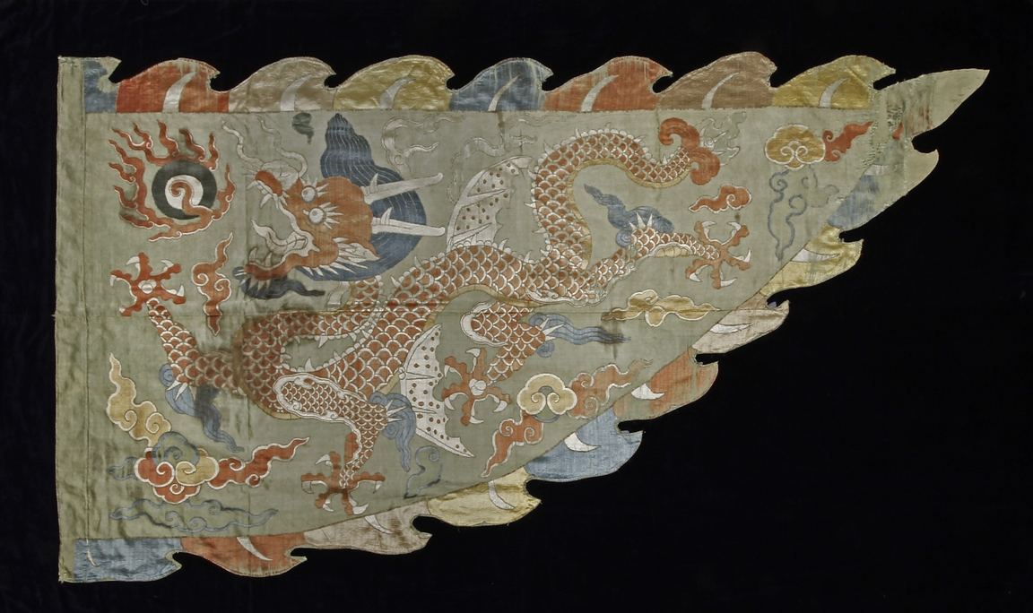 The silk flag sewn to a rectangular black cloth into a banner, depicting a five clawed dragon chasing after flaming pearl amidst clouds, the triangular flag's sides with colored flaming patterns. Ming Dynasty period.