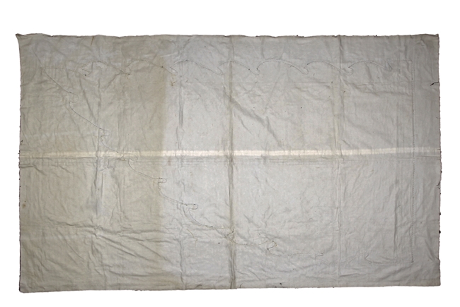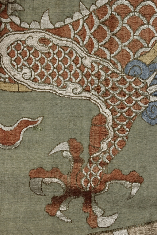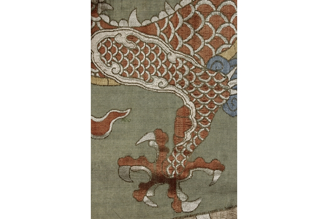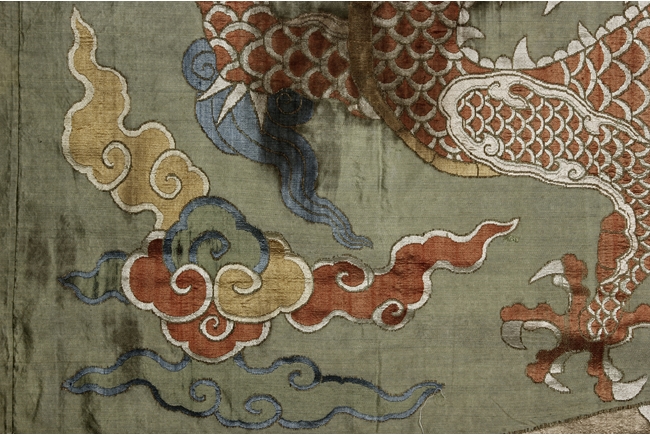 此戰旗為綠色飛魚紋三角形五色戰旗,應是明朝兵部尚書出戰外地路途高舉及鎮守要地城池懸掛之物。據《明史》載:明代飛魚從摩羯紋演變而來,上半身與龍蟒相同,區別於腹部有一對飛翼,腰部以下為魚尾。此戰旗飛魚腹部一對白色的飛翼,尾端魚尾向兩側張開,雲紋環繞飛魚四周,表達從天而降,威力無比。以彰顯明朝政府之強大。戰旗由於使用環境,保存下來的甚少,查閱歷史拍賣紀錄也少見戰旗,屬具有歷史與藝術價值的收藏品。