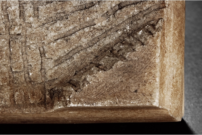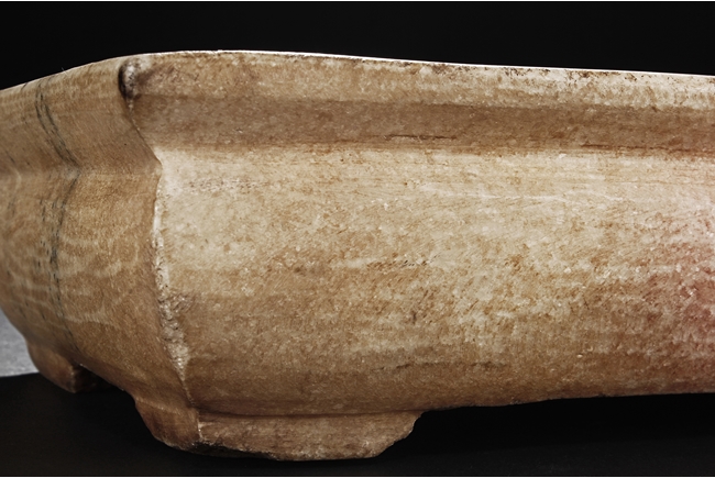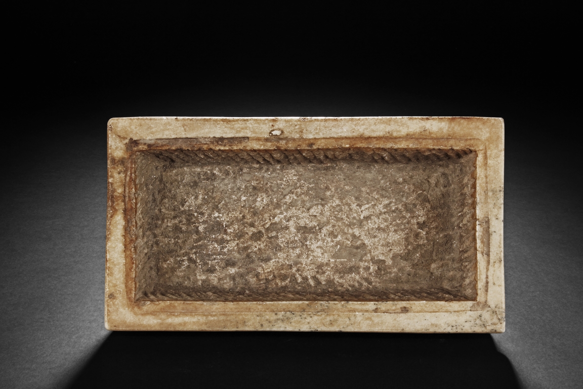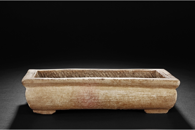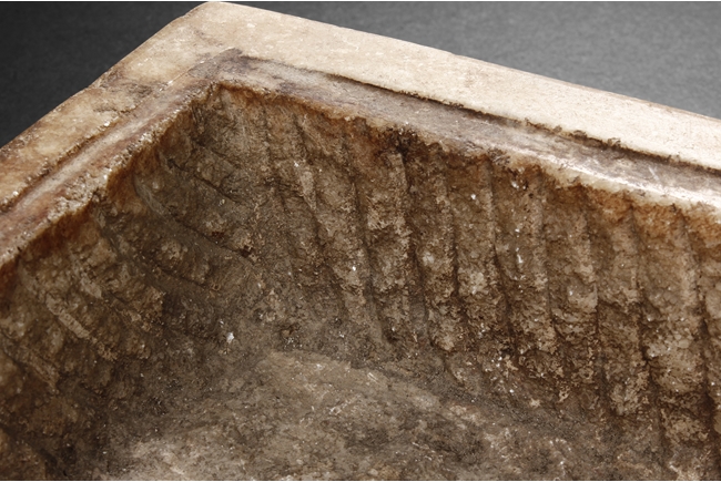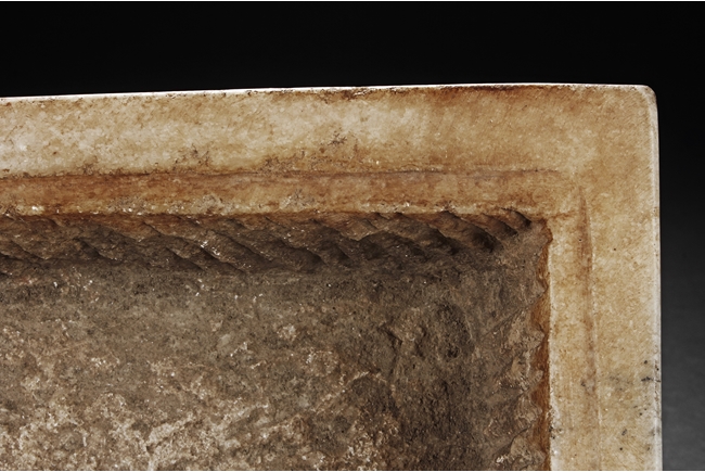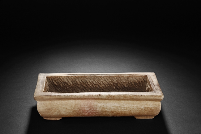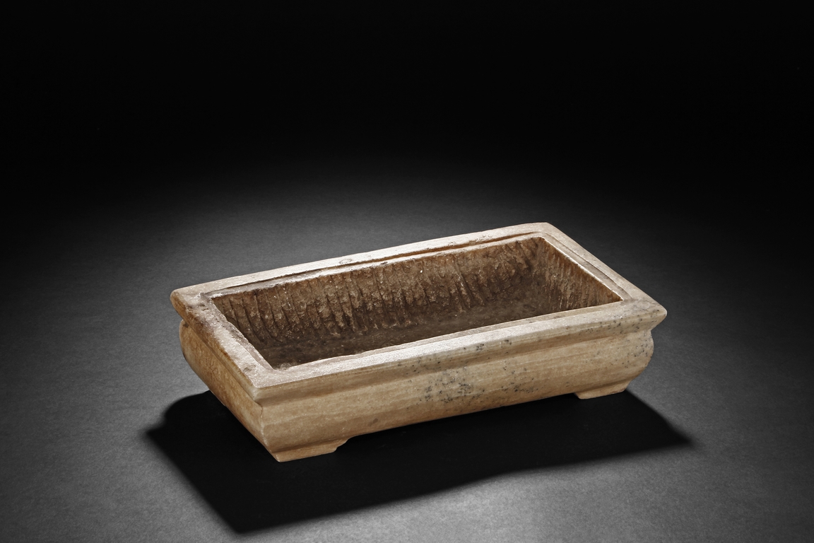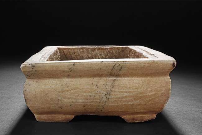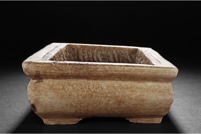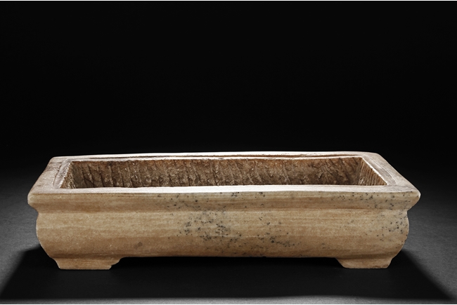 Of rectangular form, the narcissus planter stands on four L shaped feet, with flared rim, the exterior with wood-like patterns, and the interior and bottom with lined etches. Qing Dynasty period.
