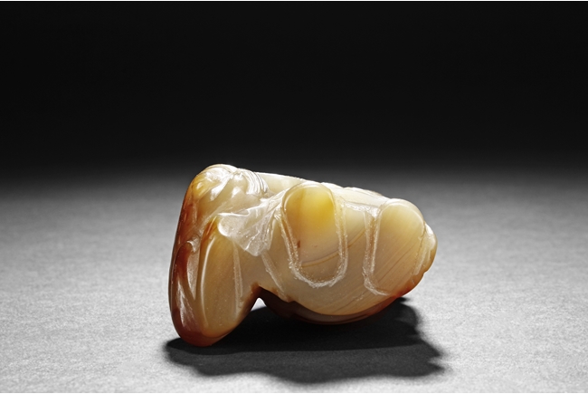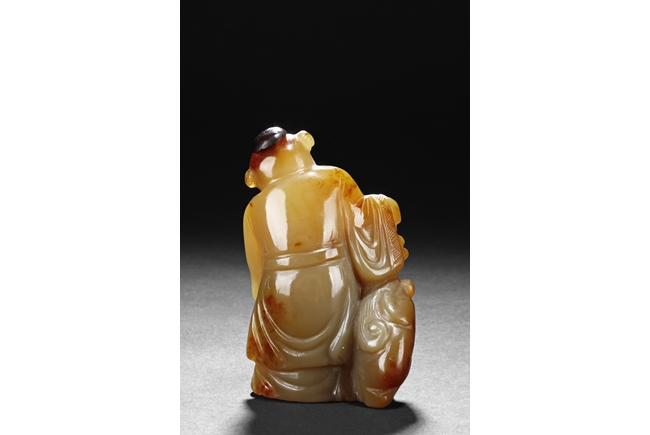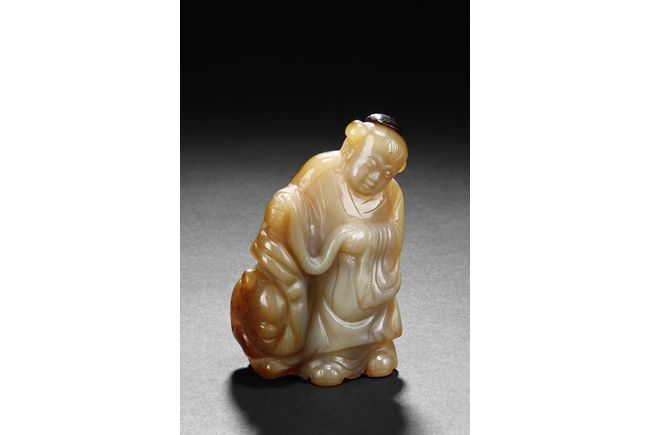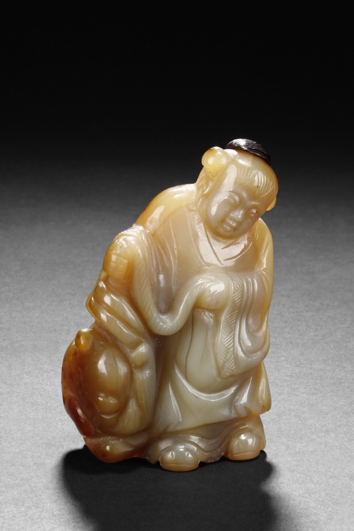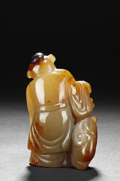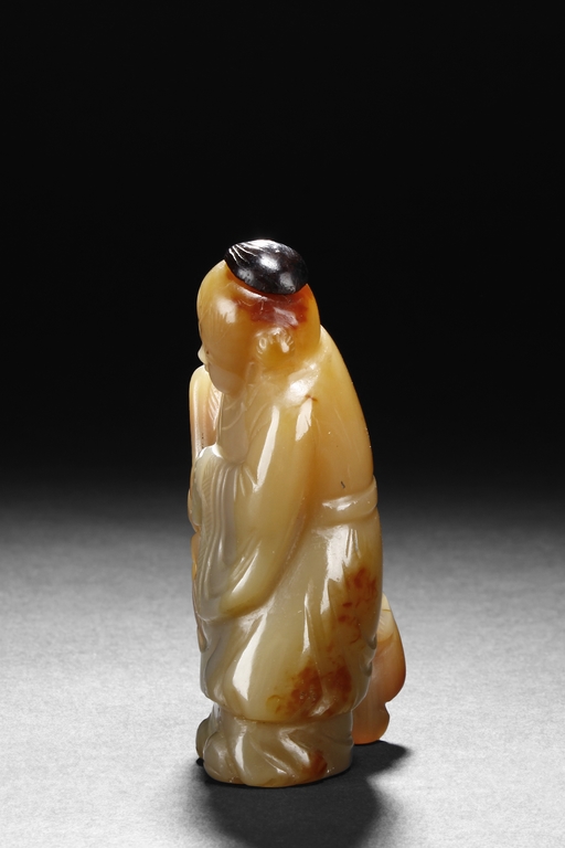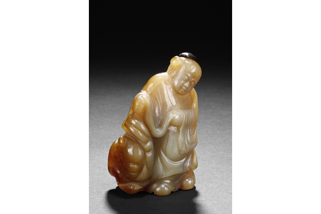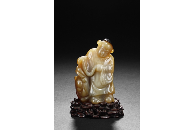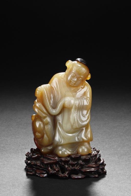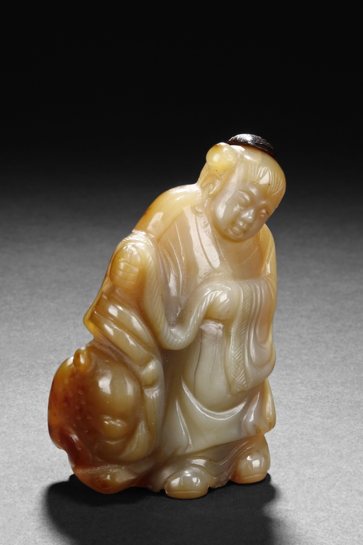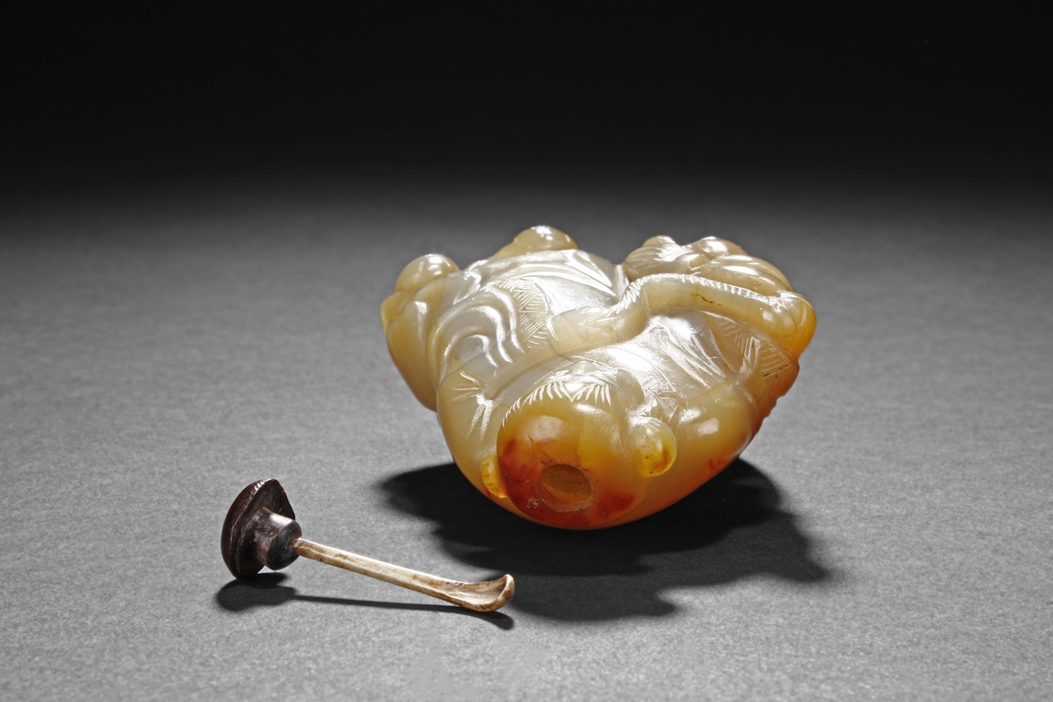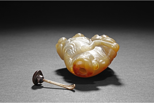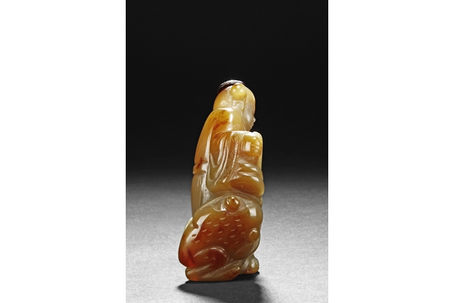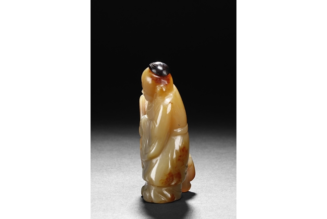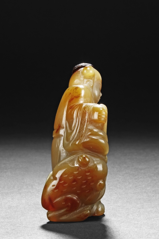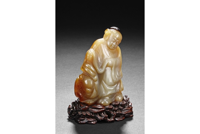 The well carved snuff bottle depicts a serene Liu Hai, holding a string of large coins, leading the golden toad besides him, while standing on top of wood carved pine tree stand, the stone of light brown and white color with translucency, the wooden stopper includes spoon. Qing Dynasty period.