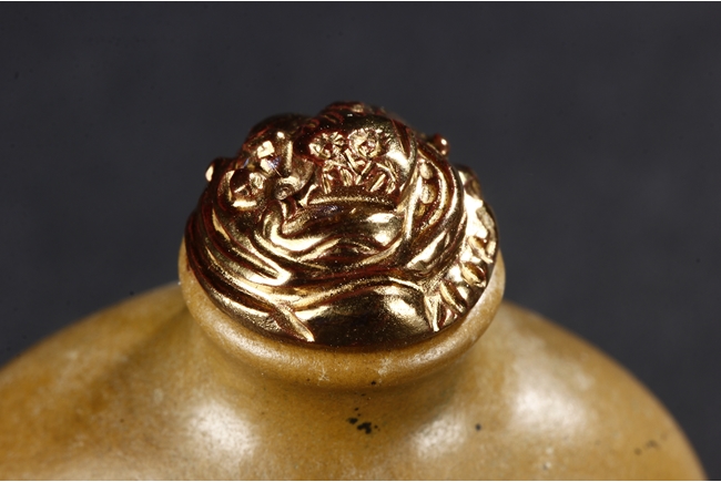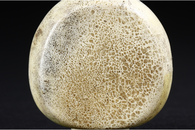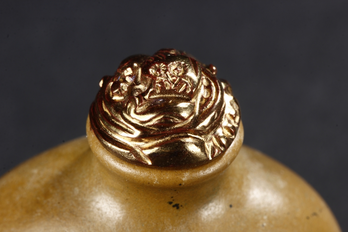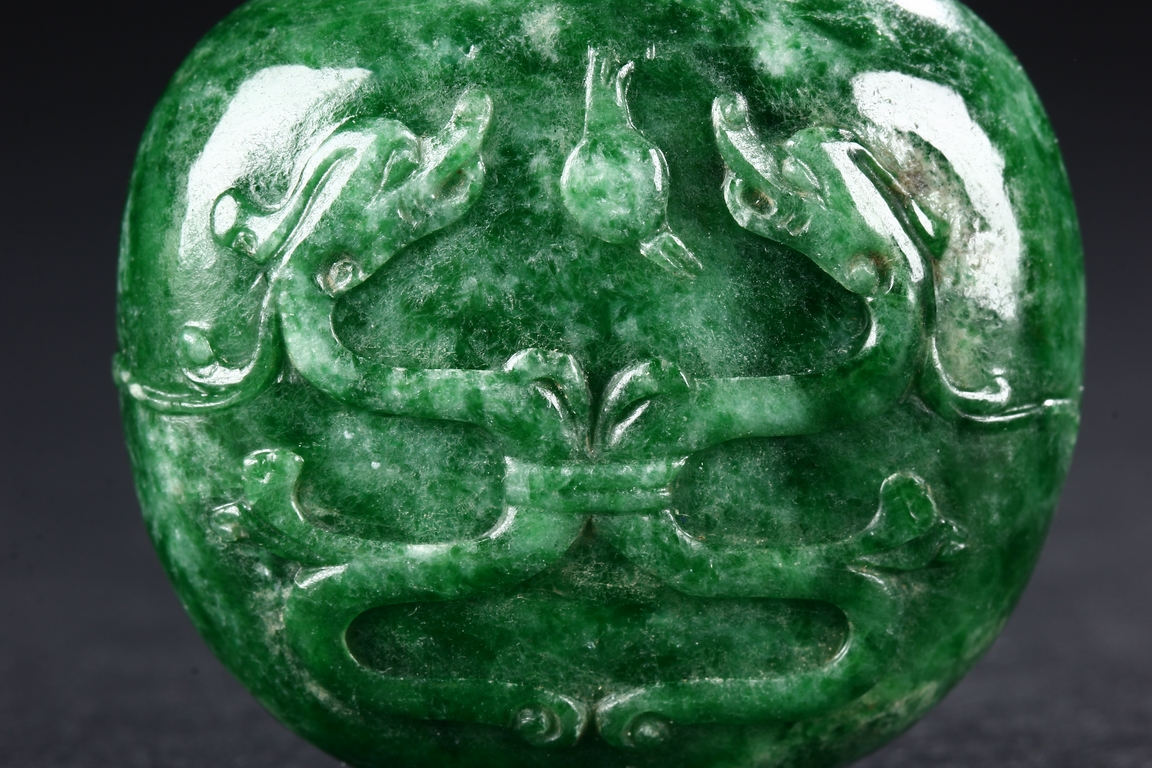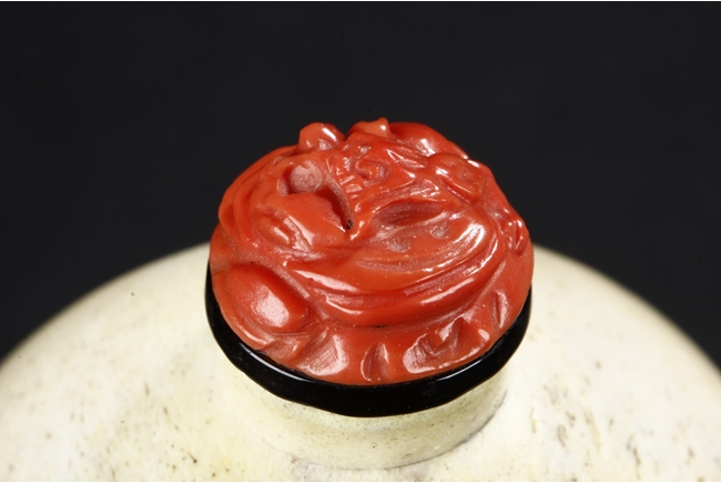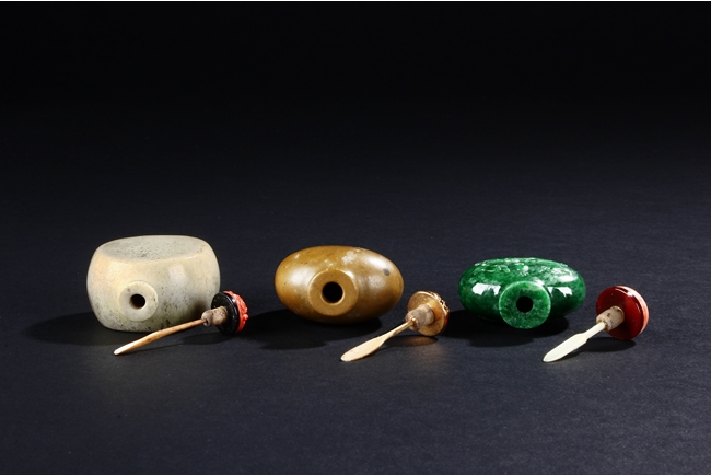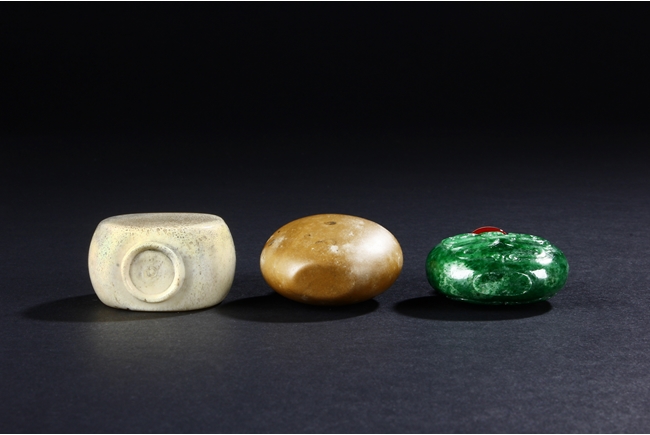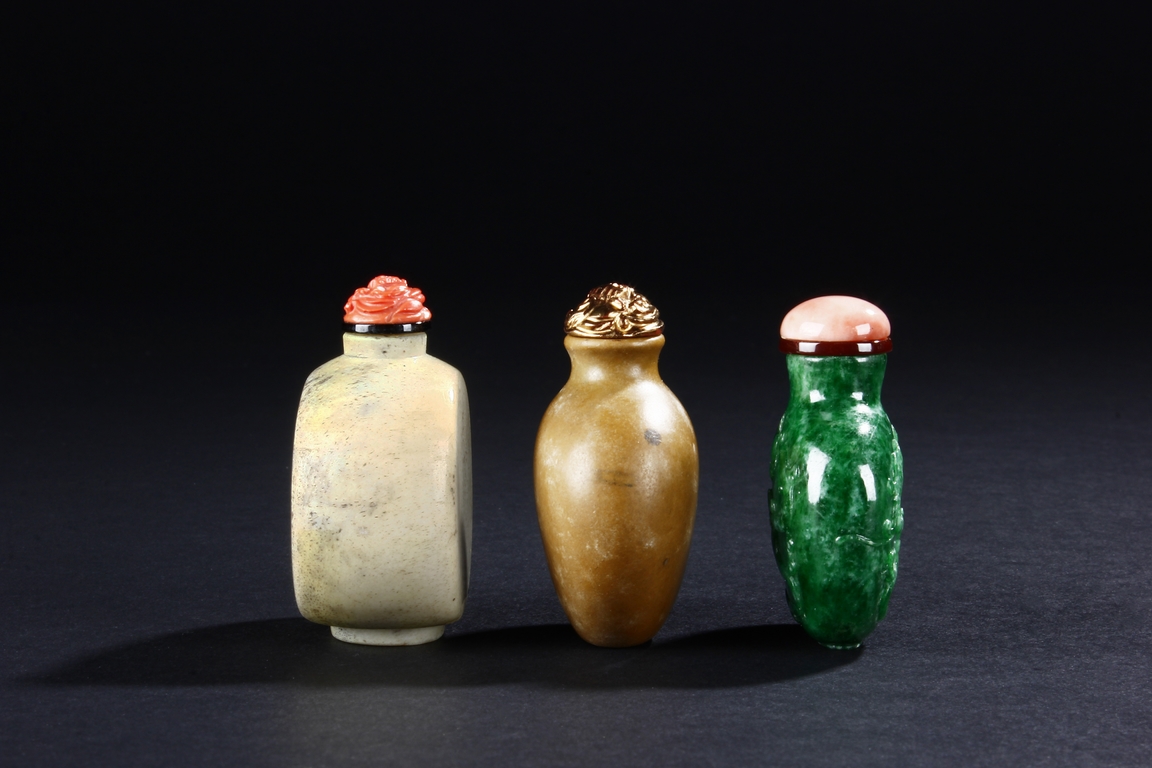 All three snuff bottles are of slightly varied flattened ovoid form. One snuff bottle made from white agate with carved coral stopper, one snuff bottle made from deer antler with golden stopper, and one snuff bottle made from jadeite jade carved with dragons with domed coral stopper.