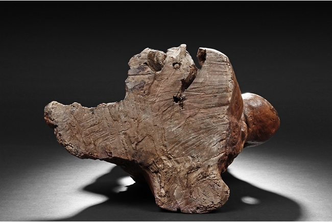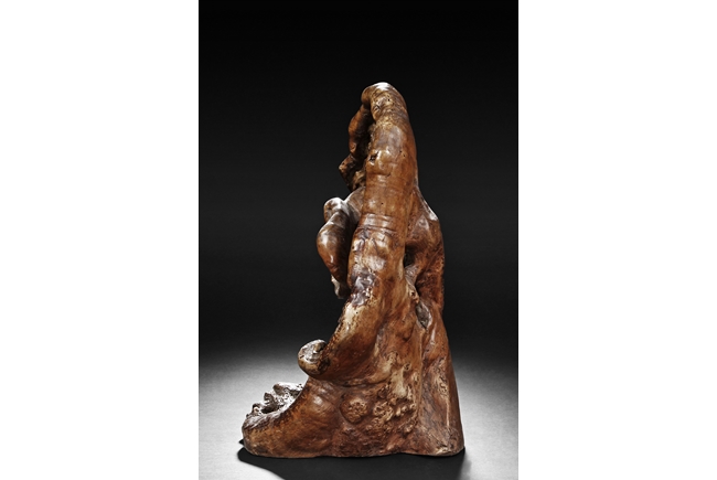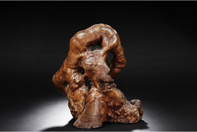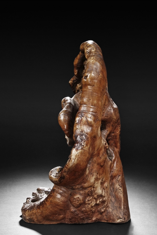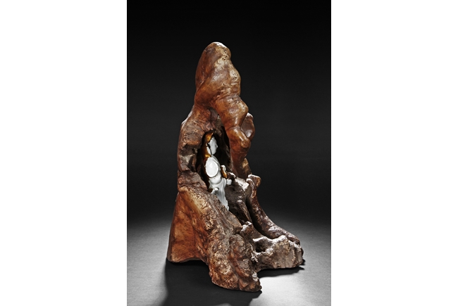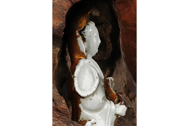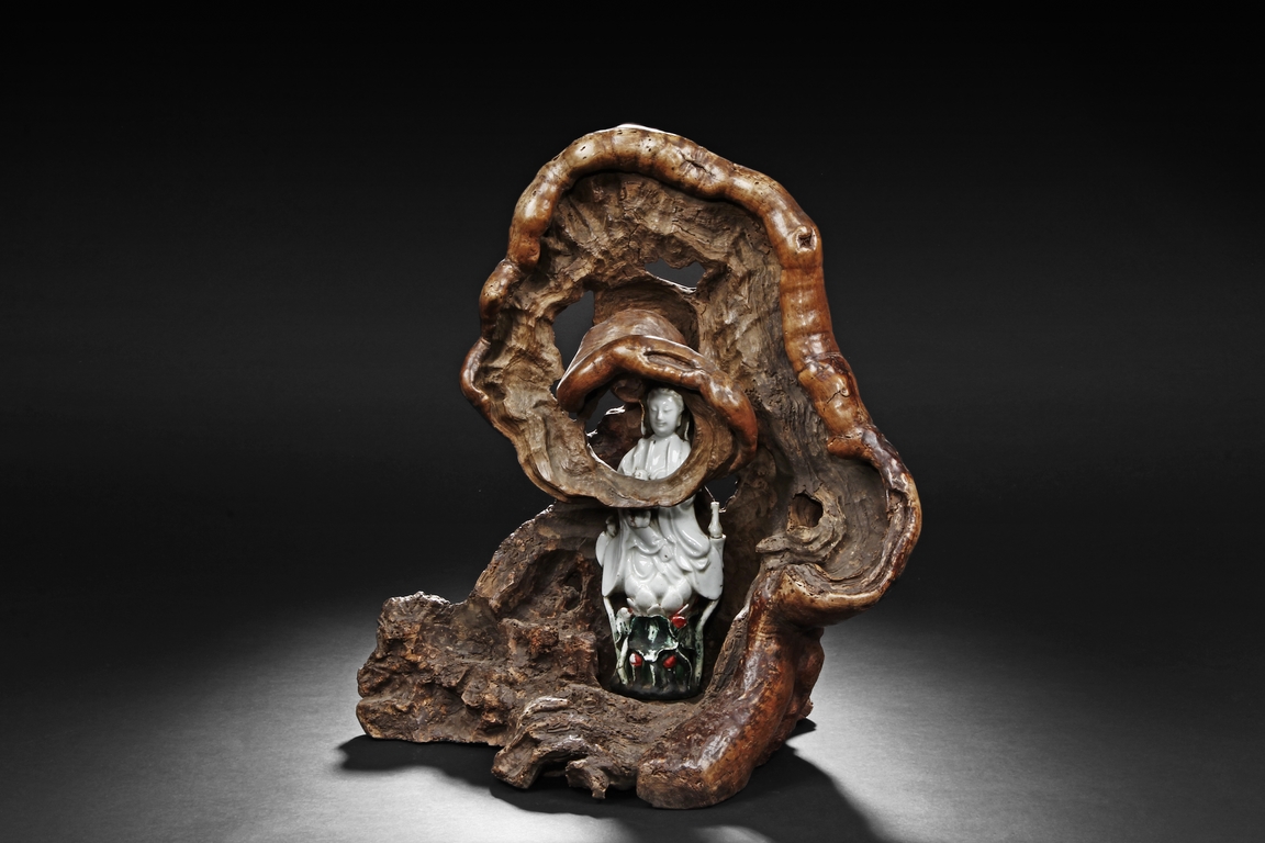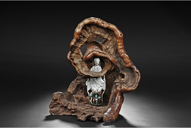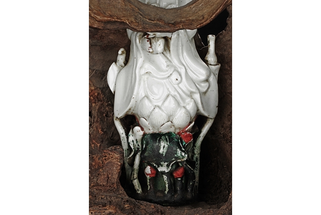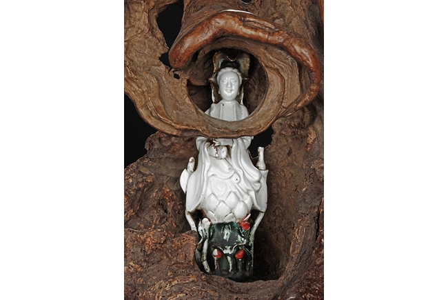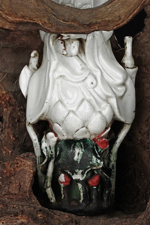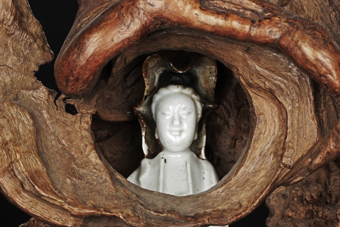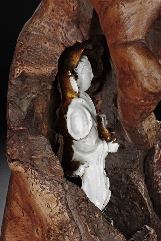 Situated inside a gnarled wood model, the blanc de chine Guanyin statue is supported on a lotus stand with both hands holding a sacred object, the face shown with a serene expression and hairs hidden under veil.