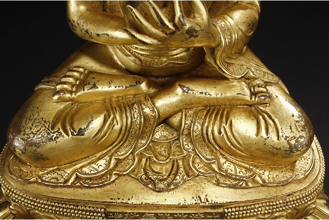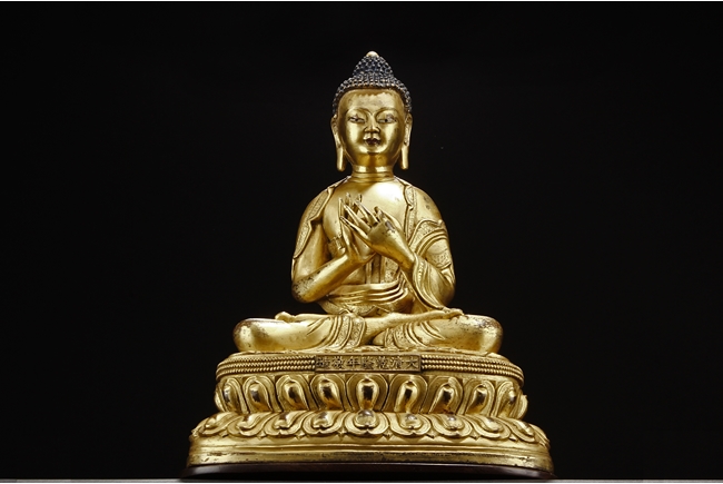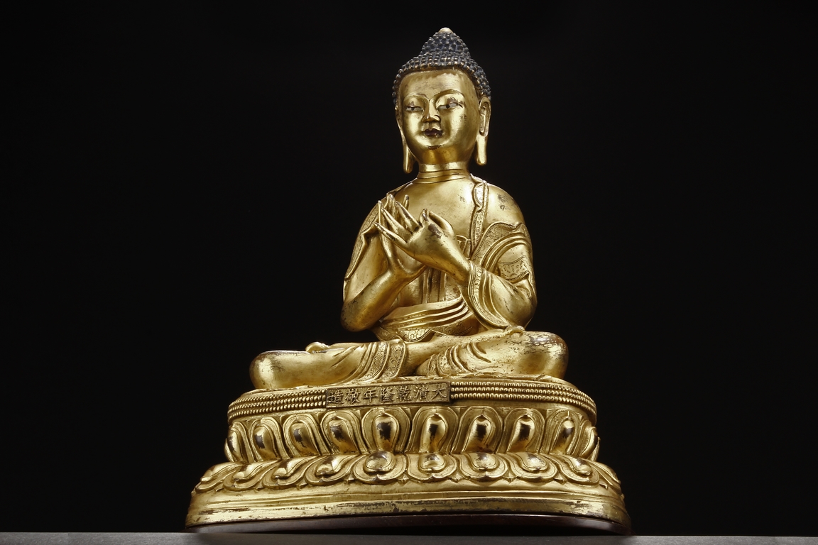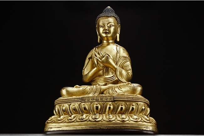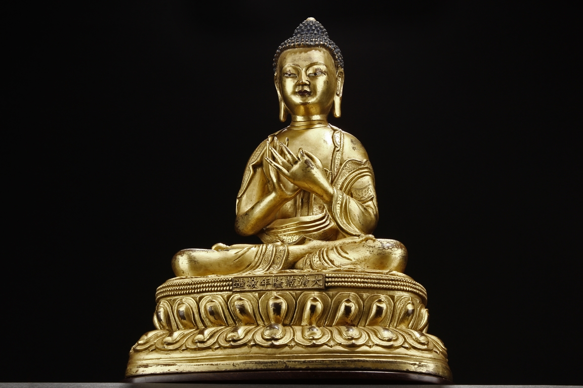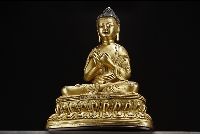 Seated on a double lotus throne in dhyanasana, the Bodhisattva is shown with hands in dharmachakra mudra before chest, and dressed in loose folded robe with incised hems, his face shown with a downcast eyes, flanked by long pendulous earlobes, and surmounted by a prominent ushinisha. The front side of the base is cast with seven character 'QIANLONG' mark. Qing Dynasty period.
