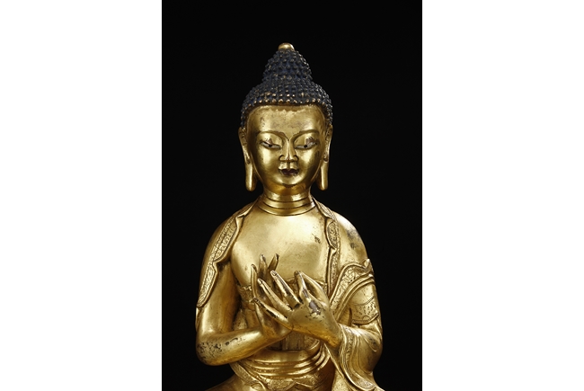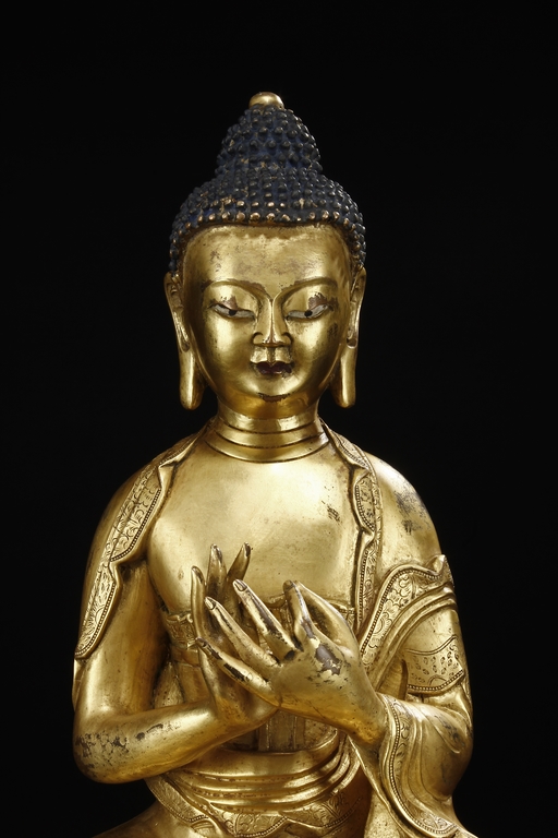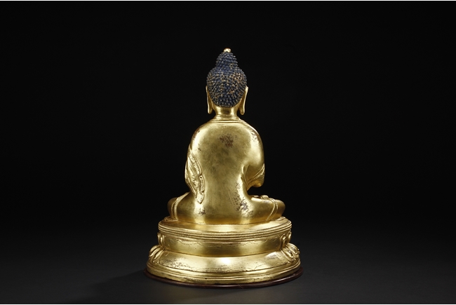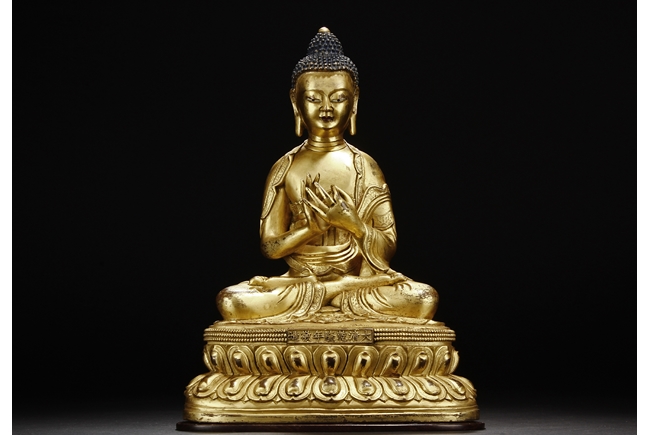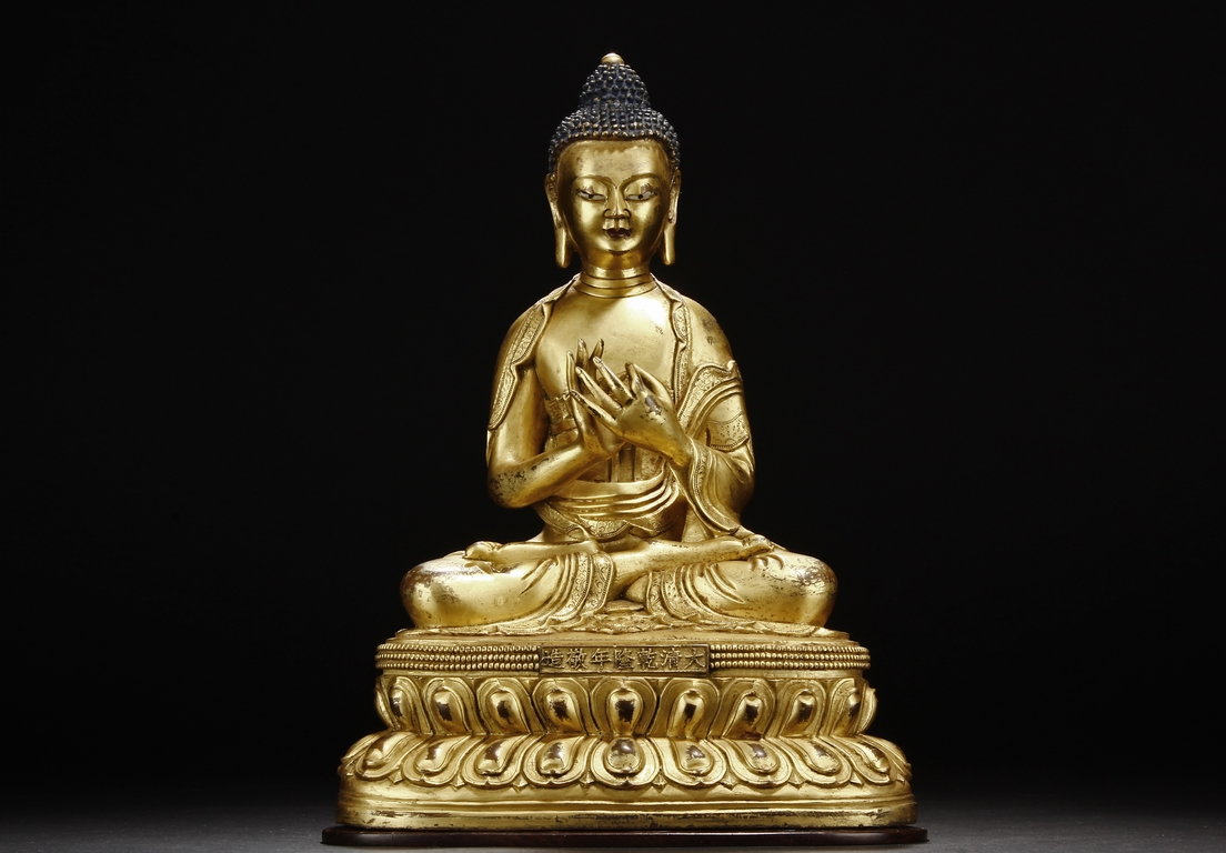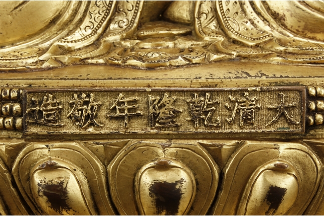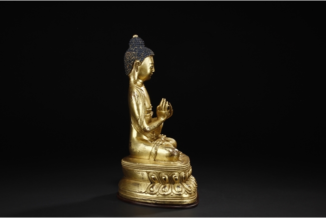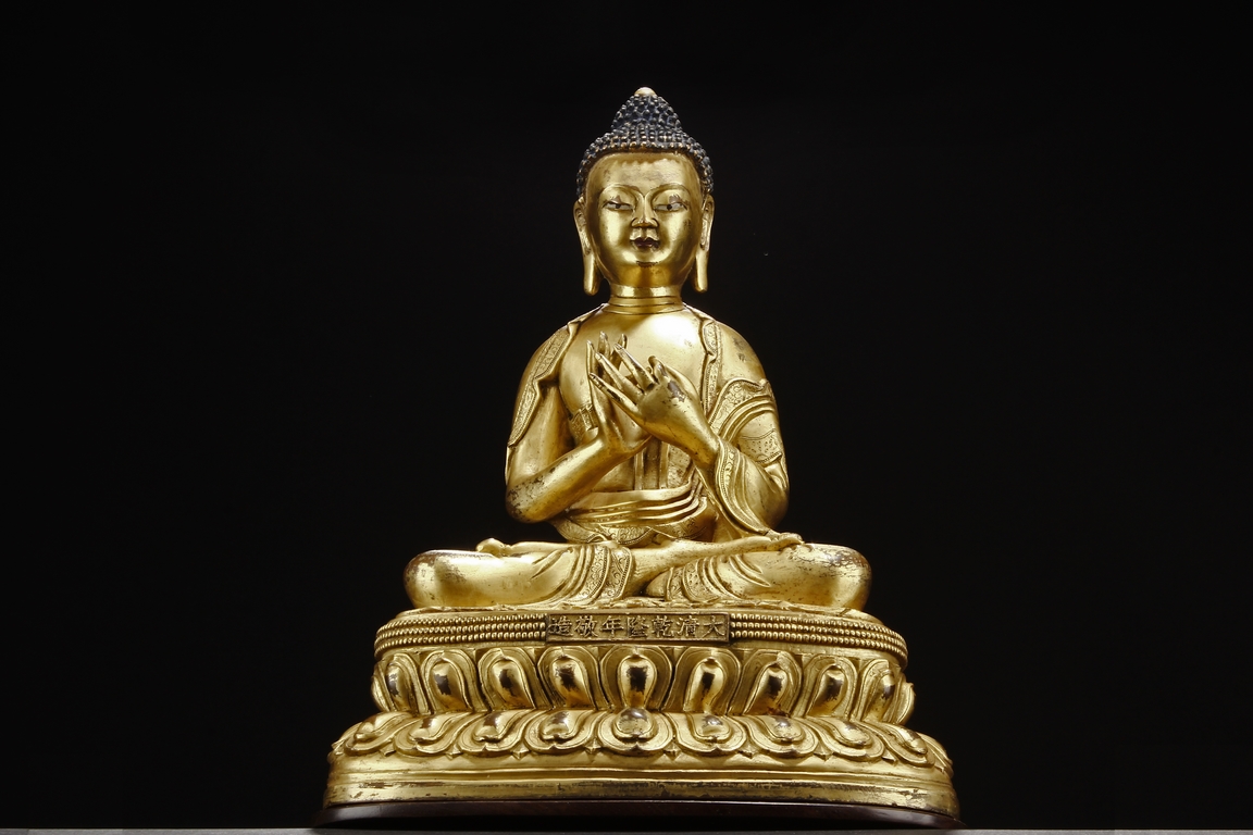 Seated on a double lotus throne in dhyanasana, the Bodhisattva is shown with hands in dharmachakra mudra before chest, and dressed in loose folded robe with incised hems, his face shown with a downcast eyes, flanked by long pendulous earlobes, and surmounted by a prominent ushinisha. The front side of the base is cast with seven character 'QIANLONG' mark. Qing Dynasty period.
