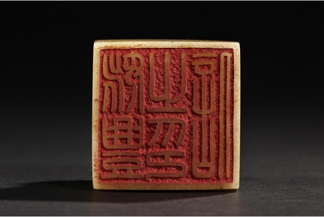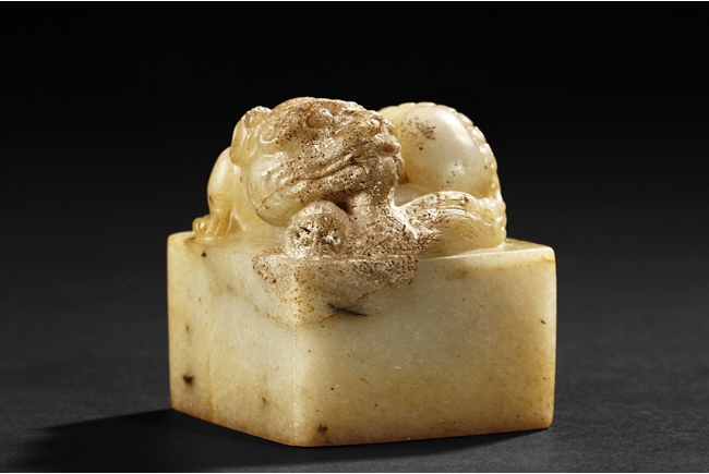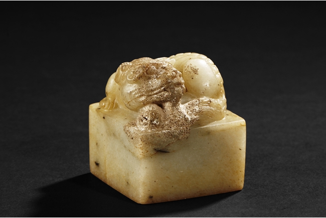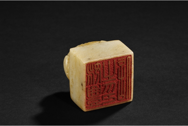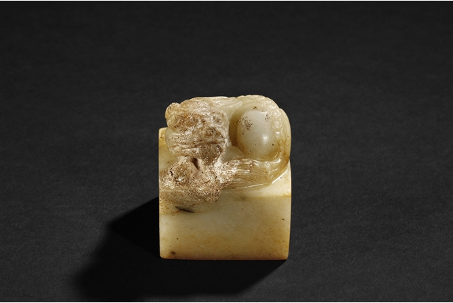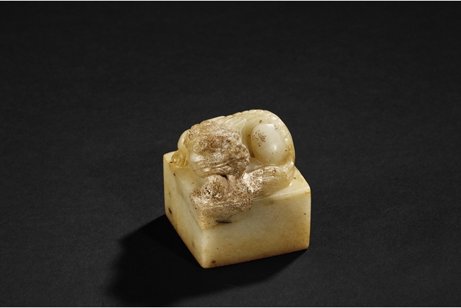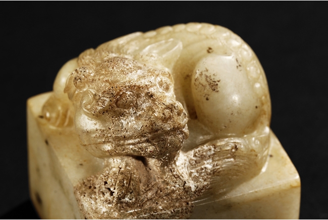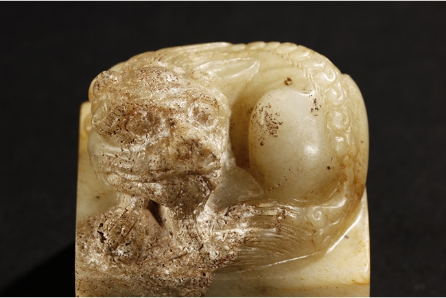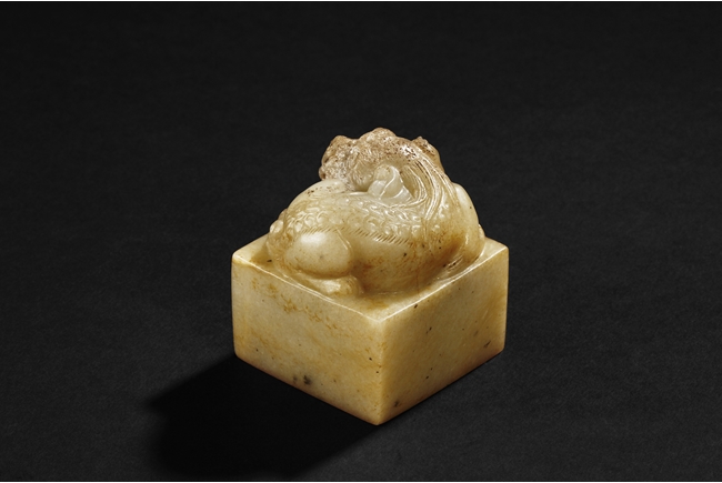 The square seal carved with a recumbent mythical lion on top, with head turned sideways and slightly upwards, the bottom carved with five Chinese characters. The stone is of yellow and russet tone.