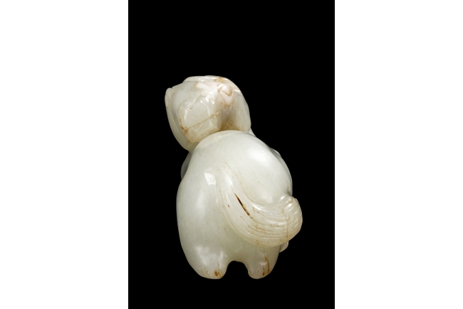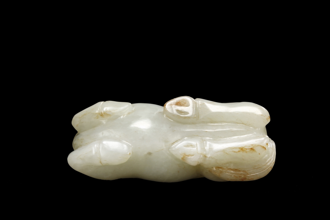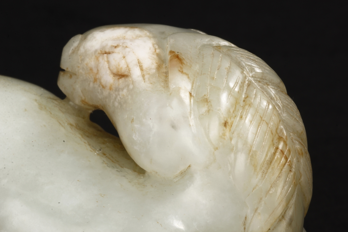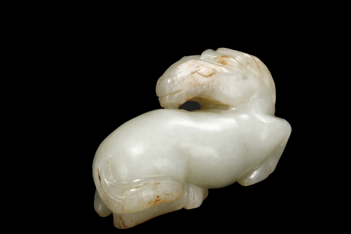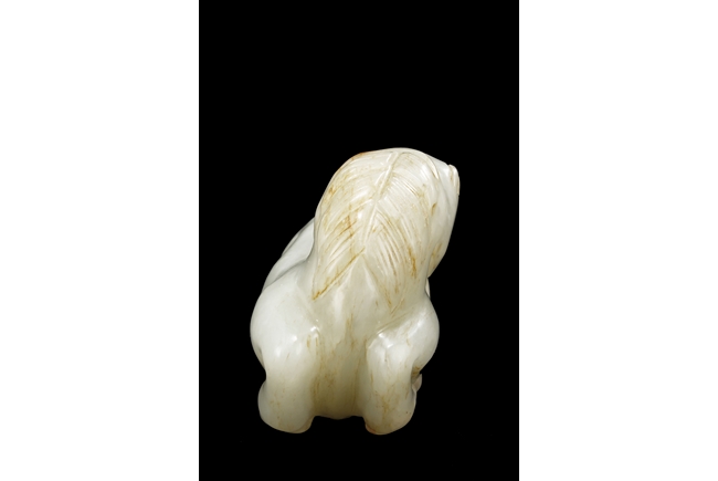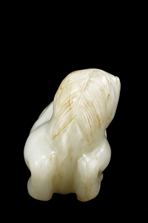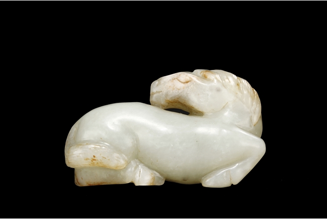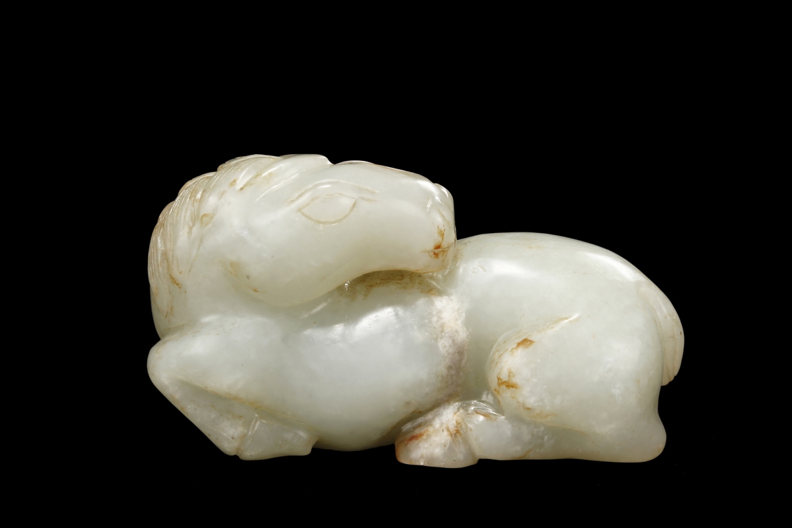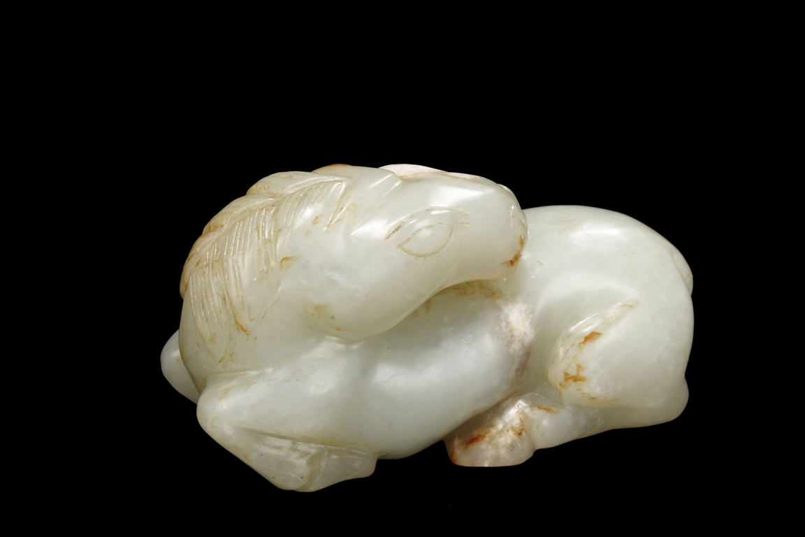 The white jade recumbent horse is modelled with its head turning back facing the rear, with the mane and hair incised with details. The stone is of white tone and russet areas. Qing Dynasty period.
