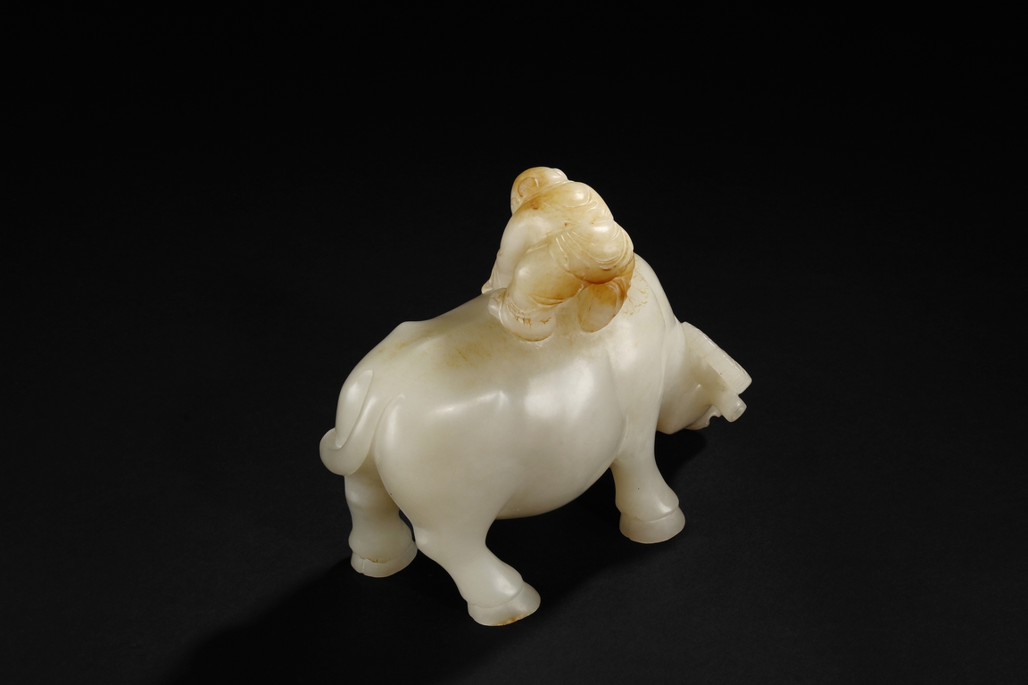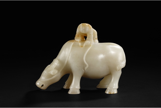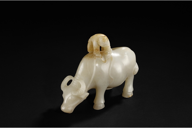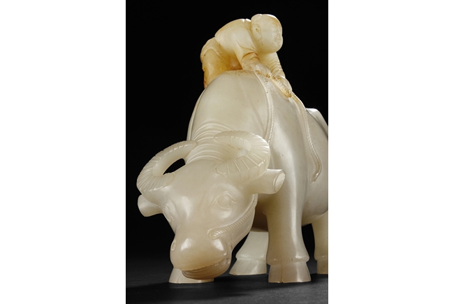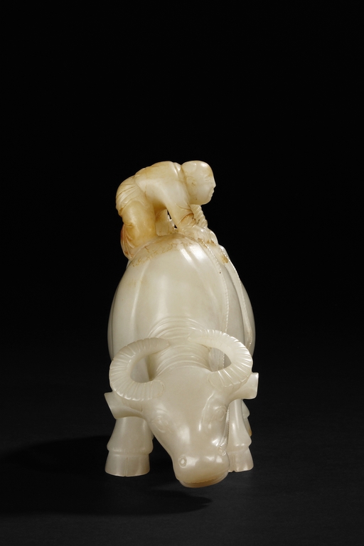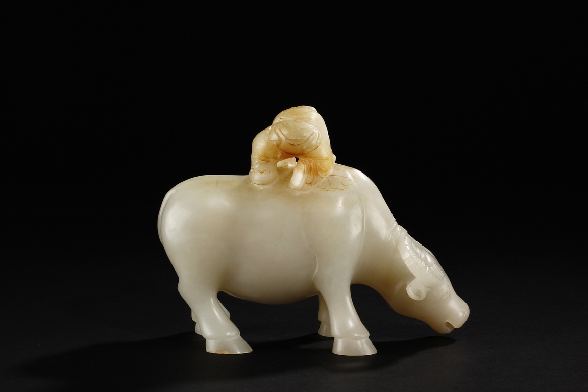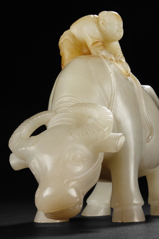 This figural groups is vividly carved with a boy playfully climbing on back of a buffalo standing foursquare, while both hands holding a rope tied from its nostrils. The buffalo is of evenly white tone and the boy is of uneven russet skin.