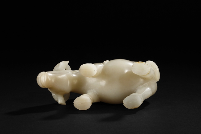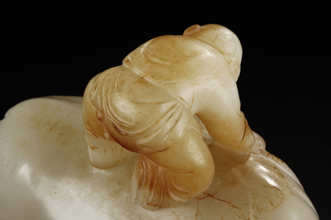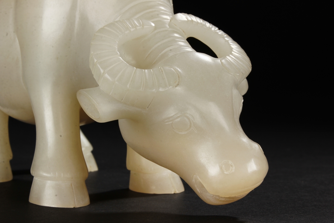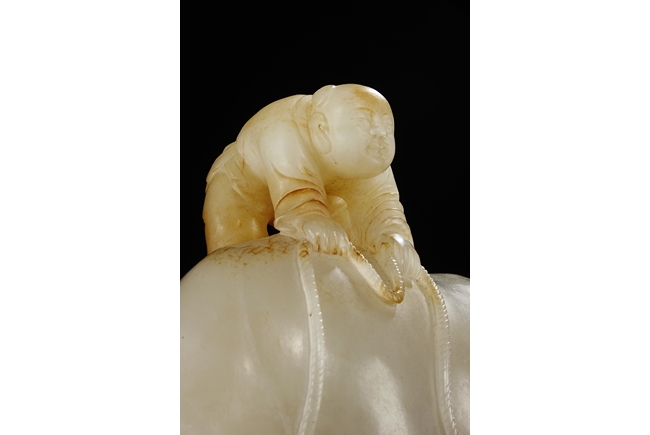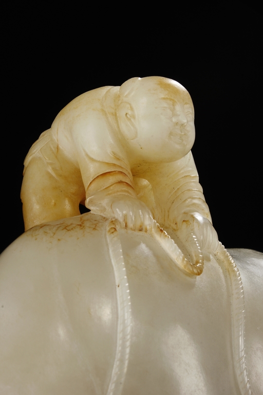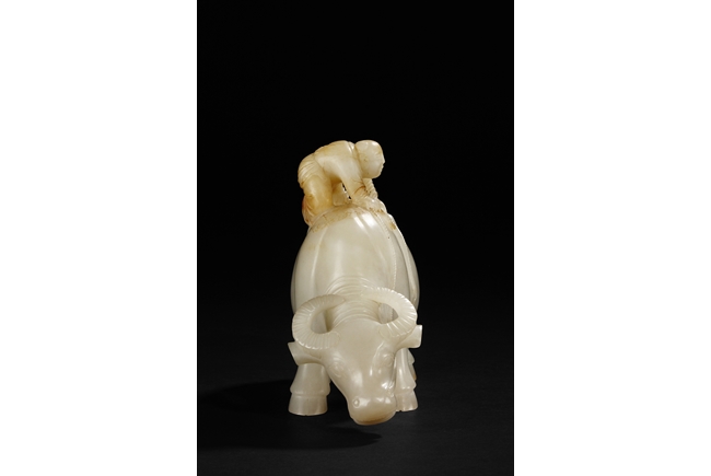 This figural groups is vividly carved with a boy playfully climbing on back of a buffalo standing foursquare, while both hands holding a rope tied from its nostrils. The buffalo is of evenly white tone and the boy is of uneven russet skin.