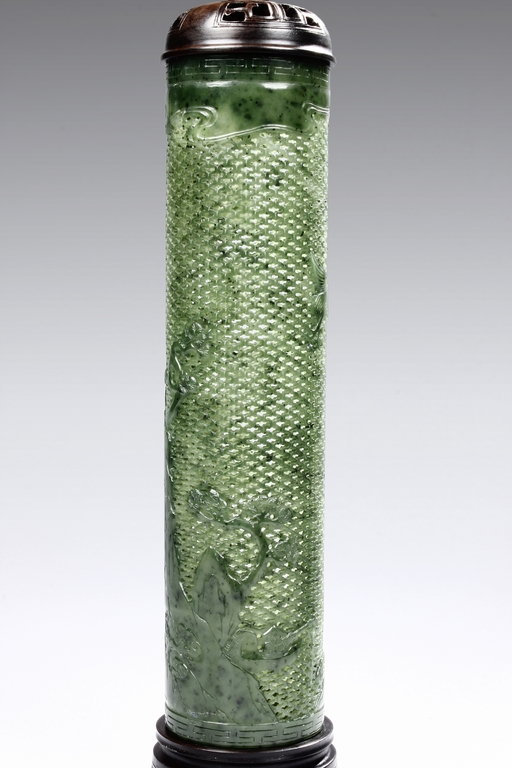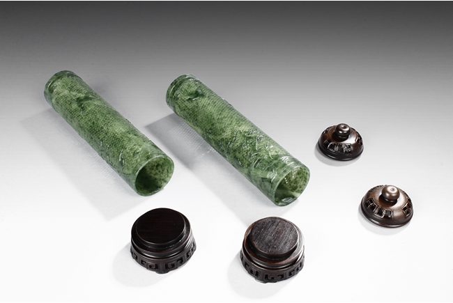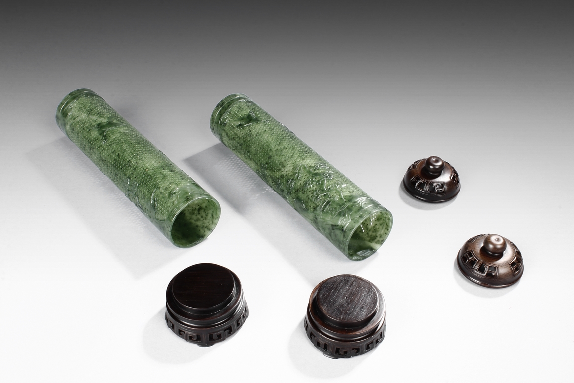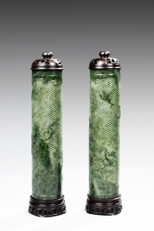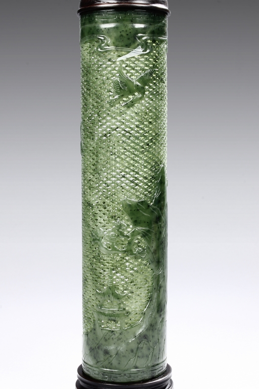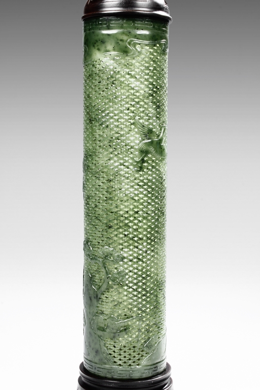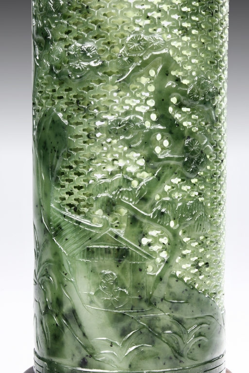 Each cylinder is finely carved and pieced in openwork to depict a landscape of cliff, pavilions, and pine trees. The river is cleverly represented by the elaborate and intertwined matrix. The exterior also depicts a carved crane flying toward the clouds decorated with a key-fret border. The cover and stand is of hardwood with openwork design.