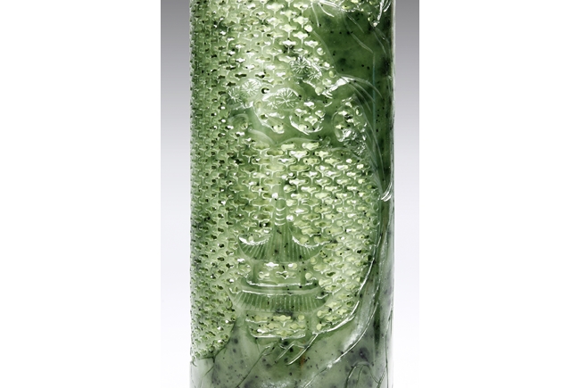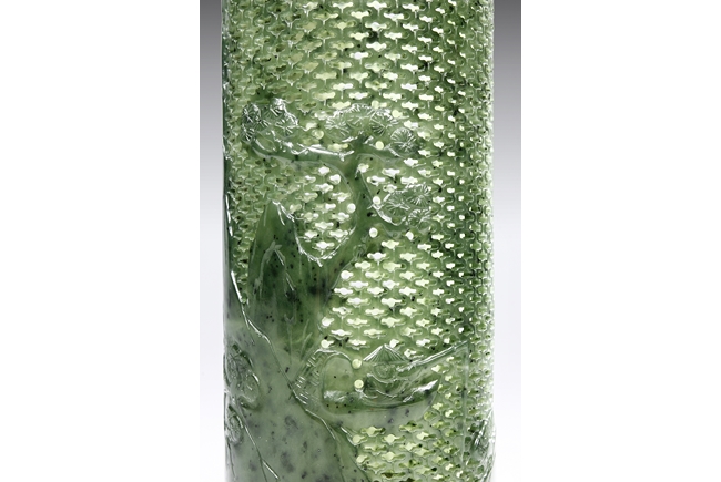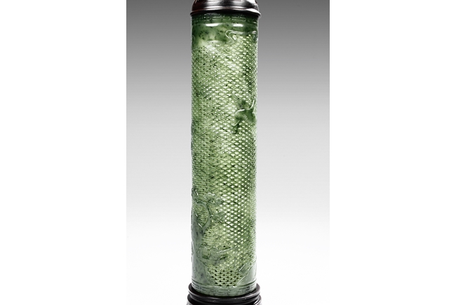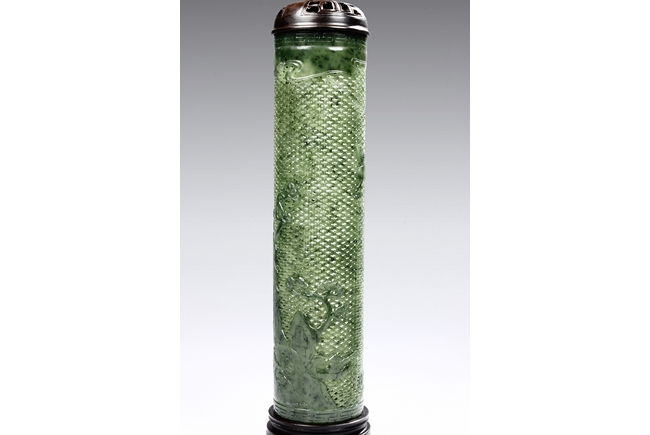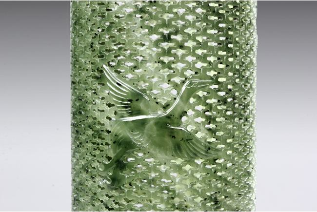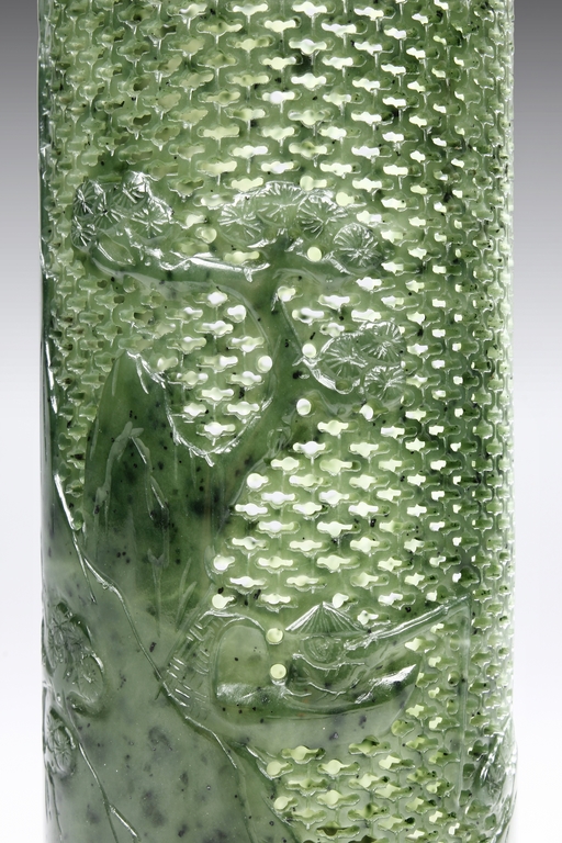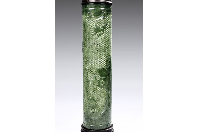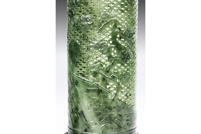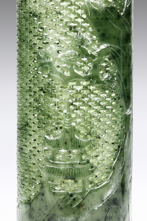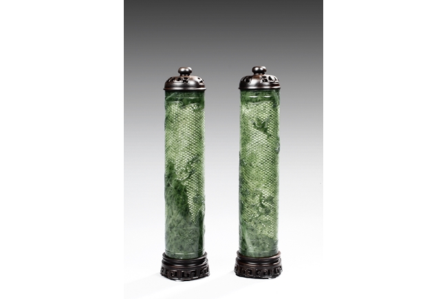 Each cylinder is finely carved and pieced in openwork to depict a landscape of cliff, pavilions, and pine trees. The river is cleverly represented by the elaborate and intertwined matrix. The exterior also depicts a carved crane flying toward the clouds decorated with a key-fret border. The cover and stand is of hardwood with openwork design.