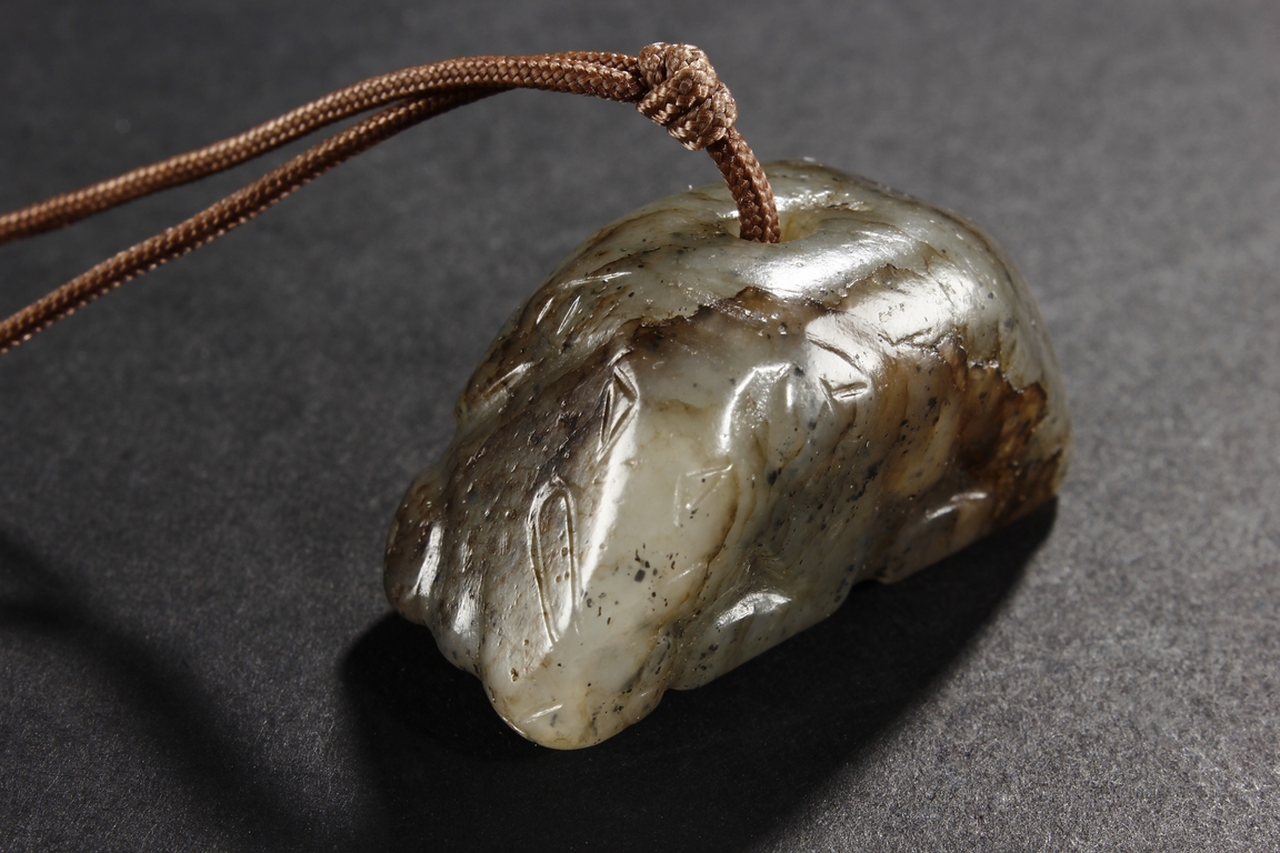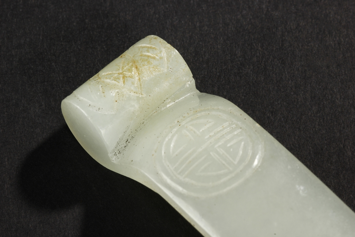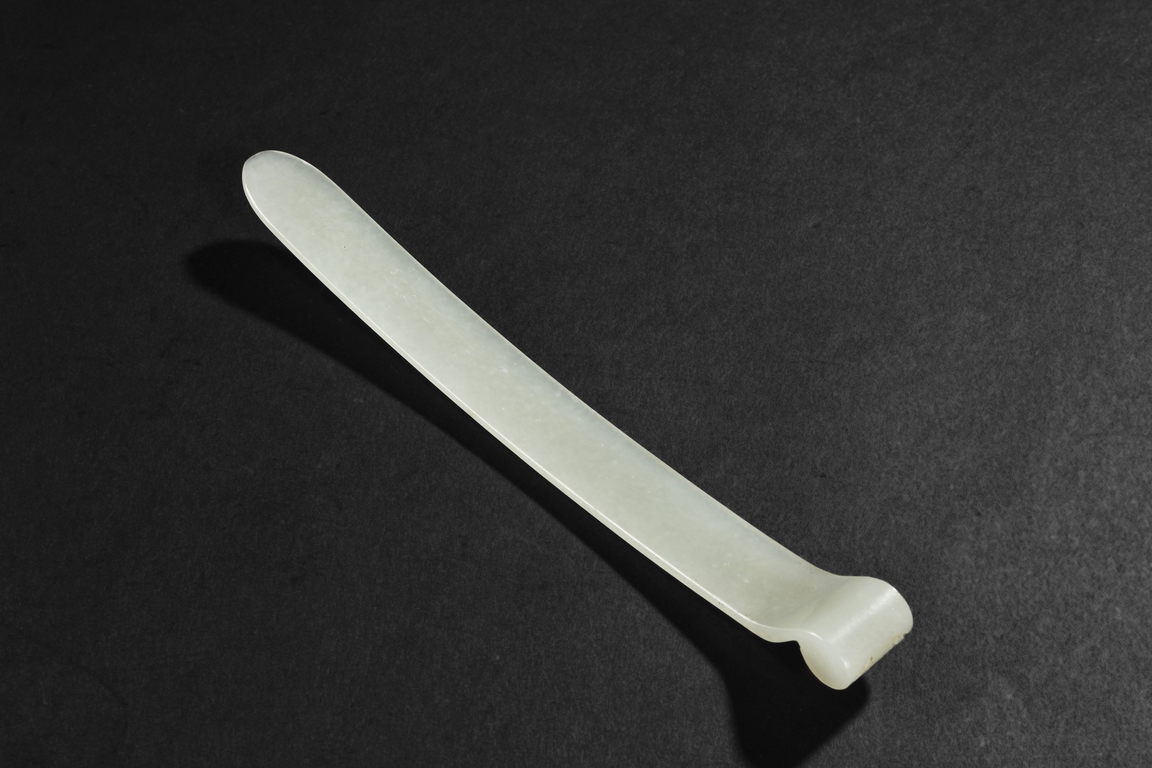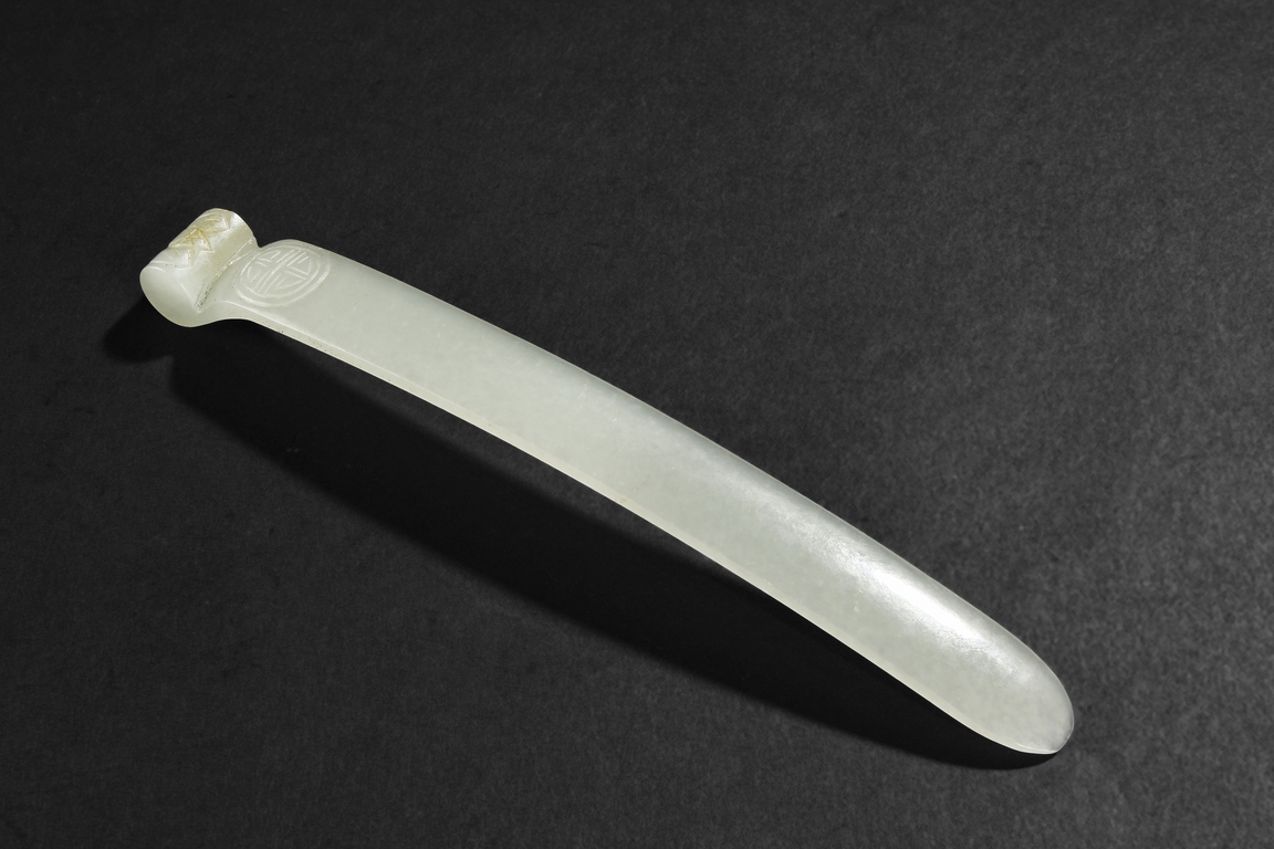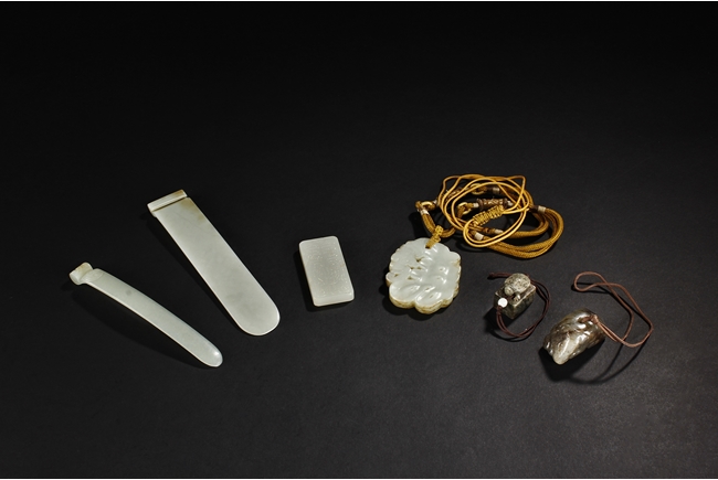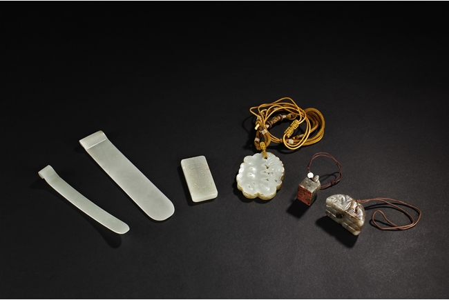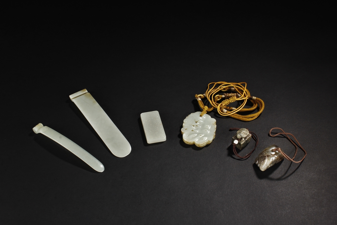 The group consists of six different jade carvings, including a white jade carved pendant, a rectangular white jade pendant, two white jade shoehorns, a celadon jade carved beast stamp seal, and a celadon jade carved mythical beast figure.