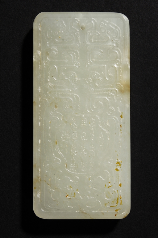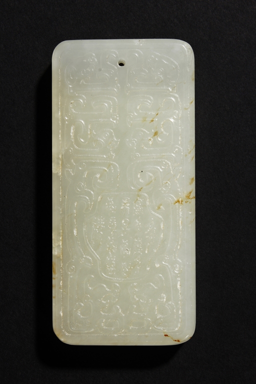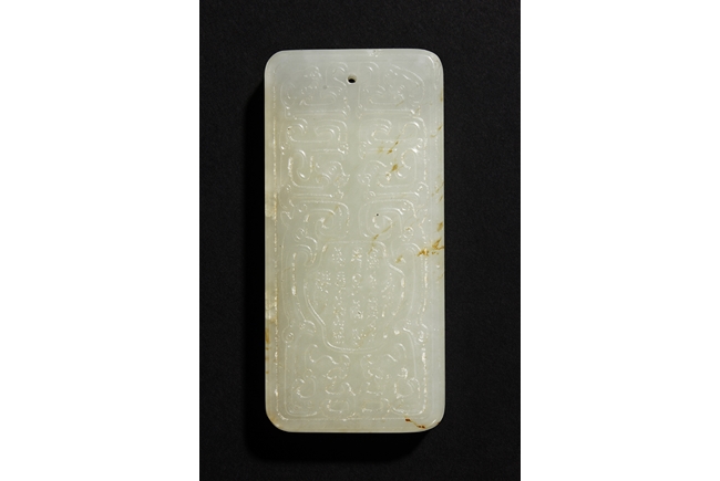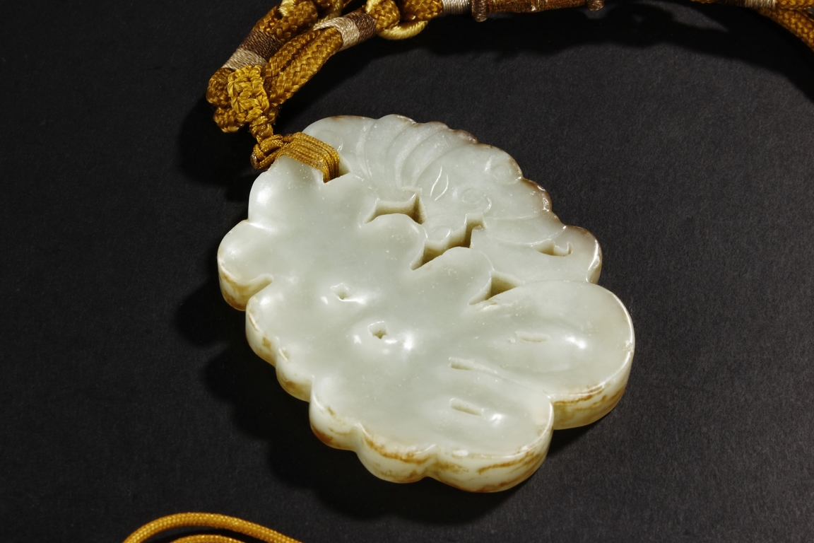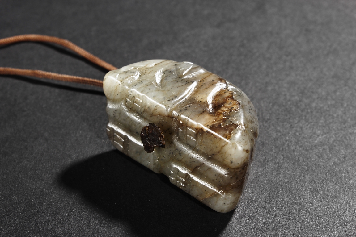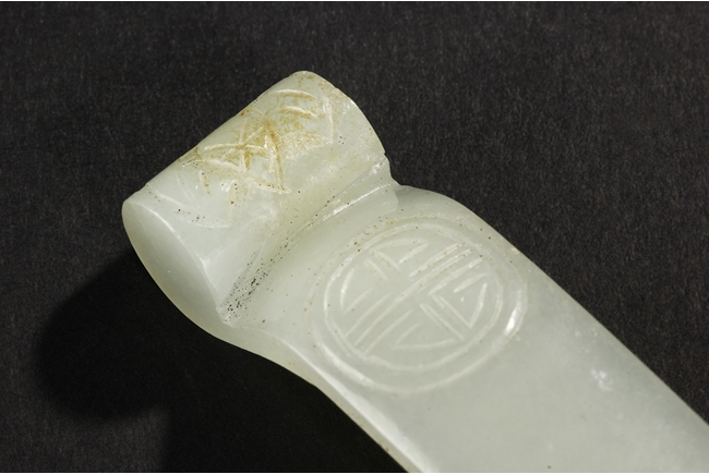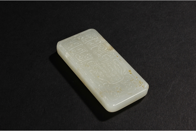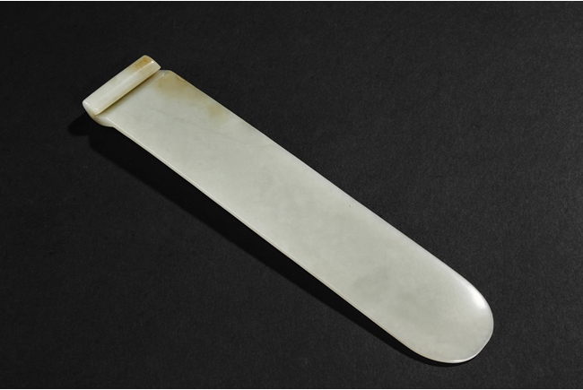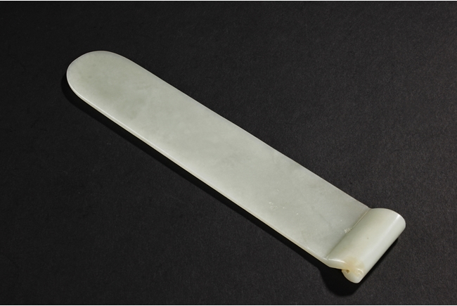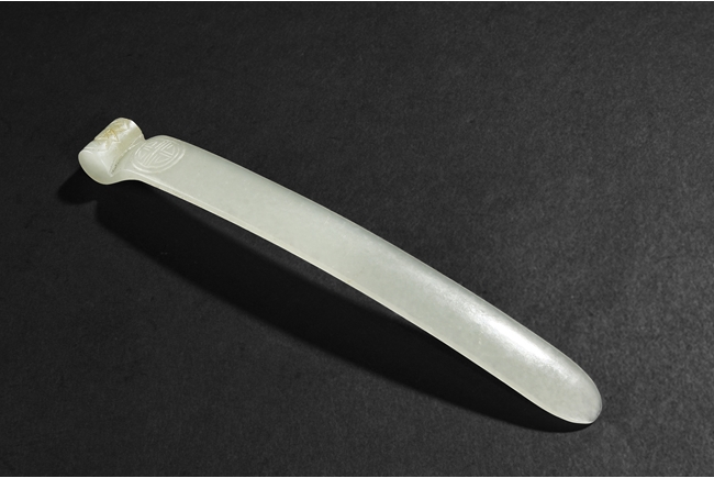 The group consists of six different jade carvings, including a white jade carved pendant, a rectangular white jade pendant, two white jade shoehorns, a celadon jade carved beast stamp seal, and a celadon jade carved mythical beast figure.