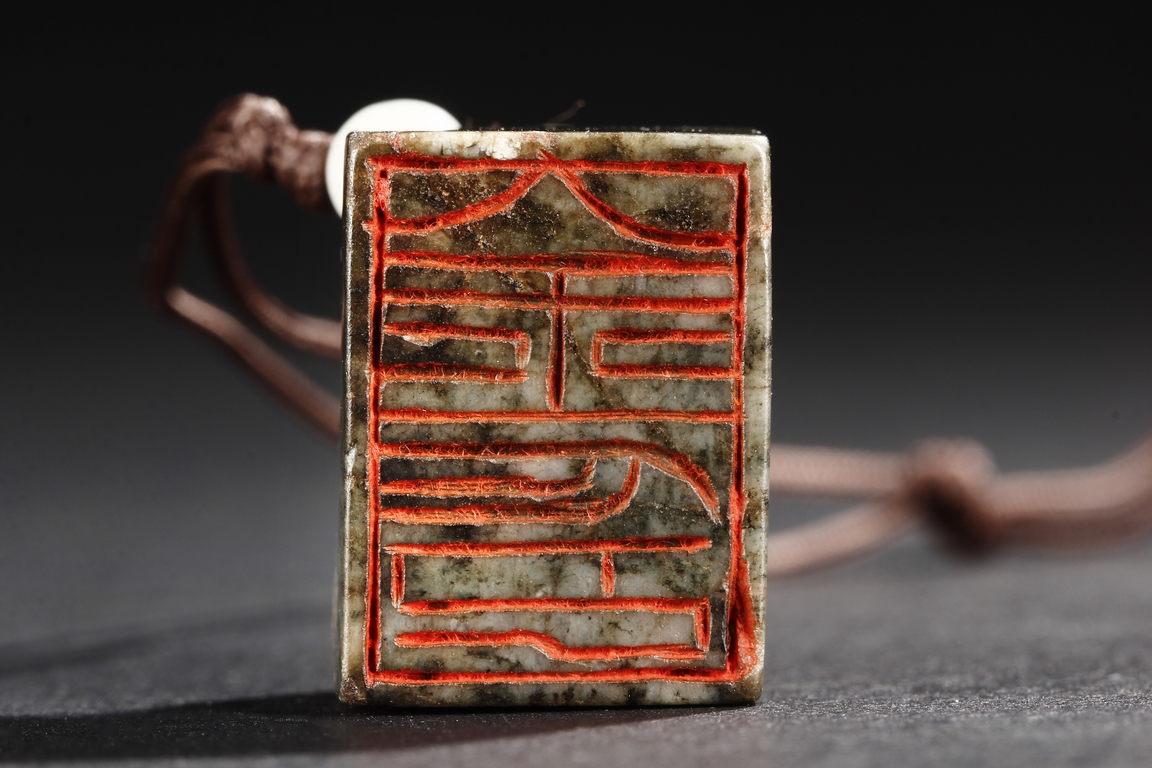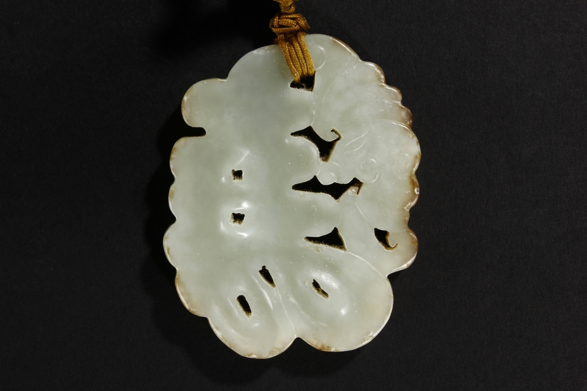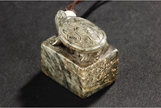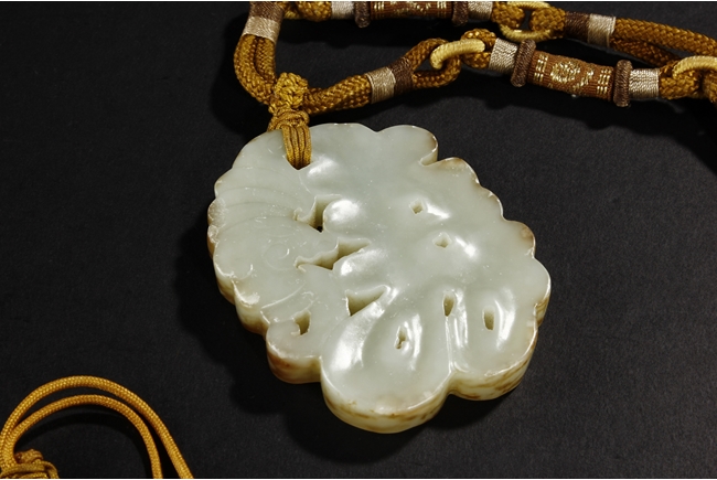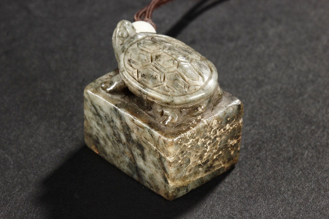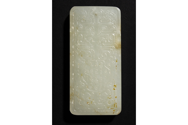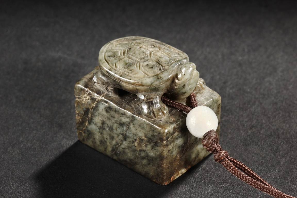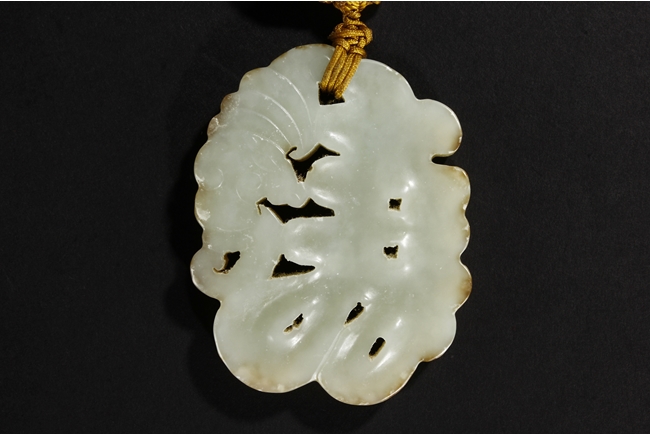 The group consists of six different jade carvings, including a white jade carved pendant, a rectangular white jade pendant, two white jade shoehorns, a celadon jade carved beast stamp seal, and a celadon jade carved mythical beast figure.