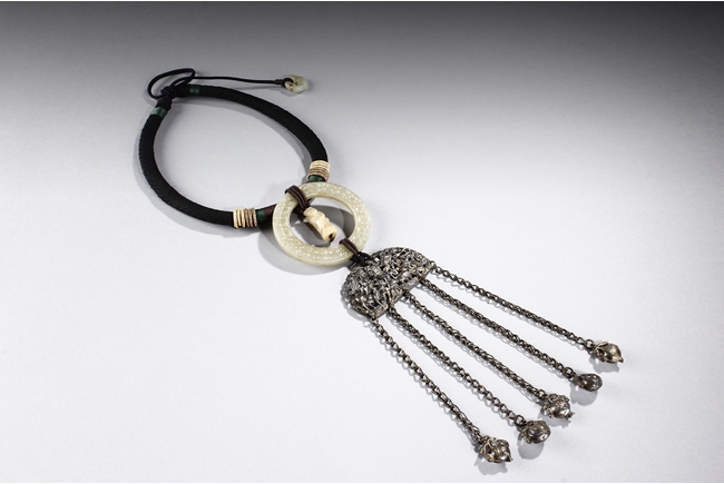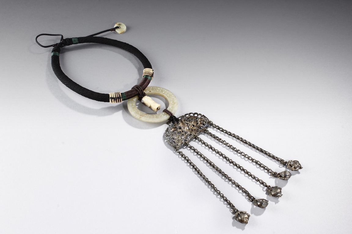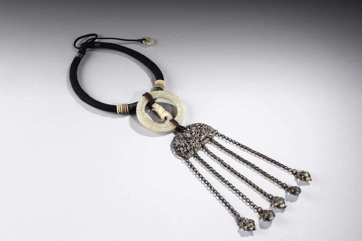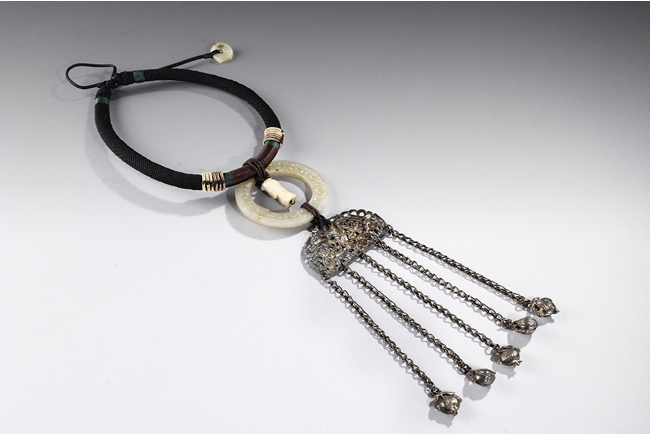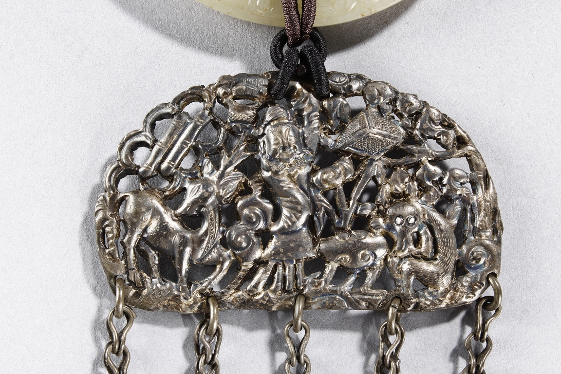 This necklace consists of a white jade disc decorated with scrolling cloud motif, a small jade carved figure wearing a long robe, a silver openwork pendant depicting a deity with celestial animals above the clouds, with five silver chain strands hanging on the bottom. Qing Dynasty period.