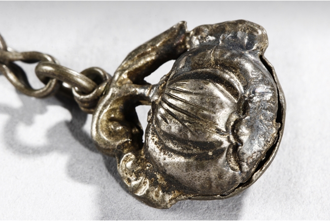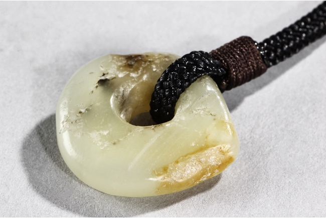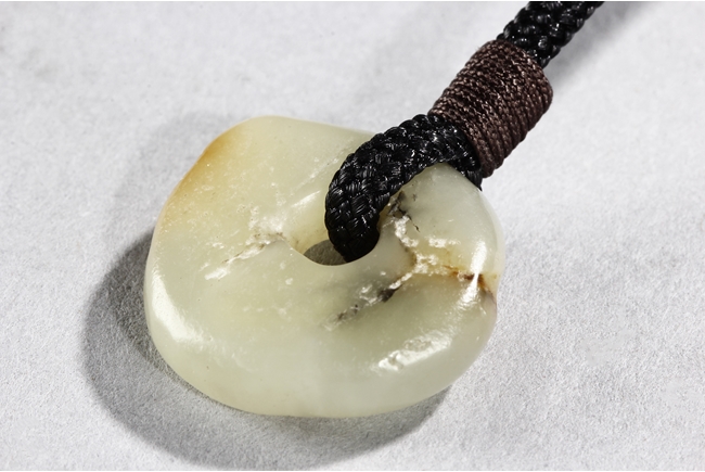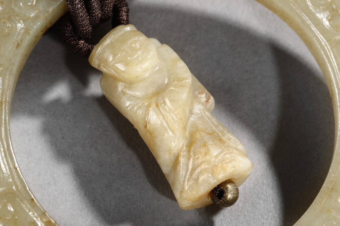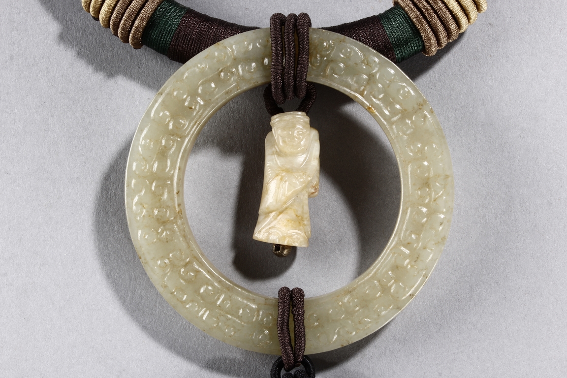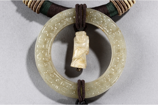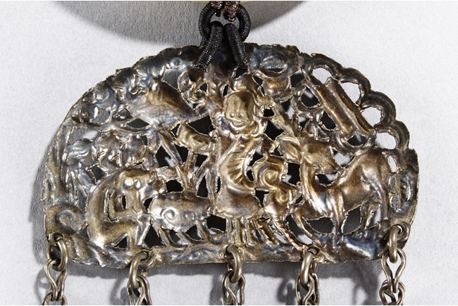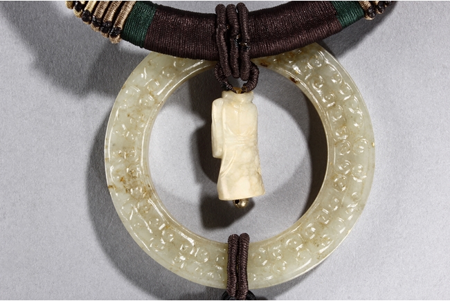 This necklace consists of a white jade disc decorated with scrolling cloud motif, a small jade carved figure wearing a long robe, a silver openwork pendant depicting a deity with celestial animals above the clouds, with five silver chain strands hanging on the bottom. Qing Dynasty period.